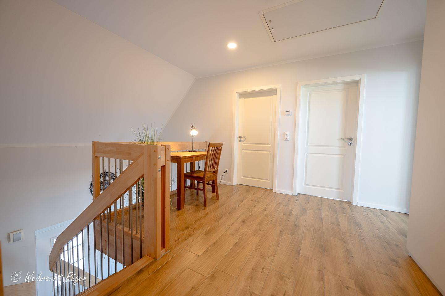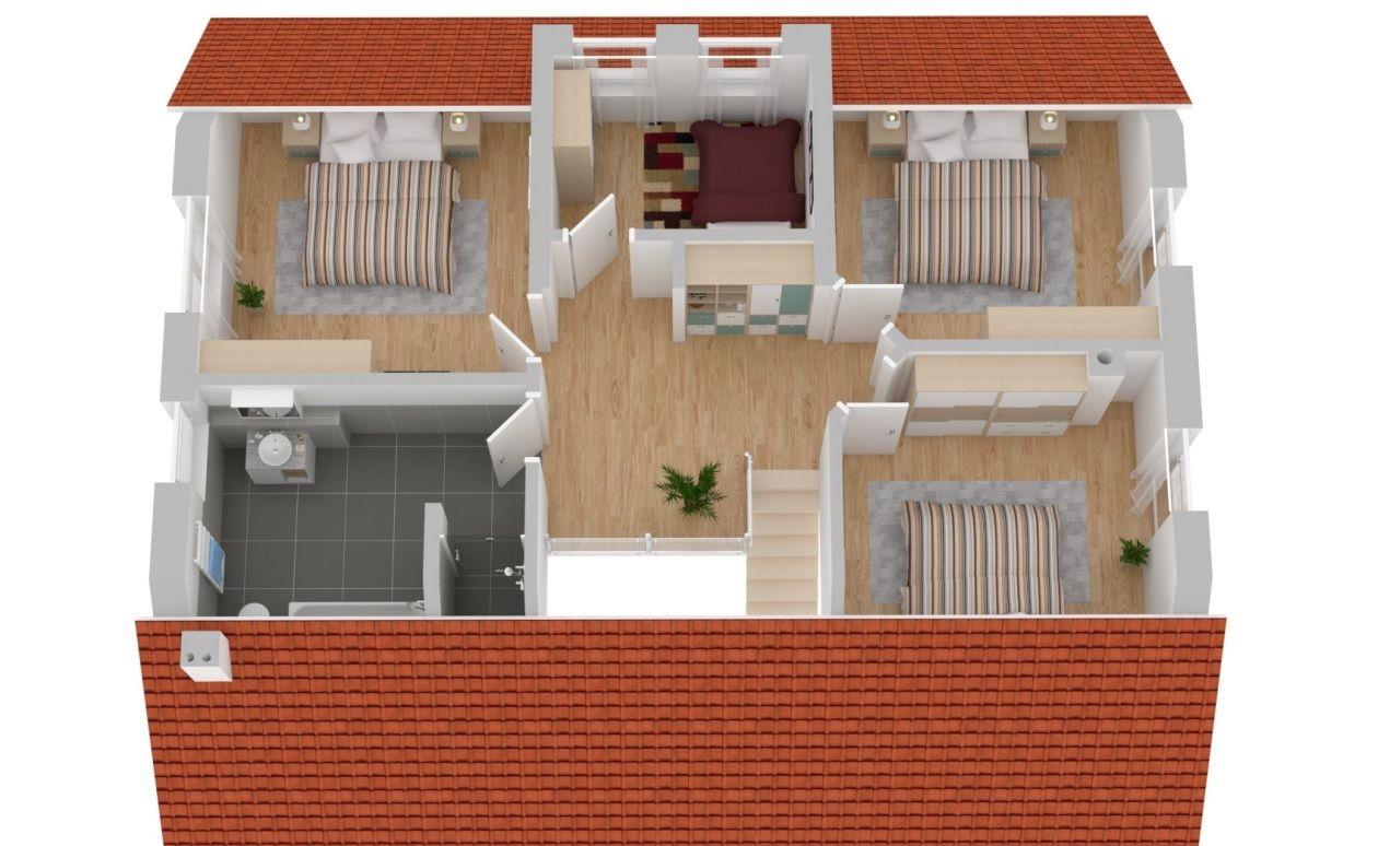 Im Dachgeschoss sind die 4 Schlafzimmer untergebracht. Die 3 großen Schlafzimmer verfügen jeweils über 1 Doppelbett. Das kleine Schlafzimmer ist mit dem ausziehbaren Kojenbett als gemütlicher Schlaf- und Rückzugsort für Ihre Kinder gedacht. Das Tageslichtbad verfügt über Badewanne, Dusche und Doppelwaschtisch.