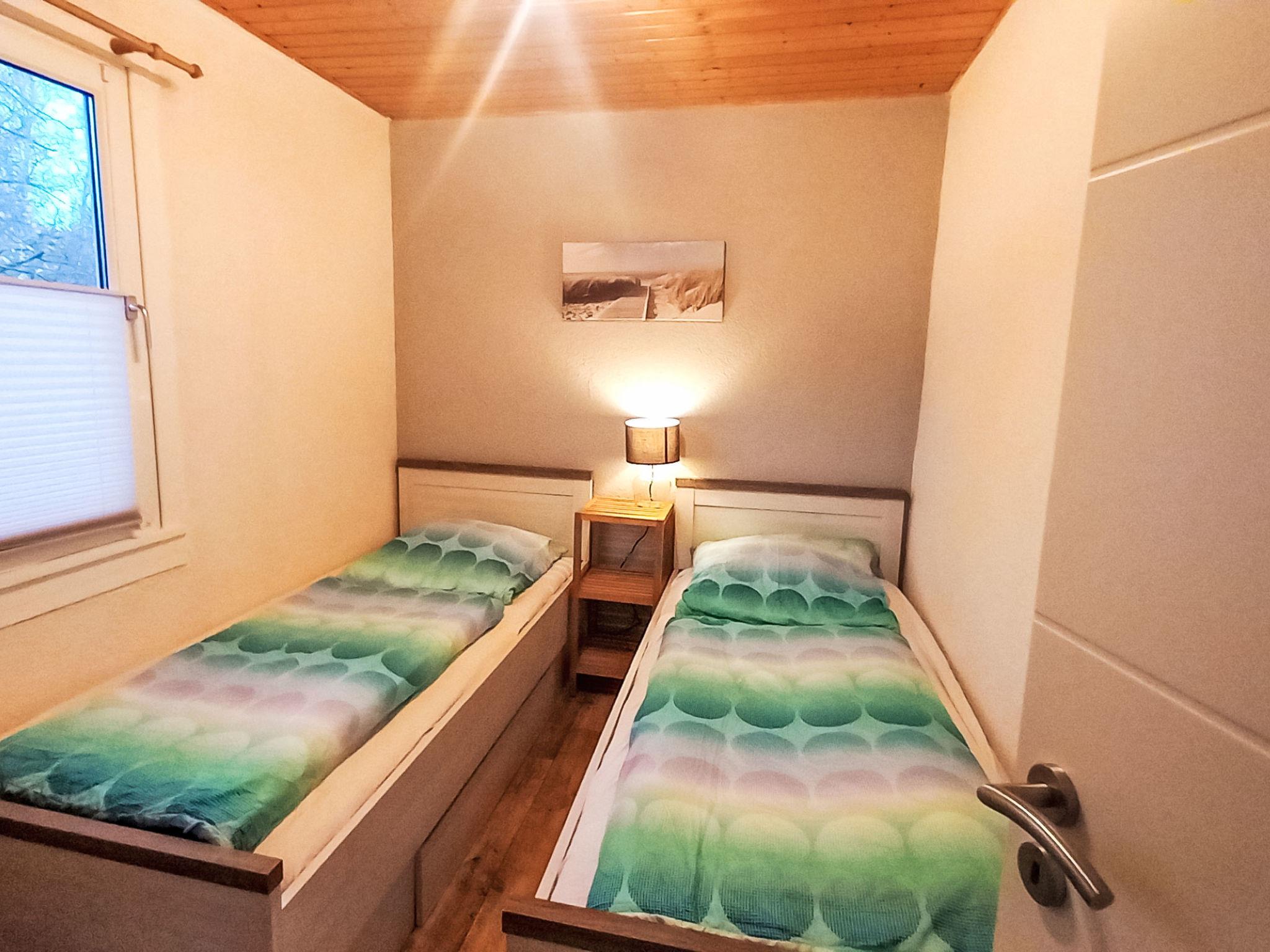 "Bungalow 33", 3-Zimmer-Haus 40 m2, im Erdgeschoss. Renoviert im Jahre 2025, schön und gemütlich eingerichtet: offenes Wohnzimmer mit Sat-TV (Flachbildschirm). Ausgang zur Terrasse. 1 Zimmer mit 2 Betten (100 cm, Länge 200 cm). 1 Zimmer mit 1 franz. Bett (160 cm, Länge 200 cm). Kochnische (4 Kochplatten, Mini-Backofen, Backofen, Toaster, Wasserkocher, elektrische Kaffeemaschine). Dusche/WC. E-Heizung. Terrasse überdacht, grosser Garten 150 m2. Terrassenmöbel, Gartengrill. Zur Verfügung: Internet (WLAN, gratis). Parkplatz (1 Auto) beim Haus. Bitte beachten: geeignet für Familien. Nichtraucher-Haus. Rauchmelder.