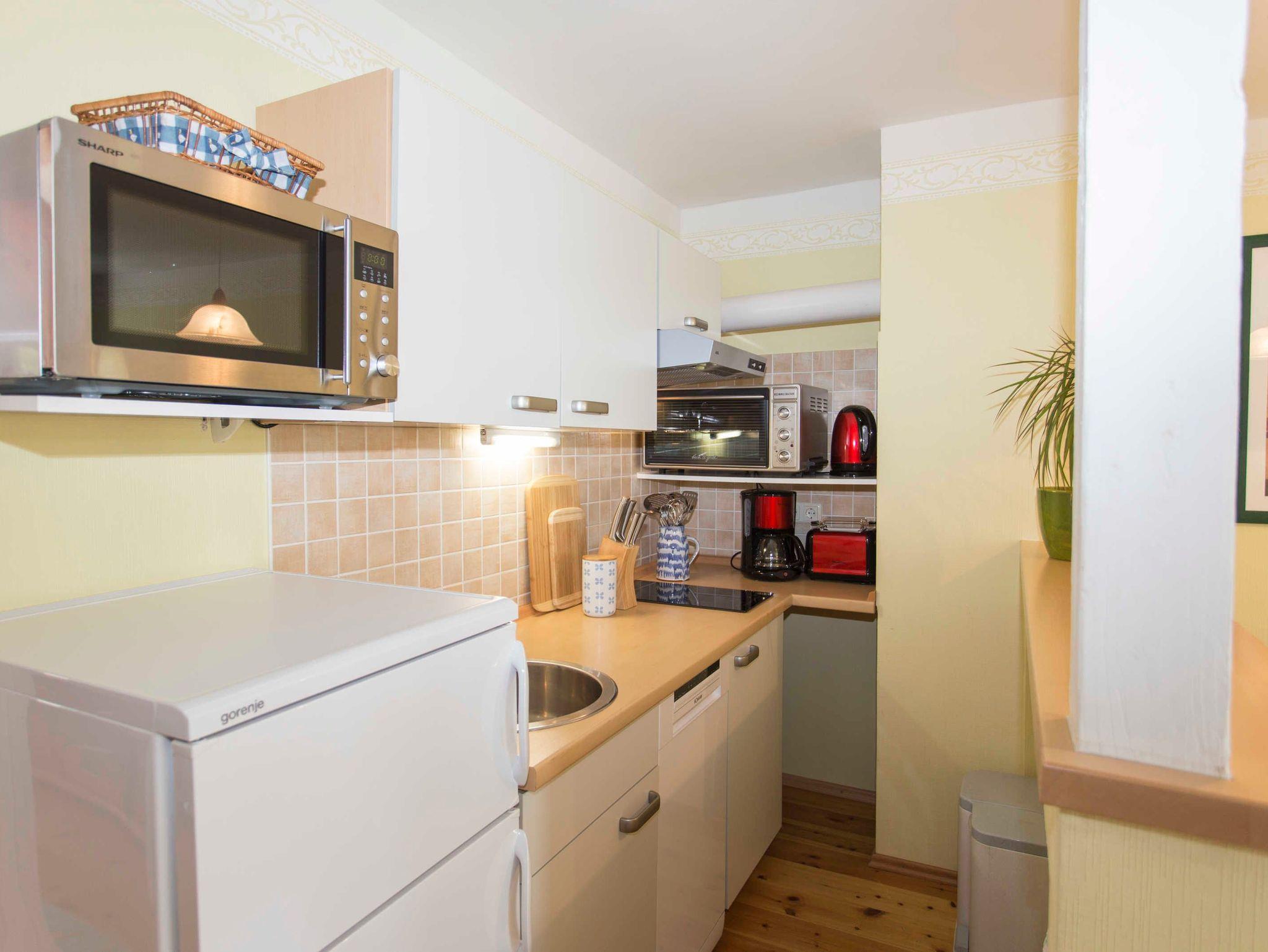 - separate, moderne Küchenzeile mit Spülmaschine, Mikrowelle, Cerankochfeld, Backofen, Kühlschrank, Gefrierschrank, Wasserkocher, Kaffeemaschine, Toaster