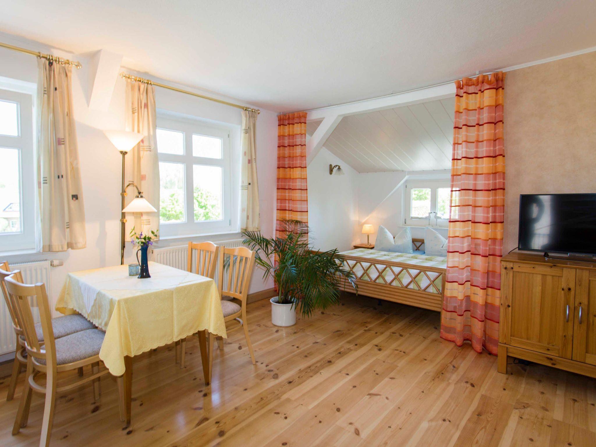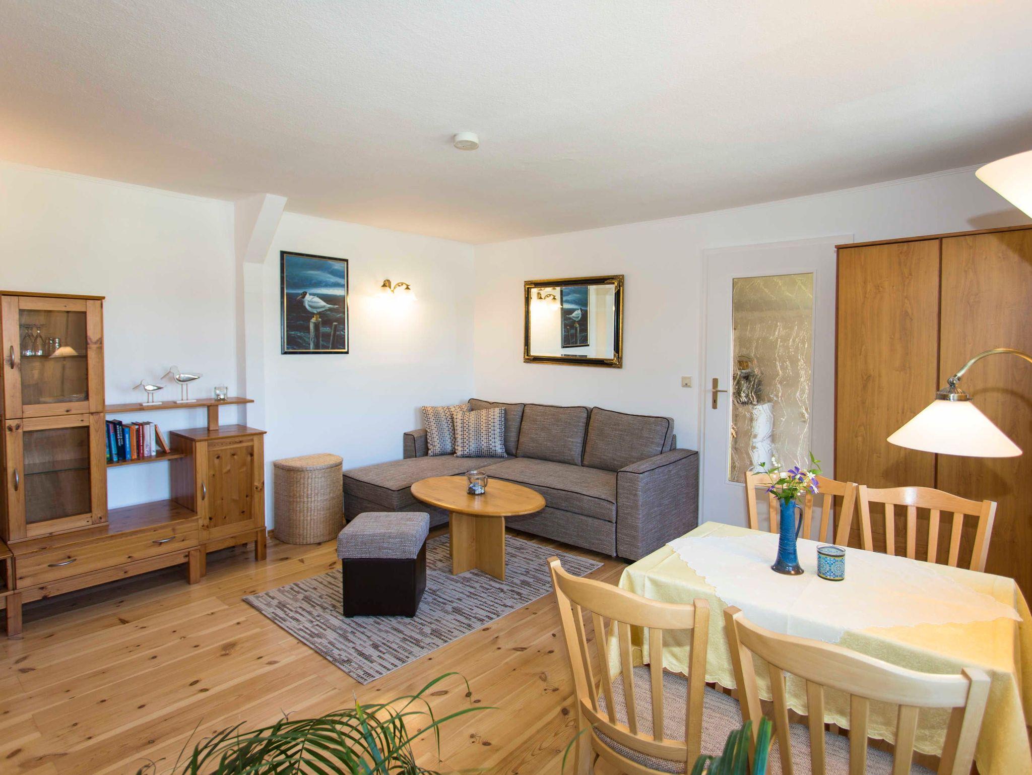 Die Ferienwohnung Lachmöwe ist eine Nichtraucherwohnung und verfügt über einen separaten Eingang, einen kleinen Balkon, ein großes Wohnzimmer mit gemütlicher Sitzecke und abgetrenntem Ehebett und ein separater Schlafraum für eine Person.