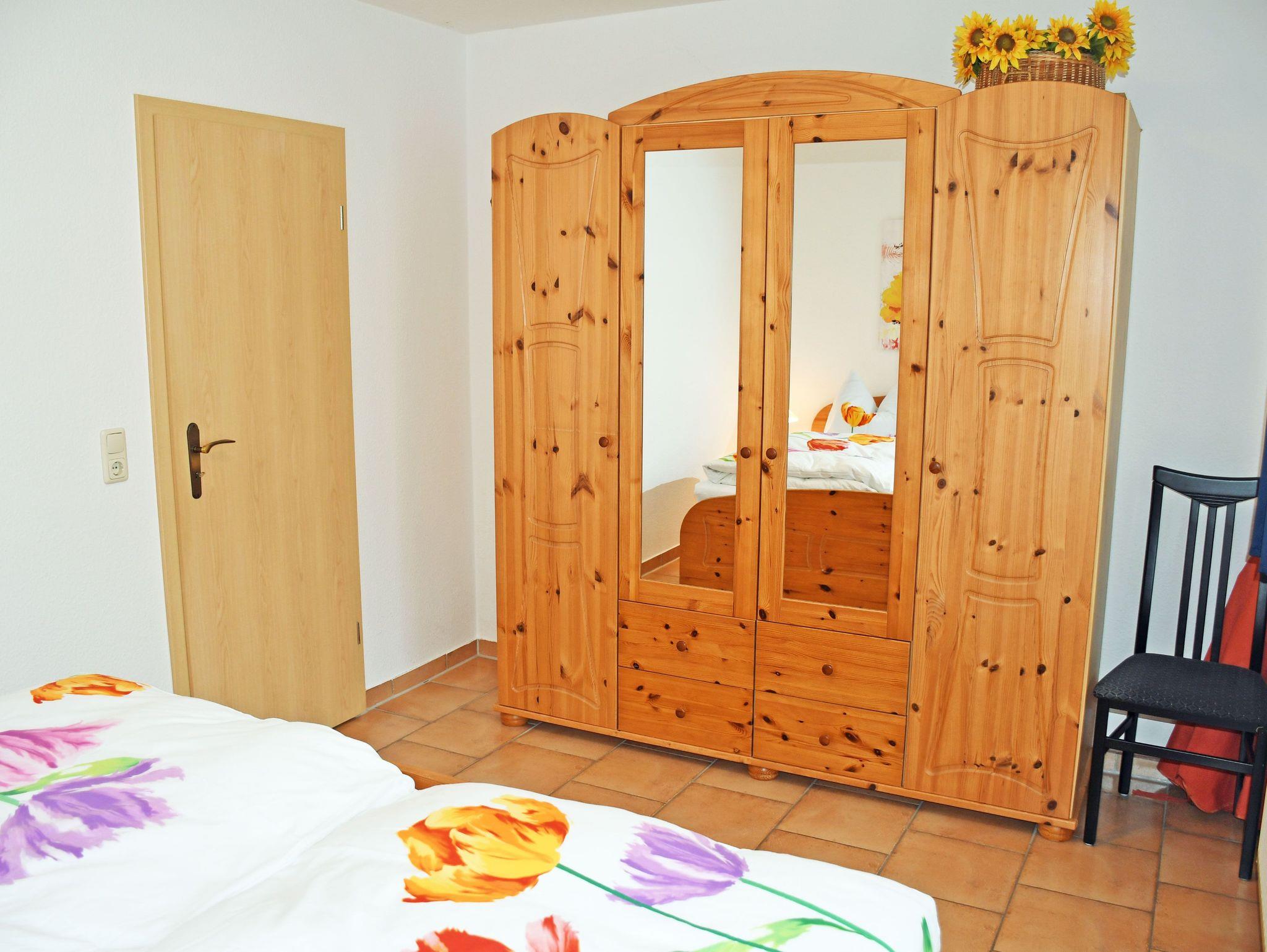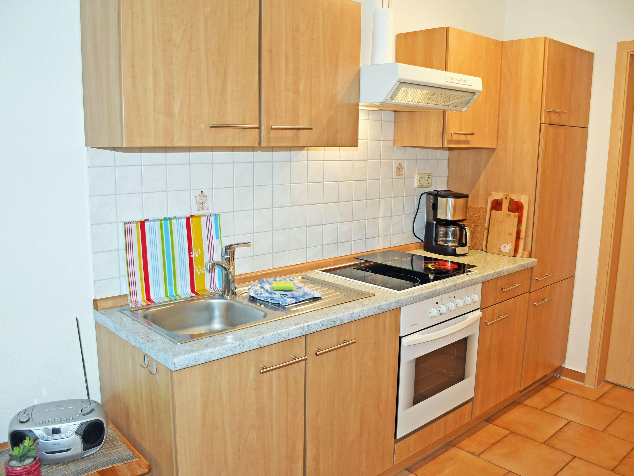 Auf der vor den Wohnungen liegenden Sonnenterrasse mit Gartenmöbeln können Sie die Sonne genießen oder bei einem Gläschen Wein entspannen. Die moderne Küchenzeile ist mit einem Cerankochfeld, Abzugshaube, Backofen, Wasserkocher, Kaffeemaschine, Toaster und Kühlschrank komplett ausgestattet. Das Schlafzimmer ist mit einem bequemen Doppelbett, Nachttischen und Leselampen sowie einem Kleiderschrank ausgestattet. Ein Kinderreisebett und Hochstuhl können auf Wunsch gern bereitgestellt werden. Auf Wunsch sind gegen Aufpreis bei Ihrer Anreise die Betten mir Bettwäsche bezogen und es liegen frische Handtücher bereit, bitte dann mitbuchen! Das moderne und helle Bad ist mit Dusche, WC, Fön und Waschtisch ausgestattet und verfügt über Tageslicht.