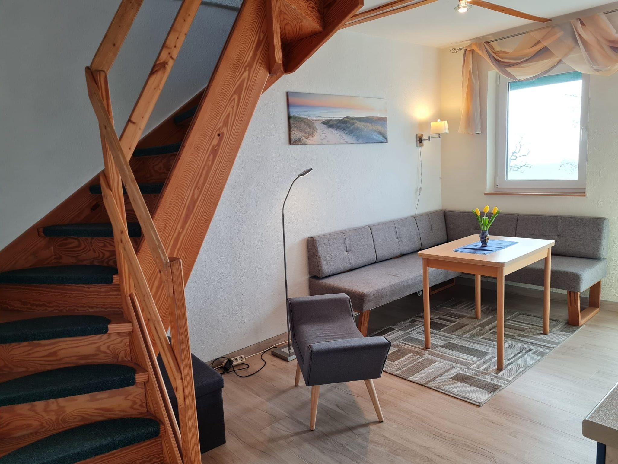 Diese schöne Ferienwohnung im reetgedeckten Ferienhaus Mönchgutperle mit allem Komfort auf ca. 55 qm erwartet Sie in der 1. Etage und hat zusätzlich einen riesigen Balkon mit einem herrlichen Seeblick. Ihre Ferienwohnung erstreckt sich über 2 Etagen und bietet eine komplett eingerichtete Wohnküche mit LCD- TV sowie ein Badezimmer mit Dusche. Ein Föhn ist auch vorhanden. Über eine Treppe gelangen Sie zu den beiden Schlafzimmern, die mit Doppelbetten ausgestattet sind.