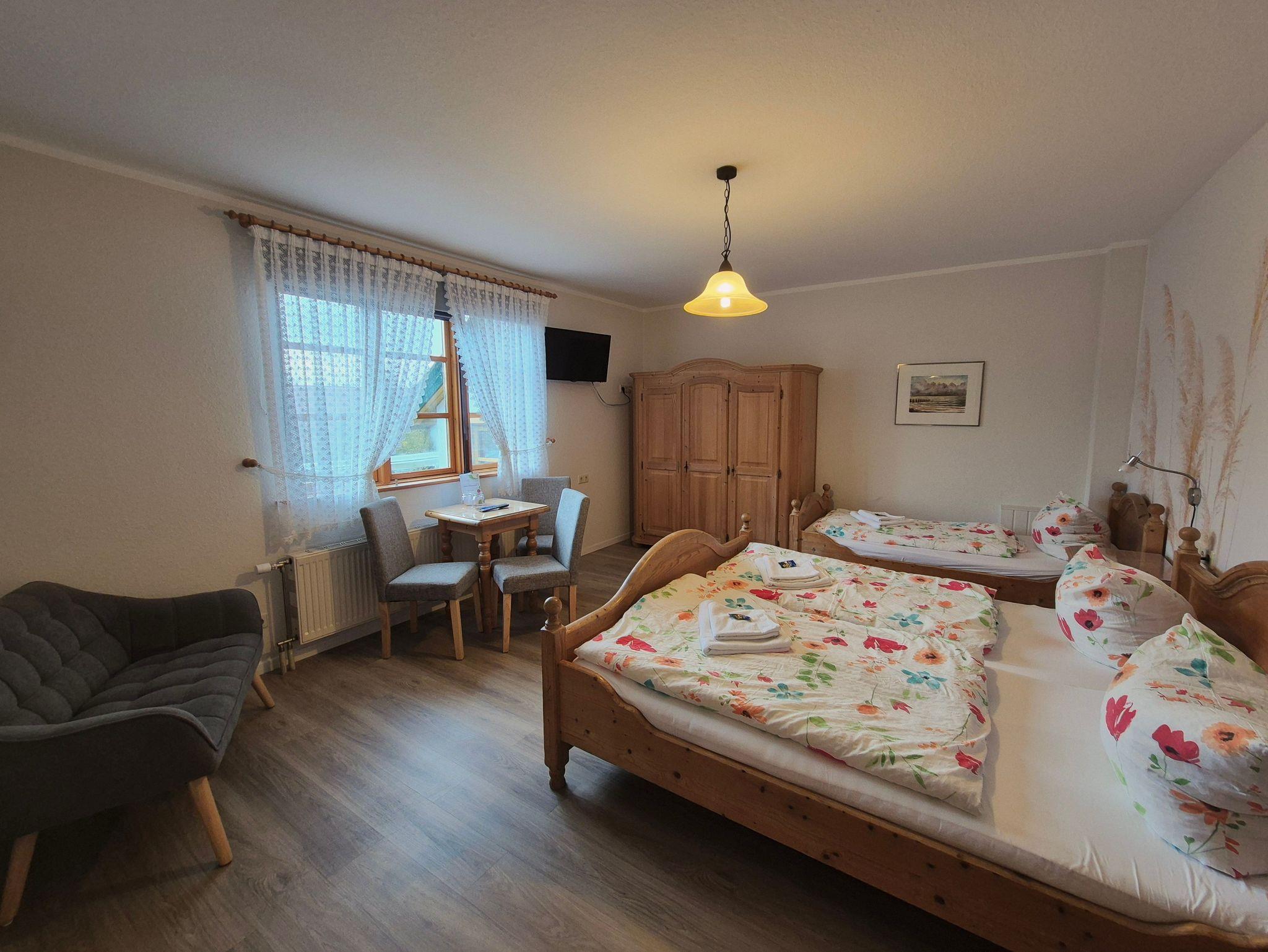 Gemütliches Dreibettzimmer in reetgedeckter Pension mit Garten und Wintergarten bei Middelhagen.