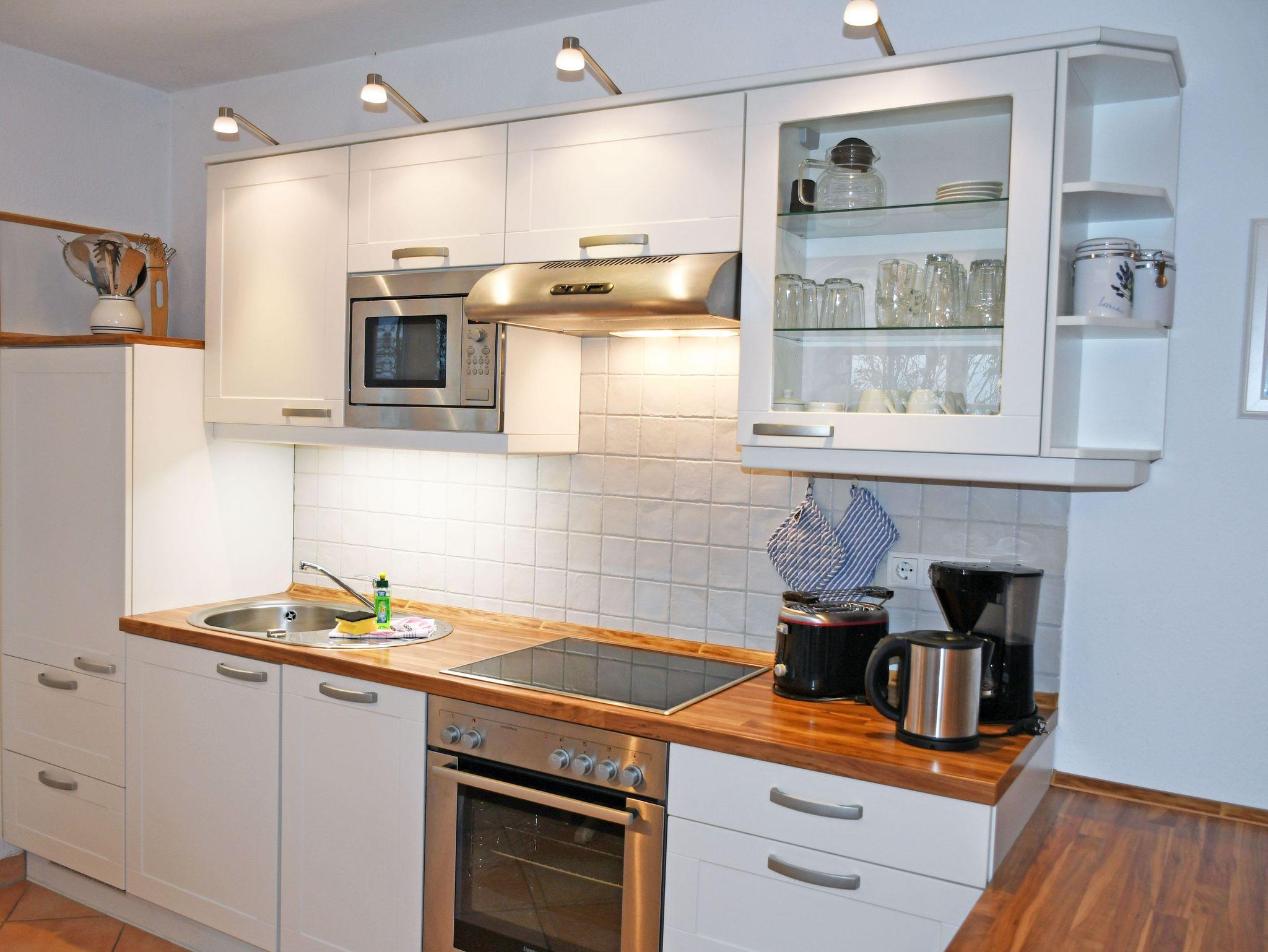 - Küchenzeile mit Ceranfeldherd, Backofen, Abzugshaube, Wasserkocher, Geschirrspüler, Kaffeemaschine, Toaster, Kühlschrank mit Gefrierfach