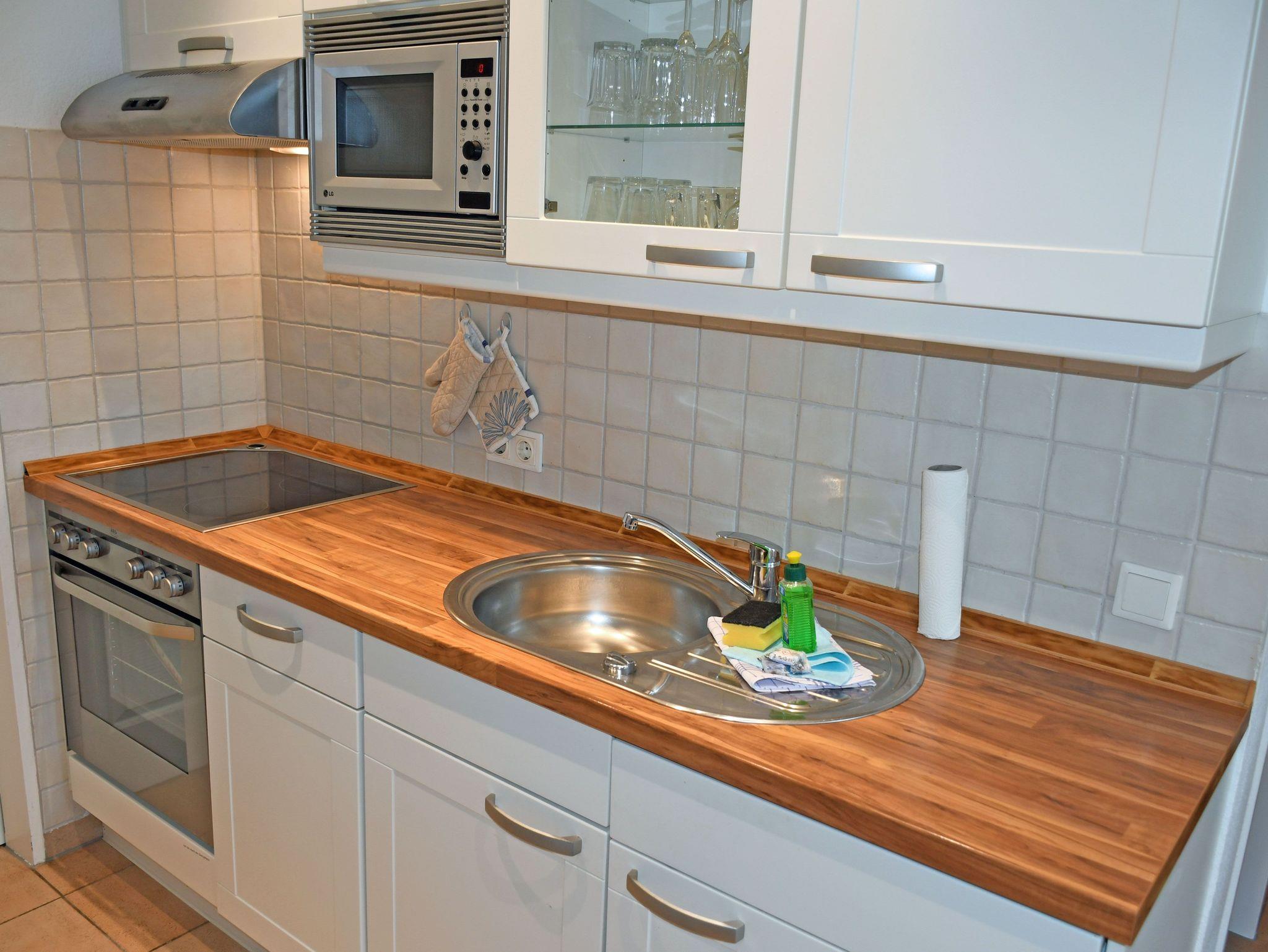 - Küchenzeile mit Ceranfeldherd, Backofen, Abzugshaube, Wasserkocher, Geschirrspüler, Kaffeemaschine, Toaster, Kühlschrank mit Gefrierfach