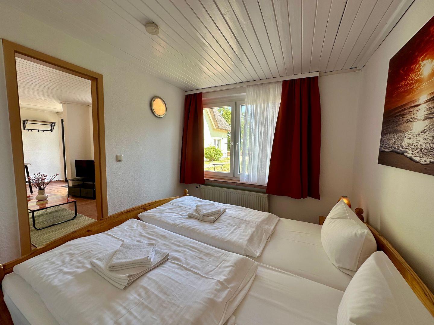 Ferienwohnung 9 befindet sich im Erdgeschoss des Anbaus, in unmittelbarer Nähe zur Badestelle am Bodden. Kostenlose Parkplätze stehen direkt auf dem Grundstück zur Verfügung. Auch Angler und Naturliebhaber kommen in dieser strandnahen, ruhigen Lage voll auf ihre Kosten.