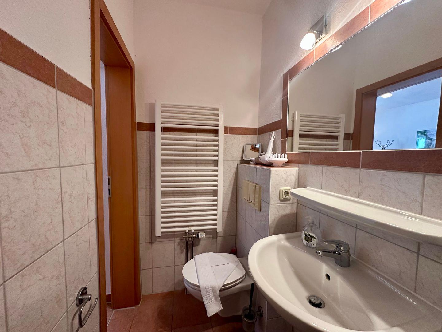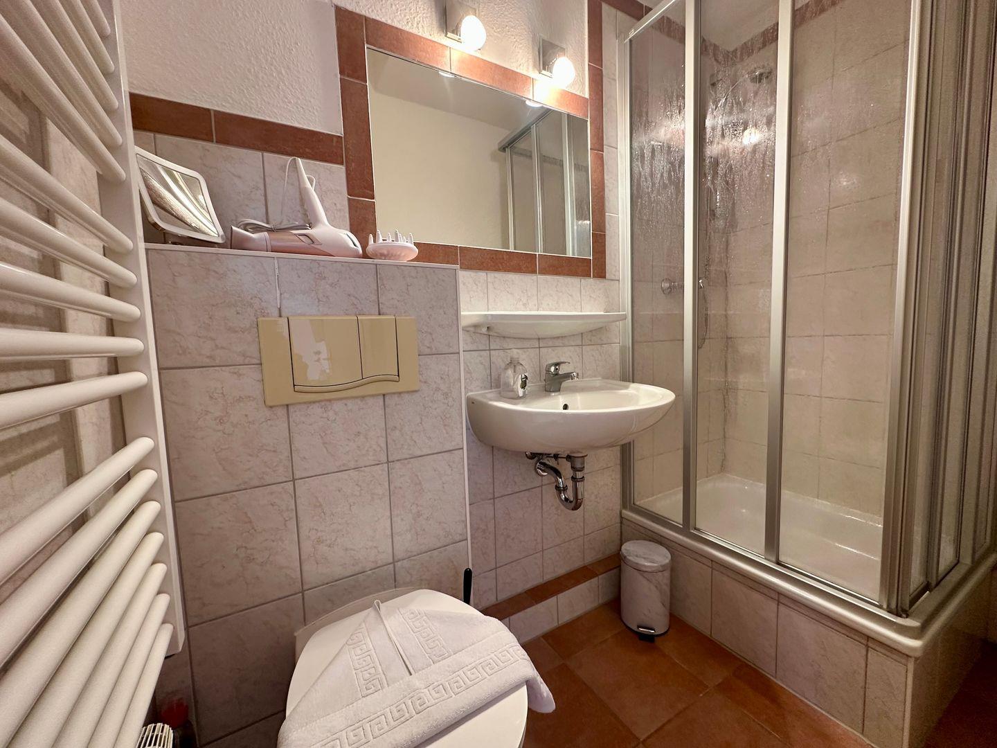 Das Badezimmer verfügt über eine Dusche, Waschbecken und WC. Es ist kompakt, funktional und mit Handtüchern ausgestattet.