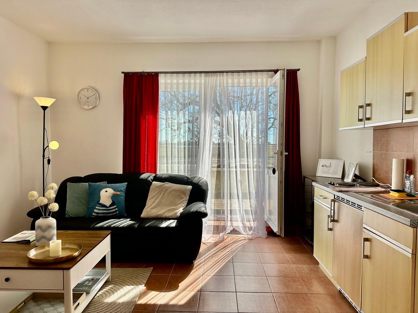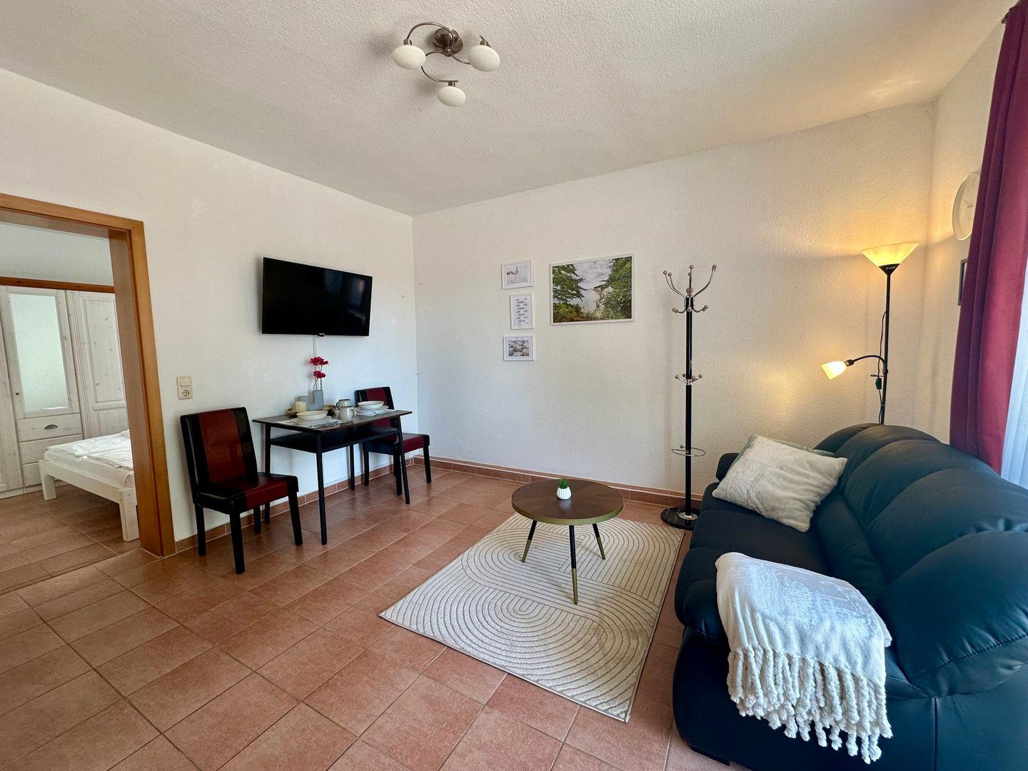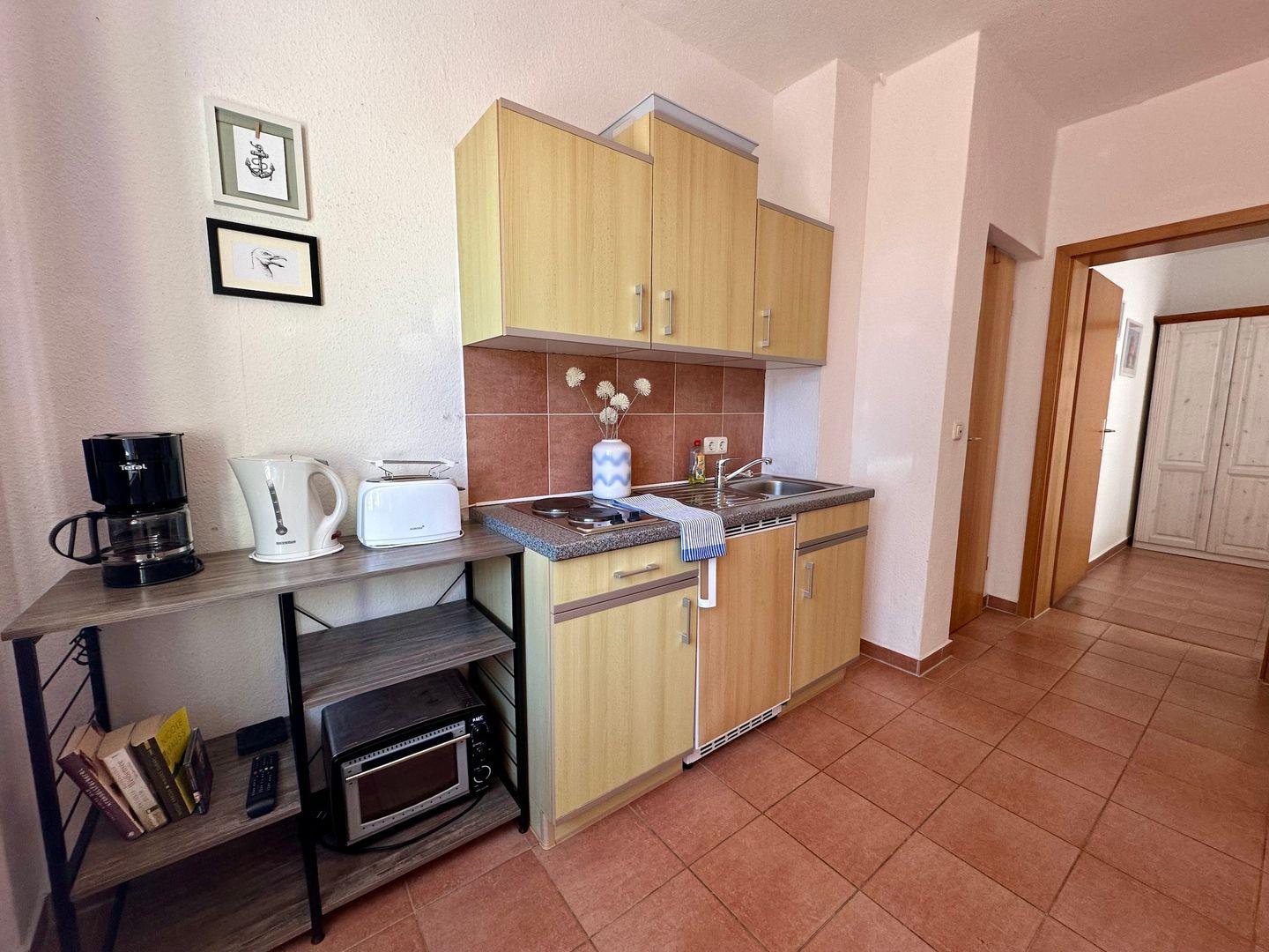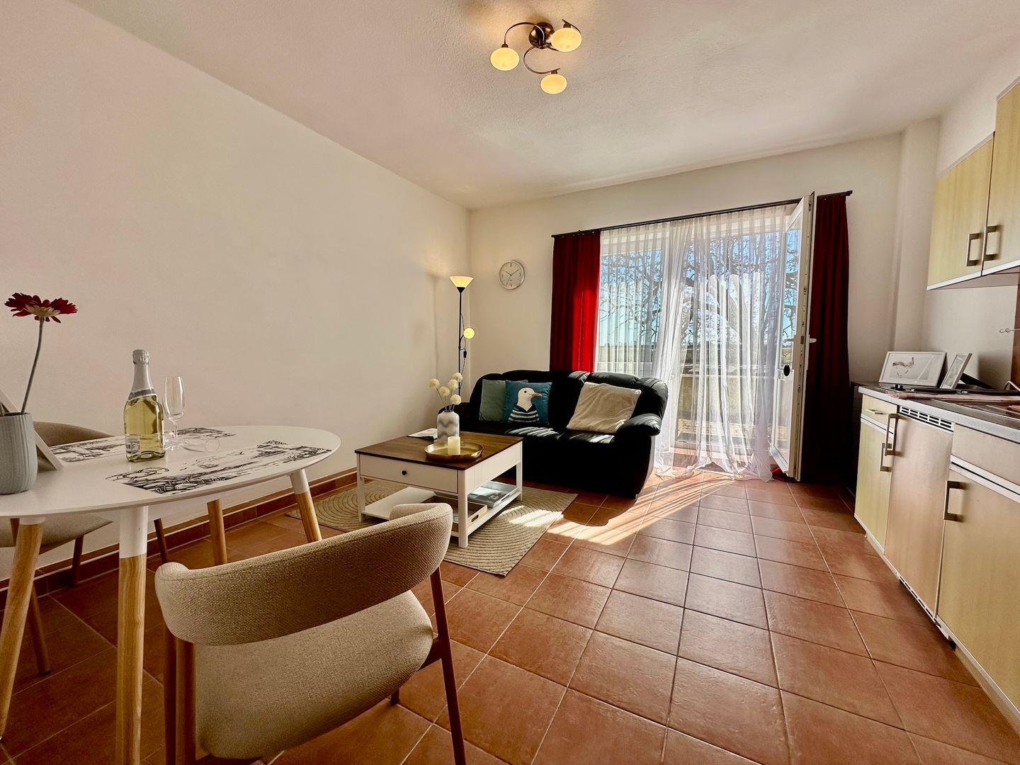 Im Wohnbereich sorgen eine bequeme Sitzecke, ein kleiner Esstisch und der Flachbildfernseher mit Digitalempfang für entspannte Stunden – sei es bei einem Buch, einem Glas Wein oder beim Frühstück. Die Küchenzeile ist funktional ausgestattet: Herdplatte, Kühlschrank, Toaster, Wasserkocher, sowie Kochgeschirr, Besteck und Geschirr stehen zur Verfügung.