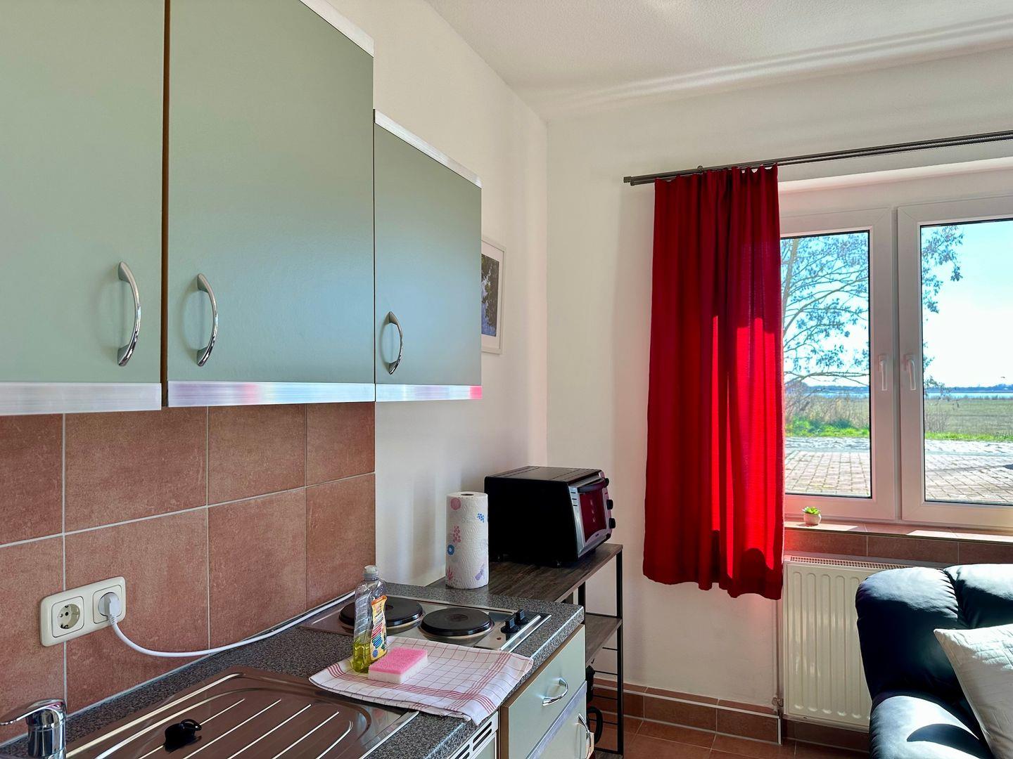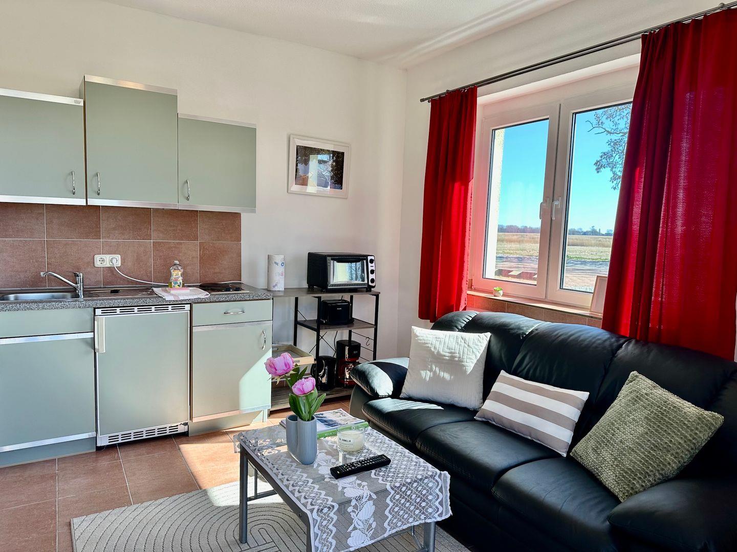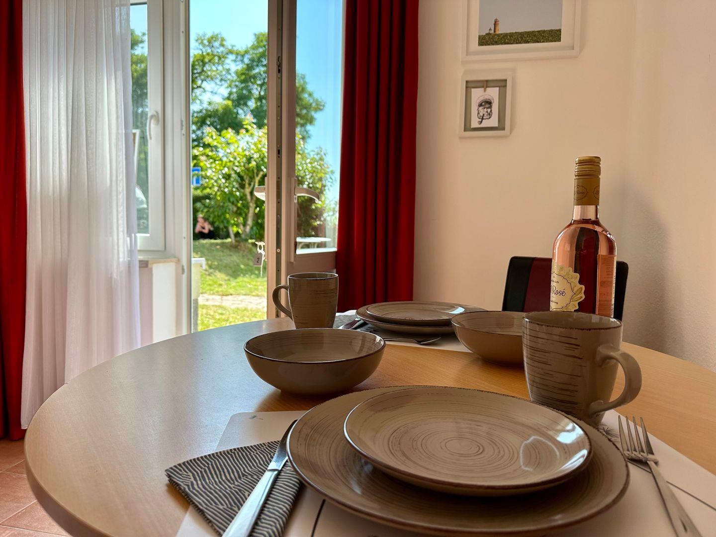 Diese helle und kompakte Erdgeschosswohnung bietet auf 33?m² alles, was Paare oder Alleinreisende für eine entspannte Auszeit an der Hagenschen Wiek brauchen. Die Wohnung verfügt über ein separates Schlafzimmer mit einem großzügigen Doppelbett (180x200?cm), einen gemütlichen Wohnbereich mit Sitzecke, Essplatz und TV sowie eine voll ausgestattete Küche. Das Highlight: die eigene kleine Terrasse mit Gartenblick – ideal für Frühstück im Freien oder entspannte Abendstunden.
