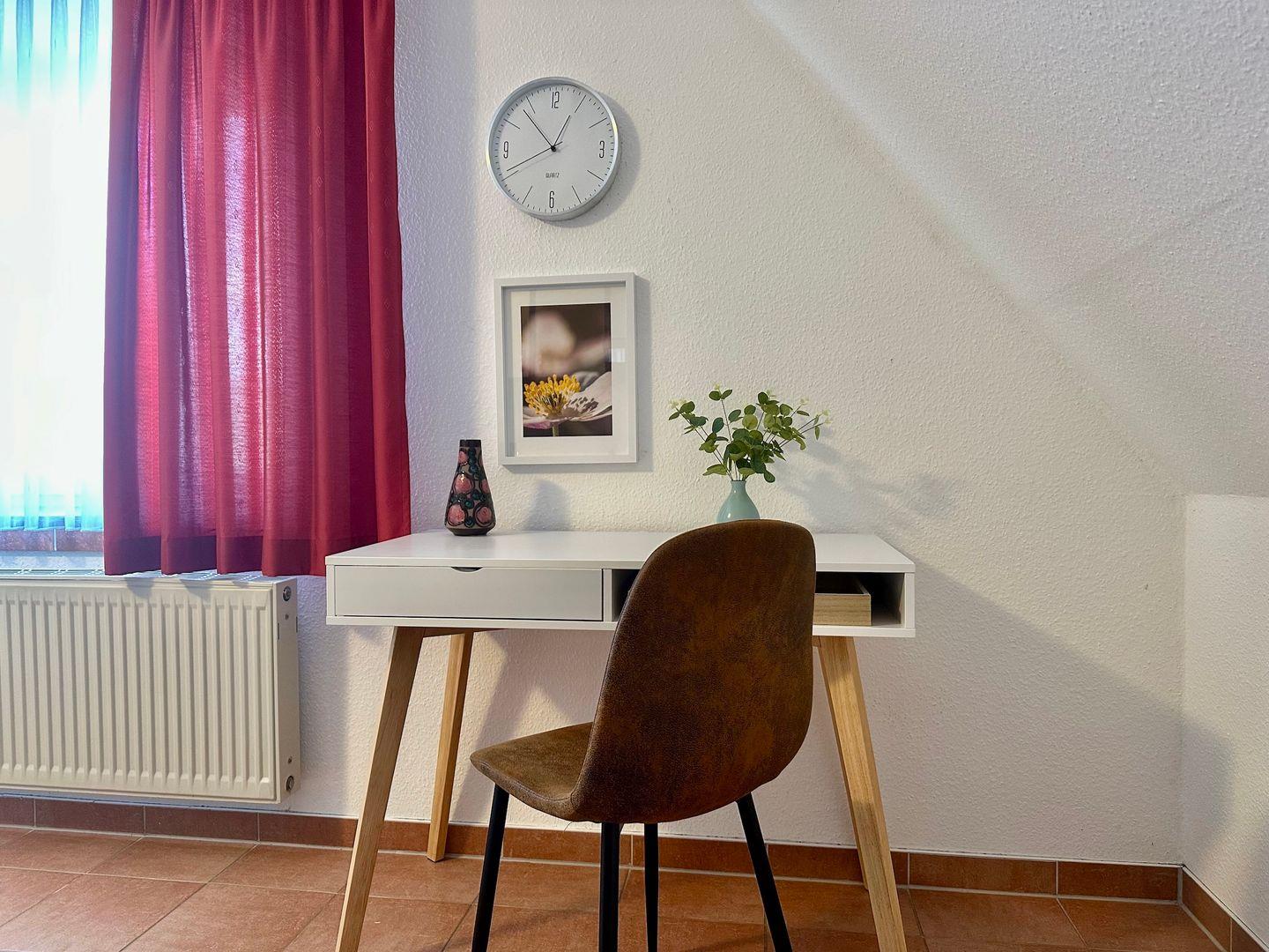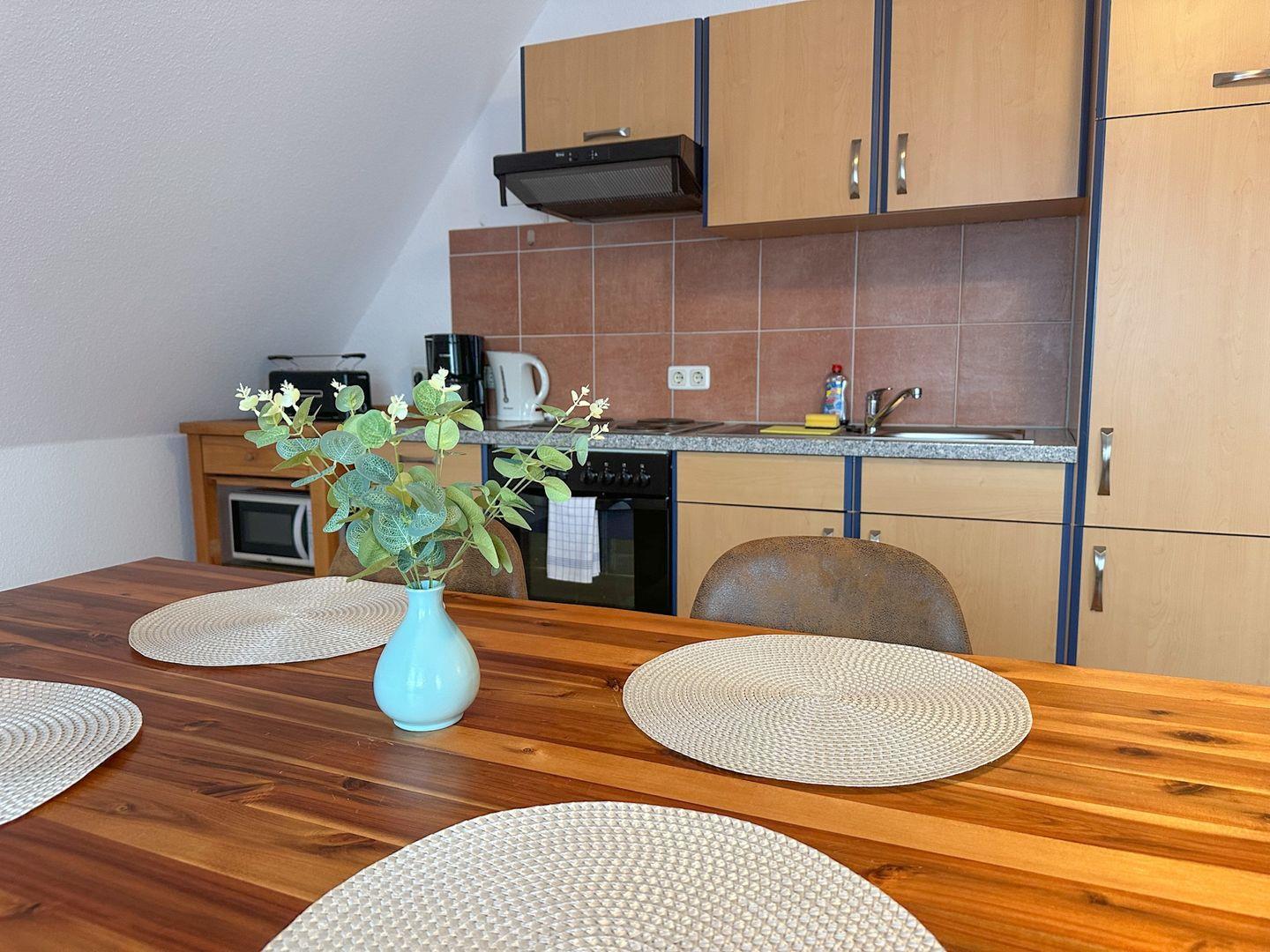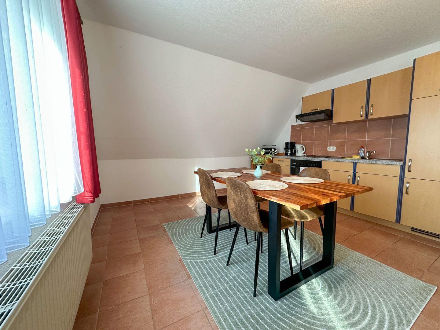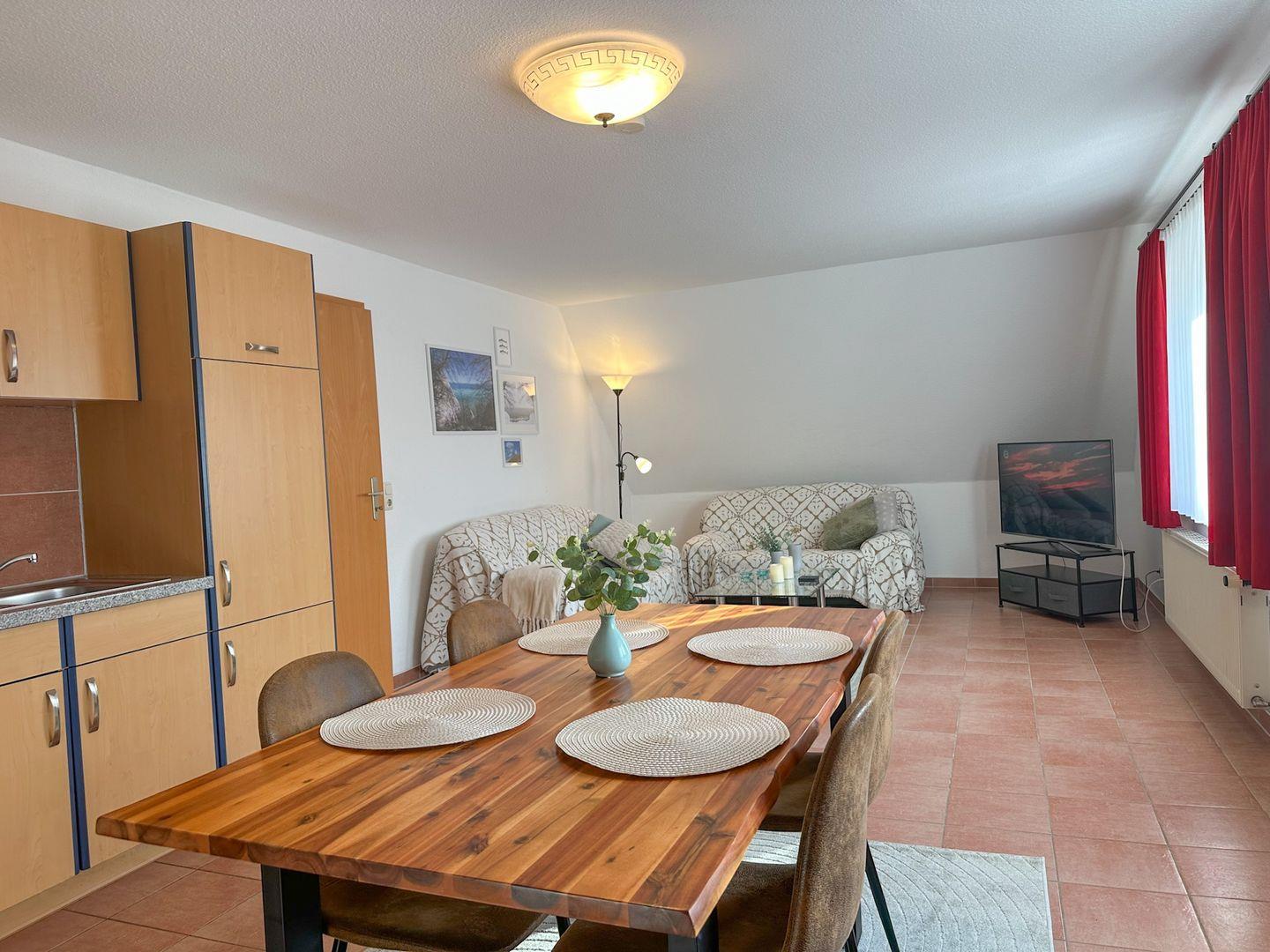 Der offene Wohn- und Essbereich bildet das Herz der Wohnung: eine gemütliche Sitzecke lädt zum Verweilen ein, während der separate Esstisch genug Platz für gemeinsame Mahlzeiten bietet. Die direkt angrenzende Küche ist voll ausgestattet – mit Herdplatte, Kühlschrank, Toaster, Wasserkocher, Kochgeschirr, Besteck und Geschirr – ideal für Selbstversorger, die auch im Urlaub nicht auf Komfort verzichten wollen.