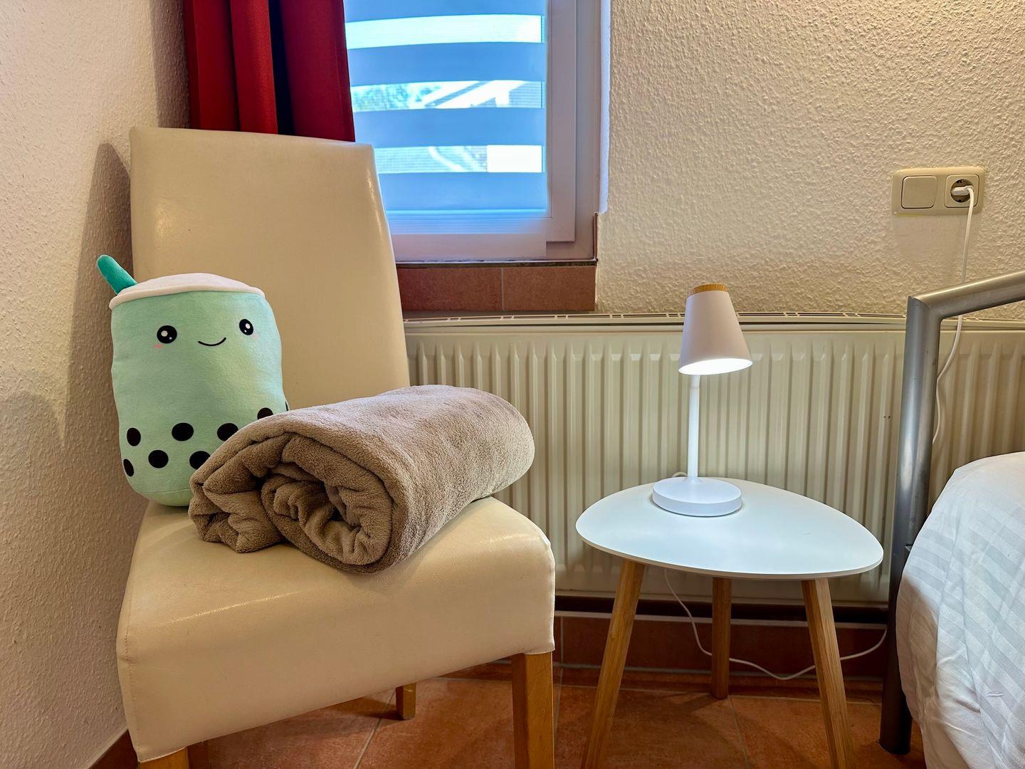 Das moderne Bad verfügt über eine Dusche, ein Waschbecken und ein WC. Frische Handtücher werden bereitgestellt, sodass Sie sich um nichts weiter kümmern müssen.