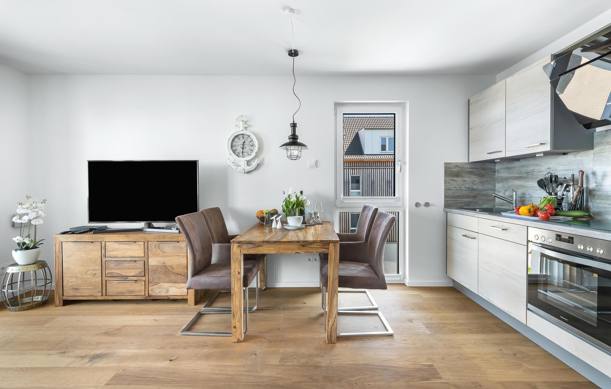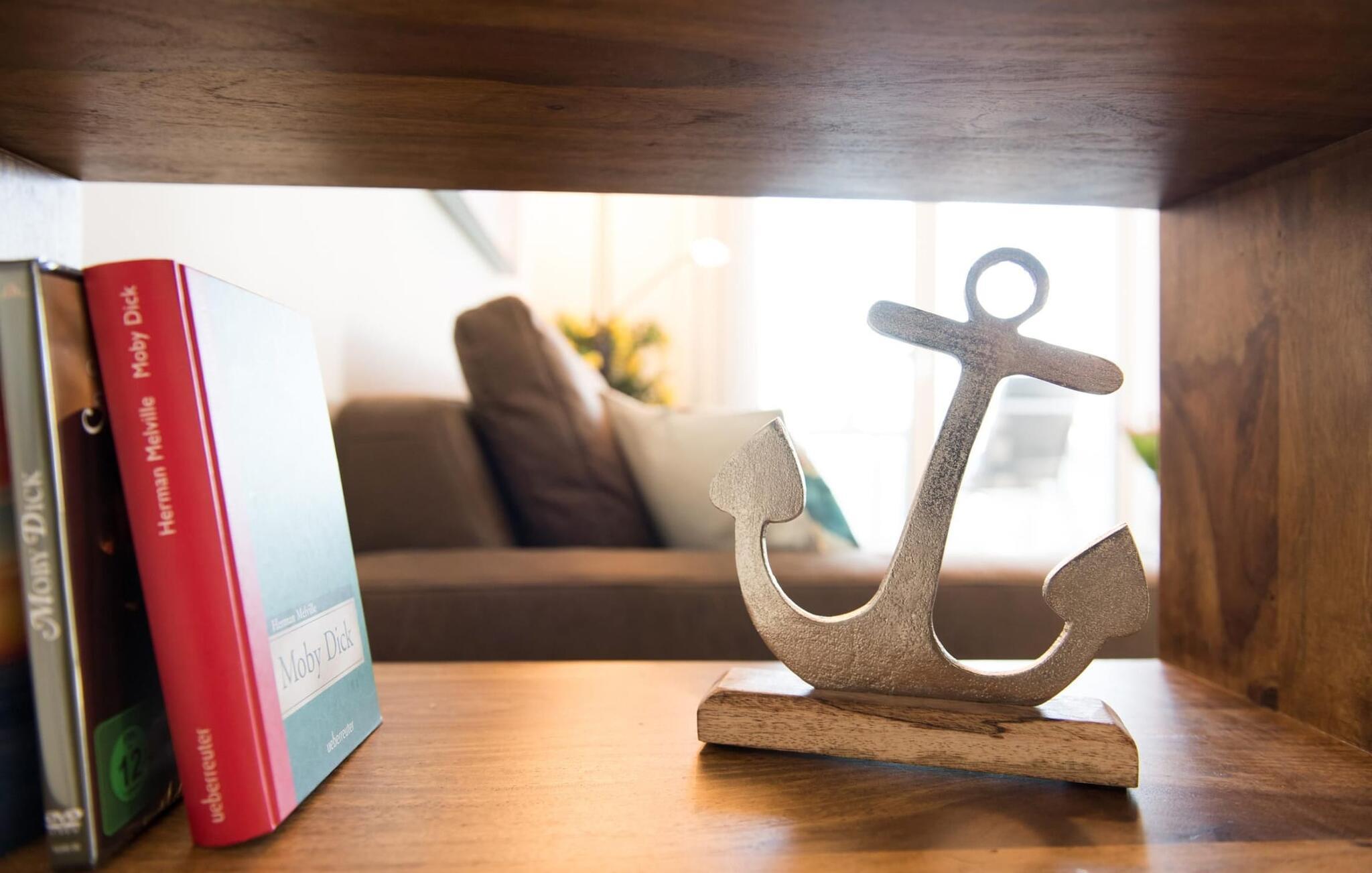 Über allem gelegen lassen sich vorbeifahrende Segelschiffe bei der Ostseeeinfahrt aus dem kompletten Wohn- /Essbereich und dem Balkon aus beobachten. Der Blick fällt auf den Leuchtturm von Schleimünde und die Idylle des Landschaftsschutzgebiets drum herum. Die Hafenpromenade befindet sich direkt unterhalb der Ferienwohnung und lädt zum Flanieren ein. Zusätzliches Entertainment bietet das Telekom Home Entertainment Programm auf dem Flatscreen-TV im Wohnzimmer sowie Bücher und Gesellschaftsspiele.