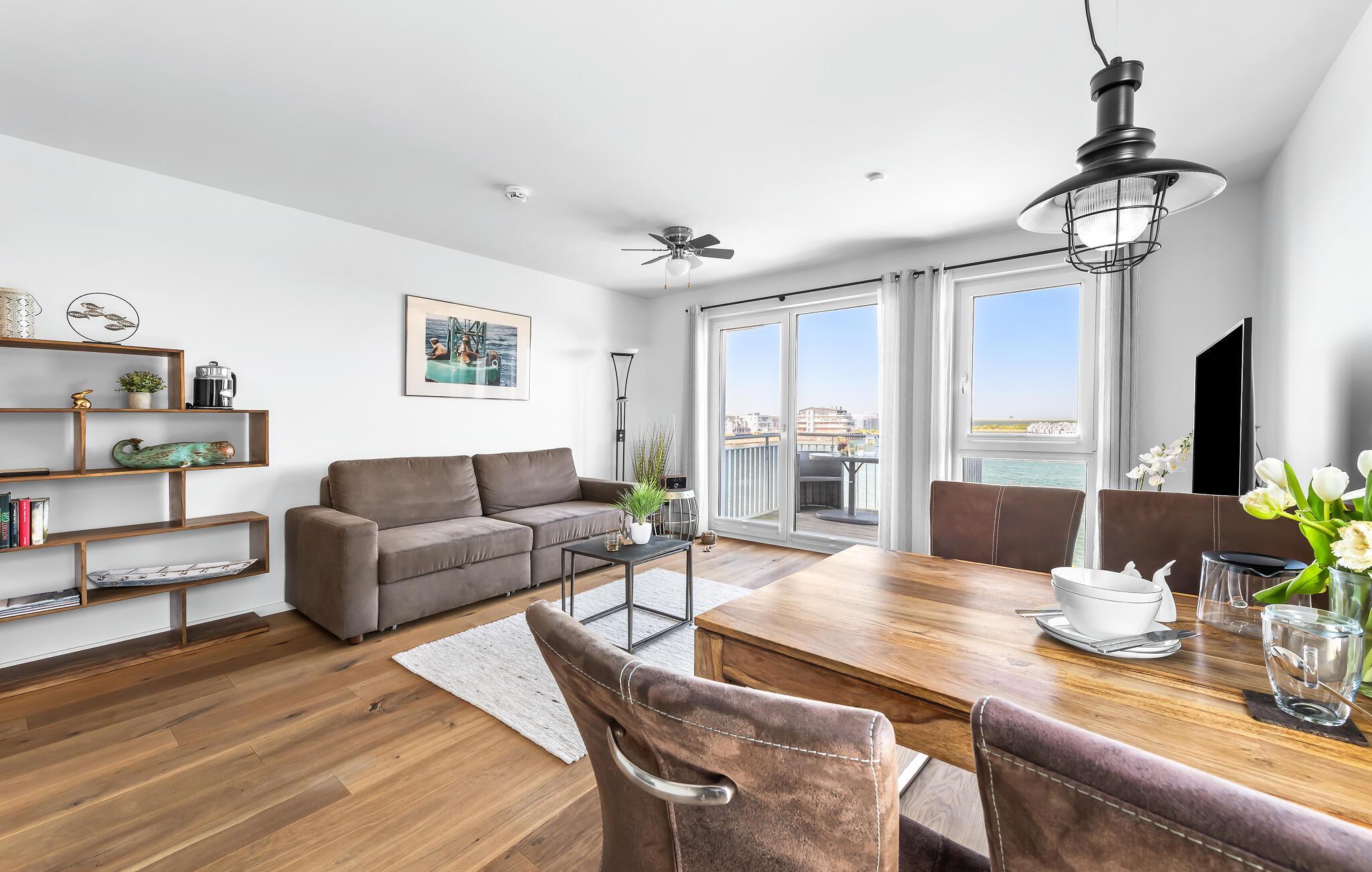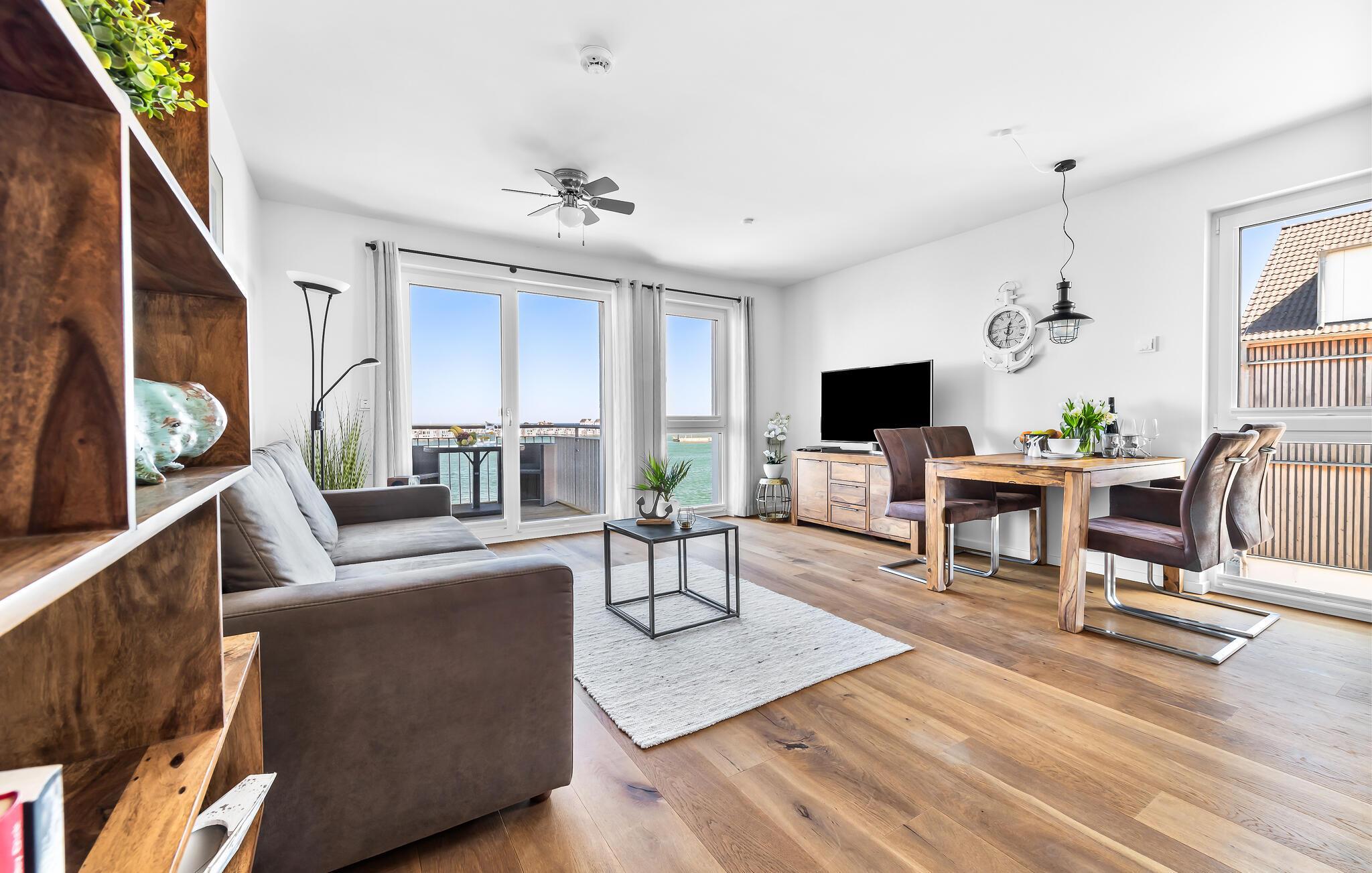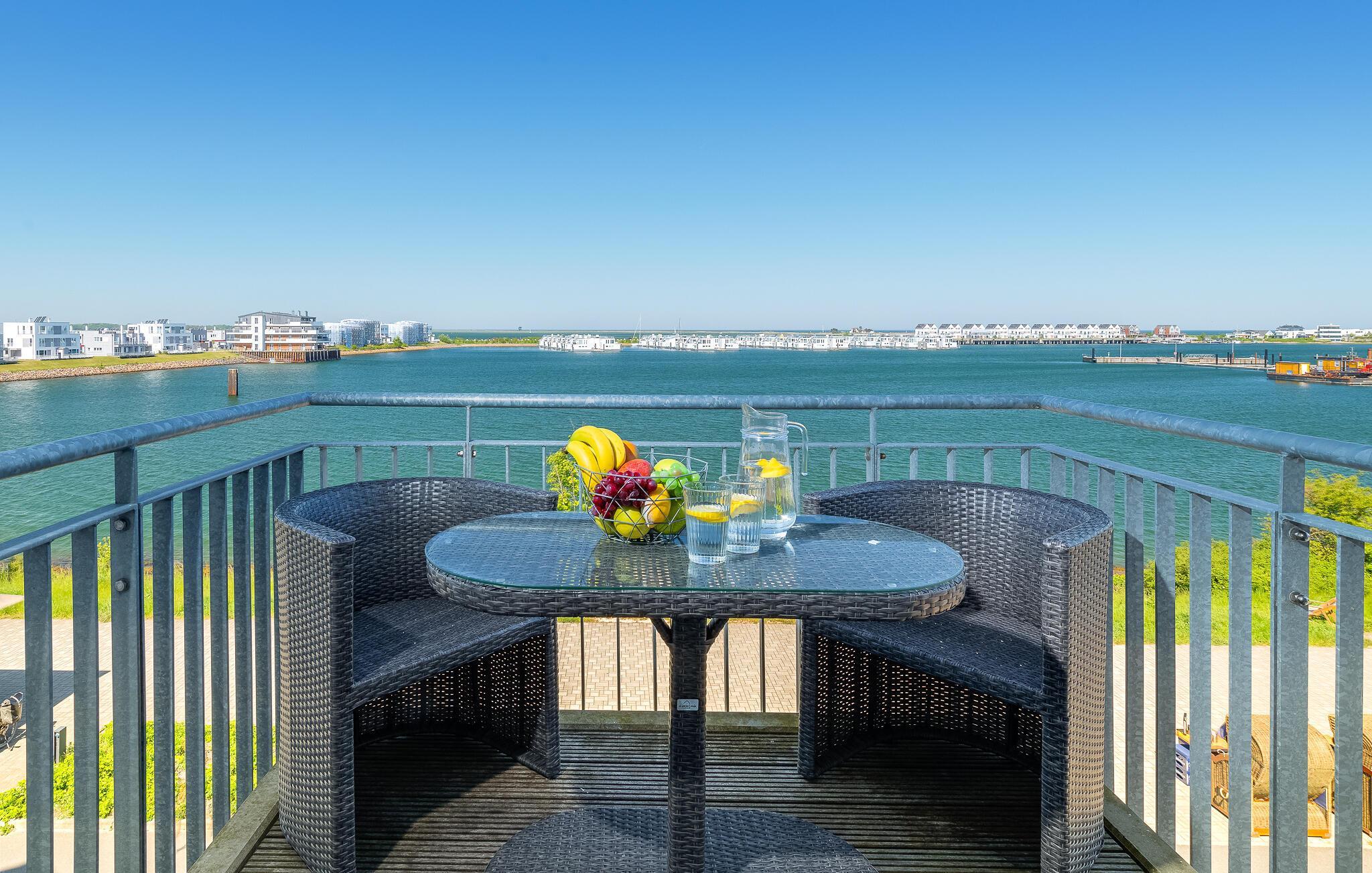 Moderne Ferienwohnung mit Balkon und Hafenblick im OstseeResort Olpenitz, ideal für entspannte Tage am Wasser.