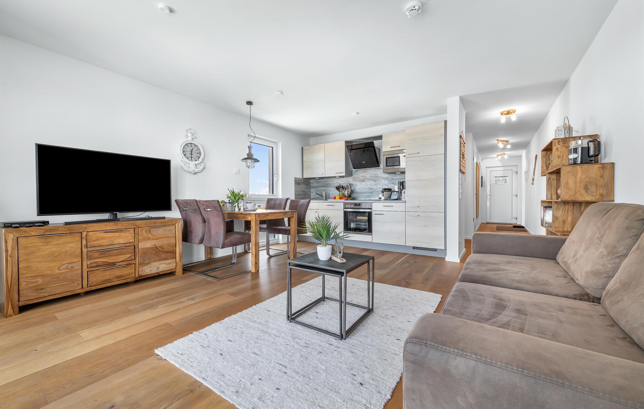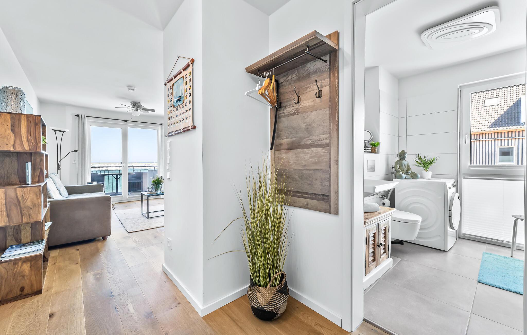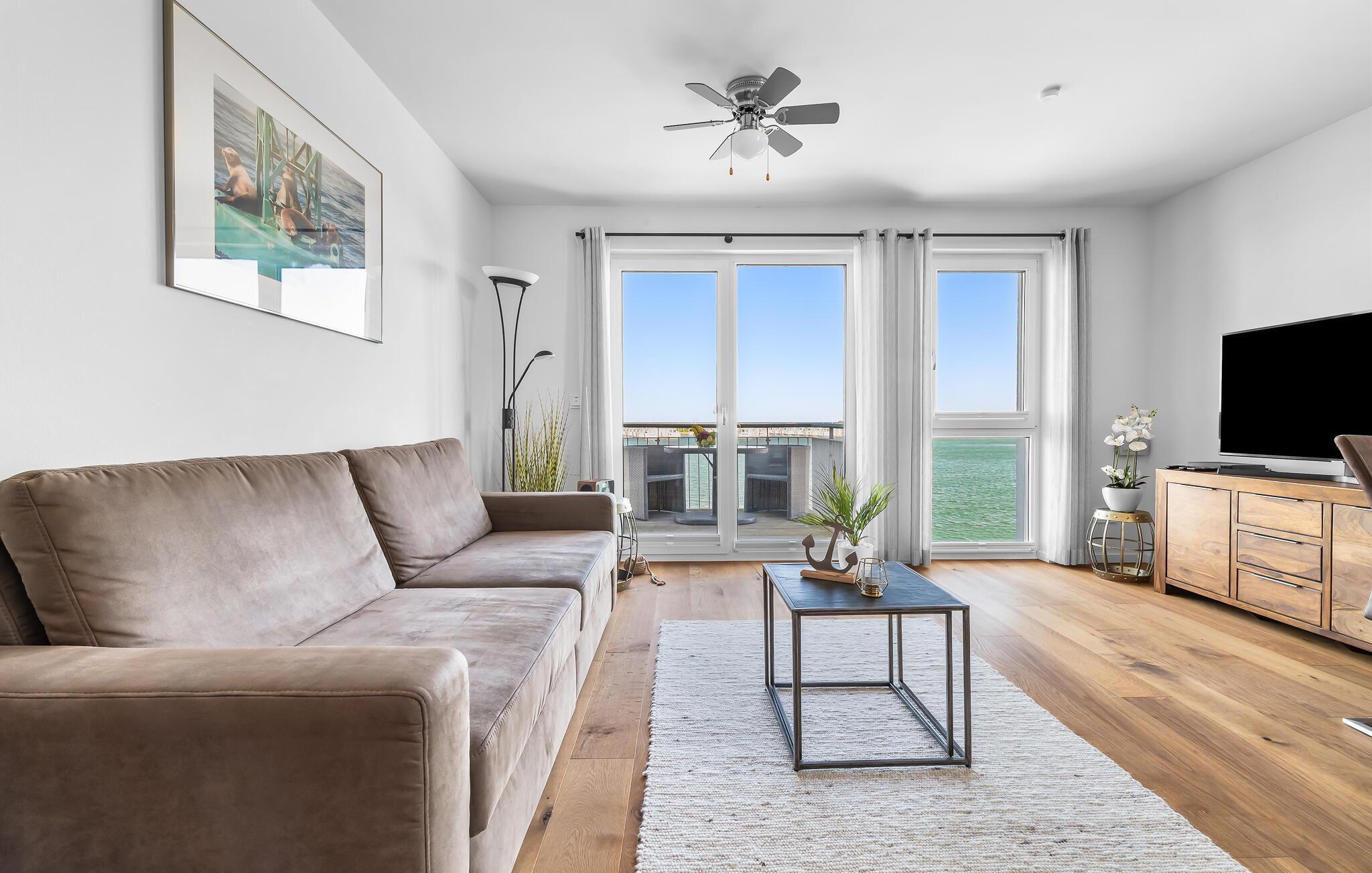 Moderne Ferienwohnung mit Balkon und Hafenblick im OstseeResort Olpenitz, ideal für entspannte Tage am Wasser.