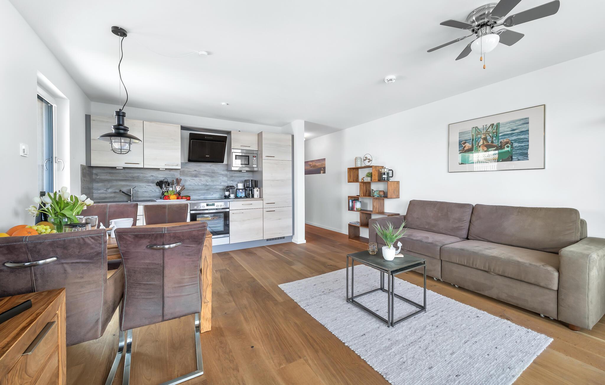 Direkt an der Hafenpromenade des OstseeResorts Olpenitz gelegen, heißt diese lichtdurchflutete Ferienwohnung Kinder ab 10 Jahren willkommen. Sie punktet durch ihre bodentiefen Fenster mit einem phänomenalen Blick auf den Segel- und Sportboothafen, die schwimmenden Häuser und den Ostseefjord Schlei. Hafenkino ist hierbei garantiert, ebenso die bilderbuchreifen Sonnenuntergänge, die sich vom Balkon aus beobachten lassen.