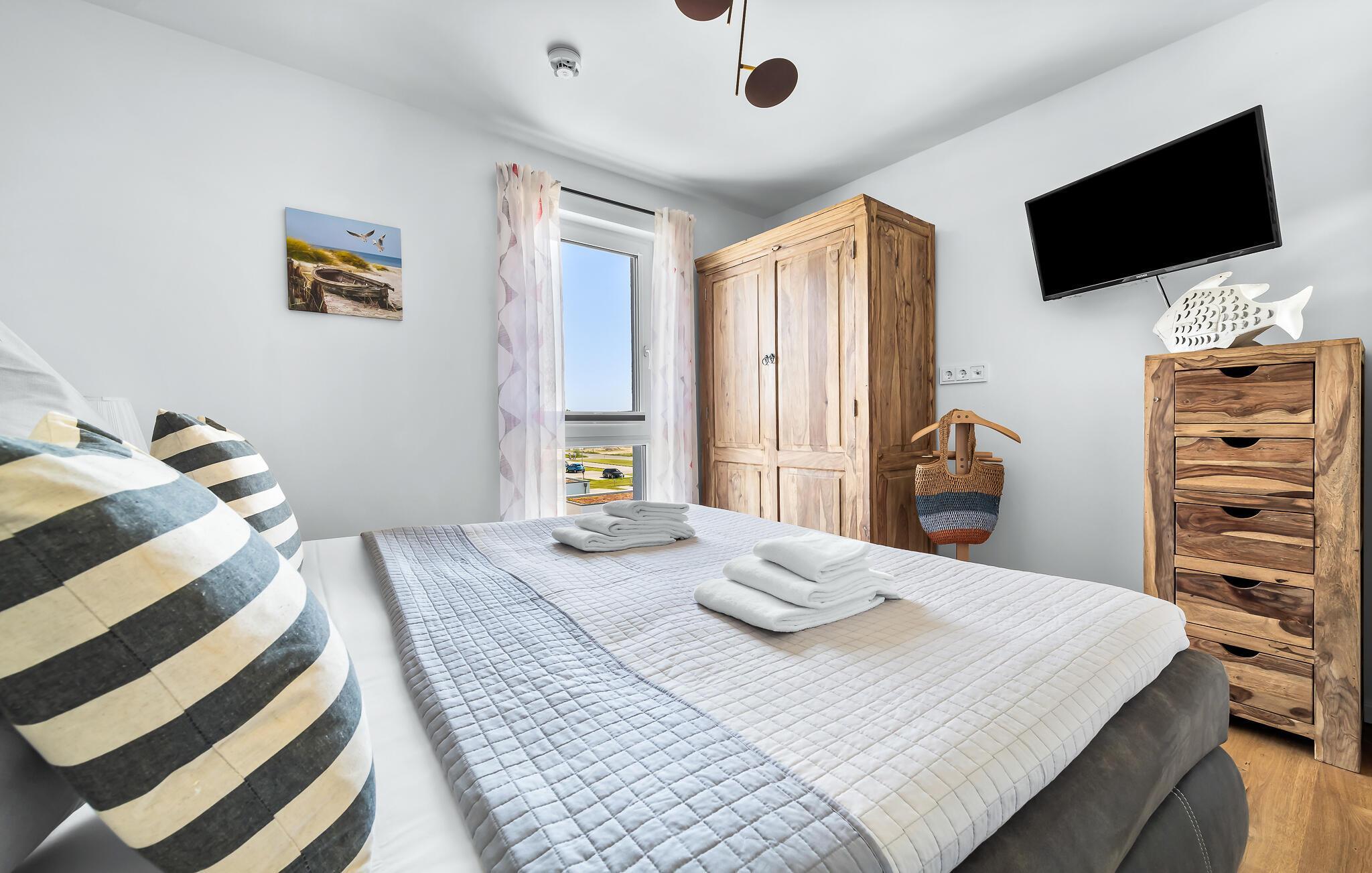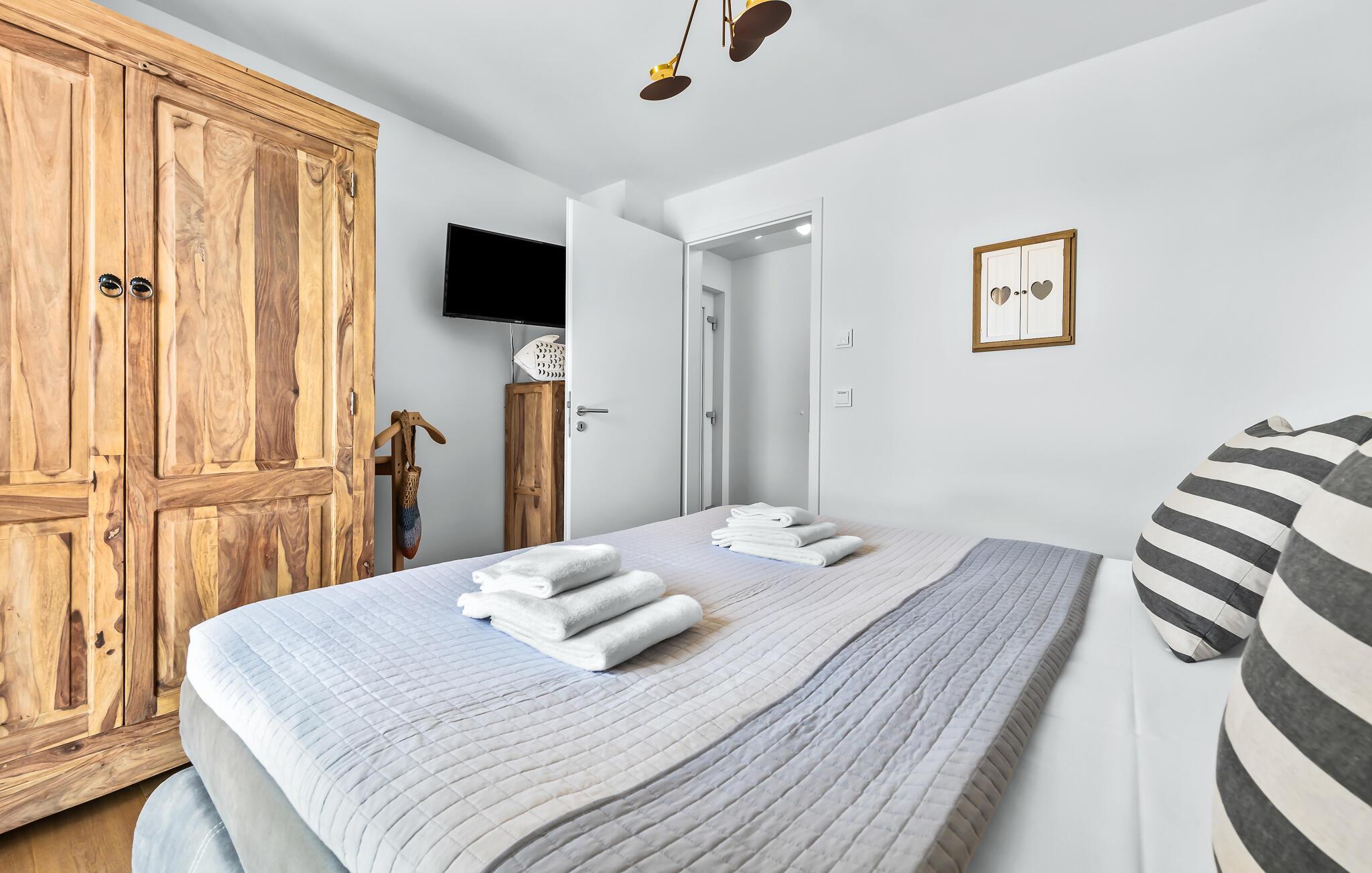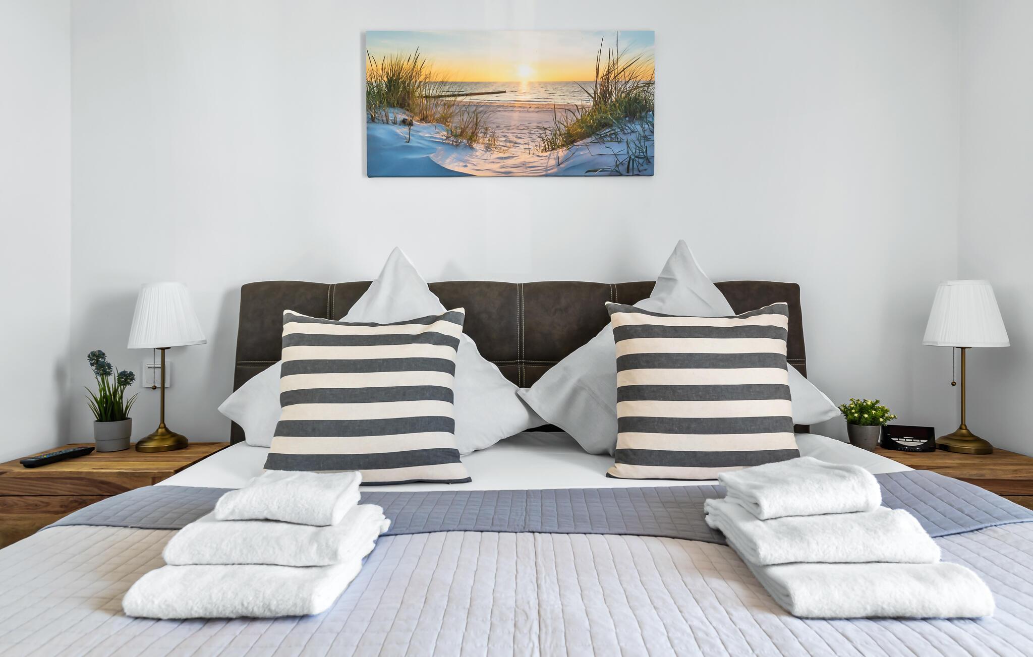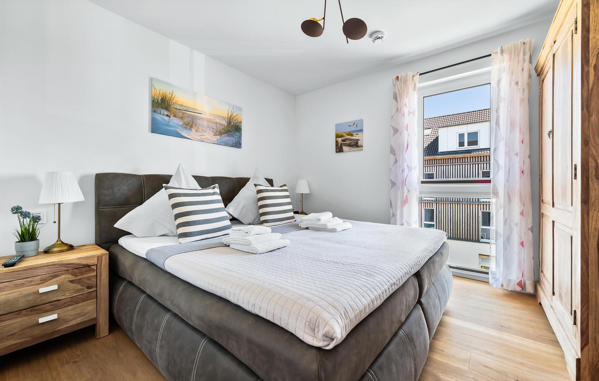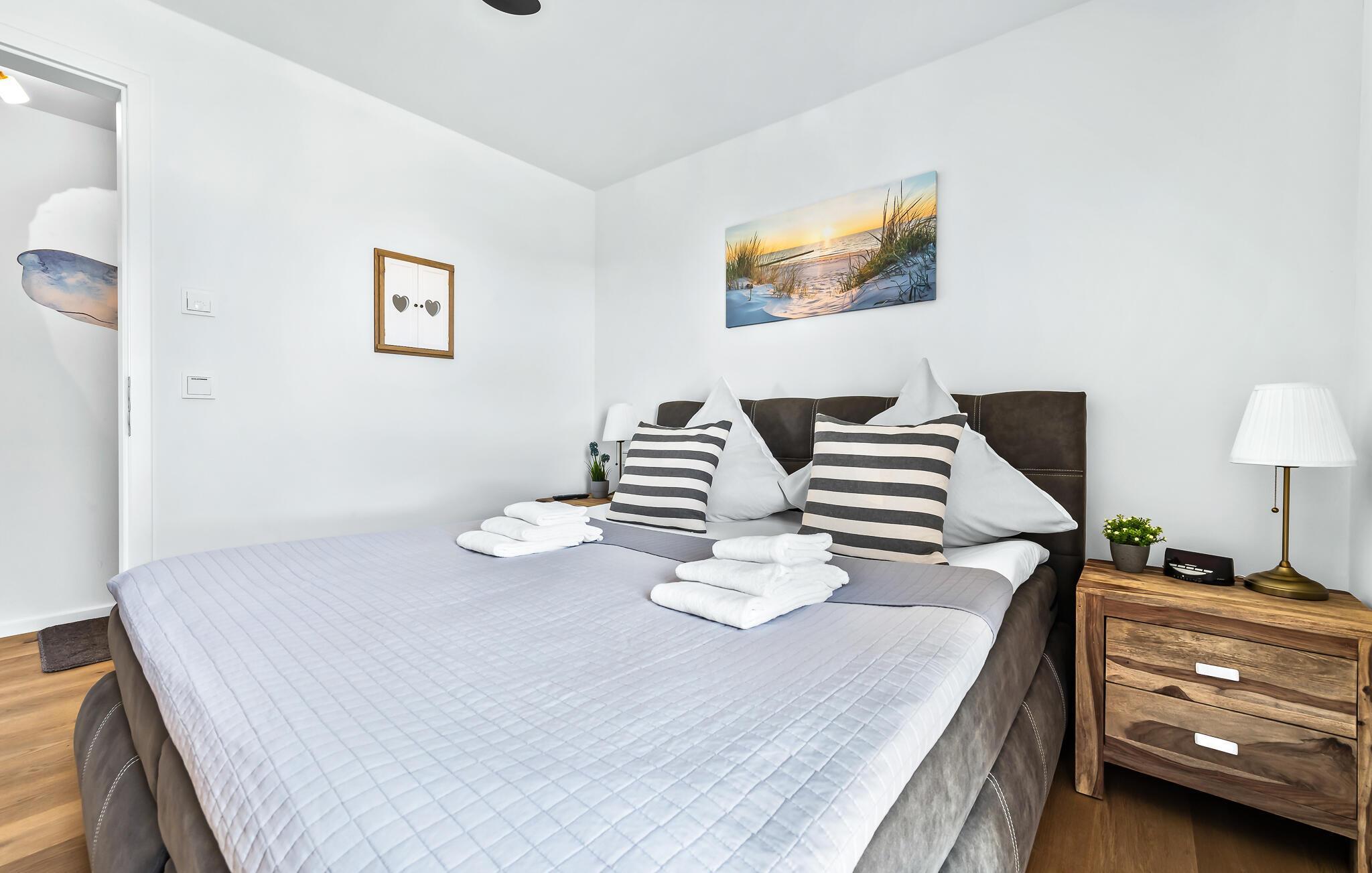 Erholsamen Urlaubsschlaf bietet das gemütliche Schlafzimmer ausgestattet mit einem Doppelbett. Durchs Fenster dürfen Frühaufsteher hier traumhafte Sonnenaufgänge beobachten.