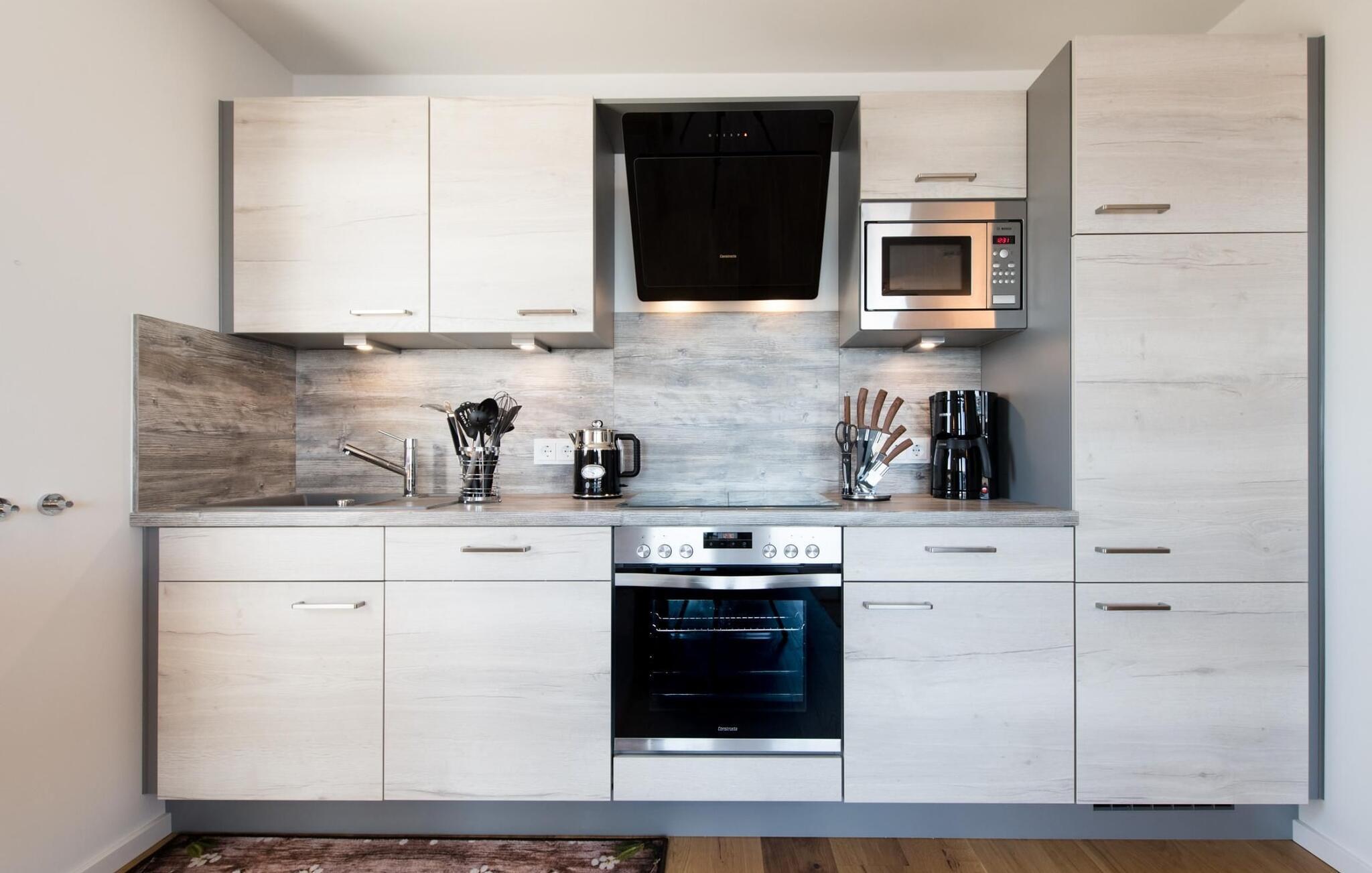 Die umfangreich ausgestattete offene Küche lässt keine Wünsche offen. Hier lassen sich köstliche Urlaubsmahlzeiten zaubern.