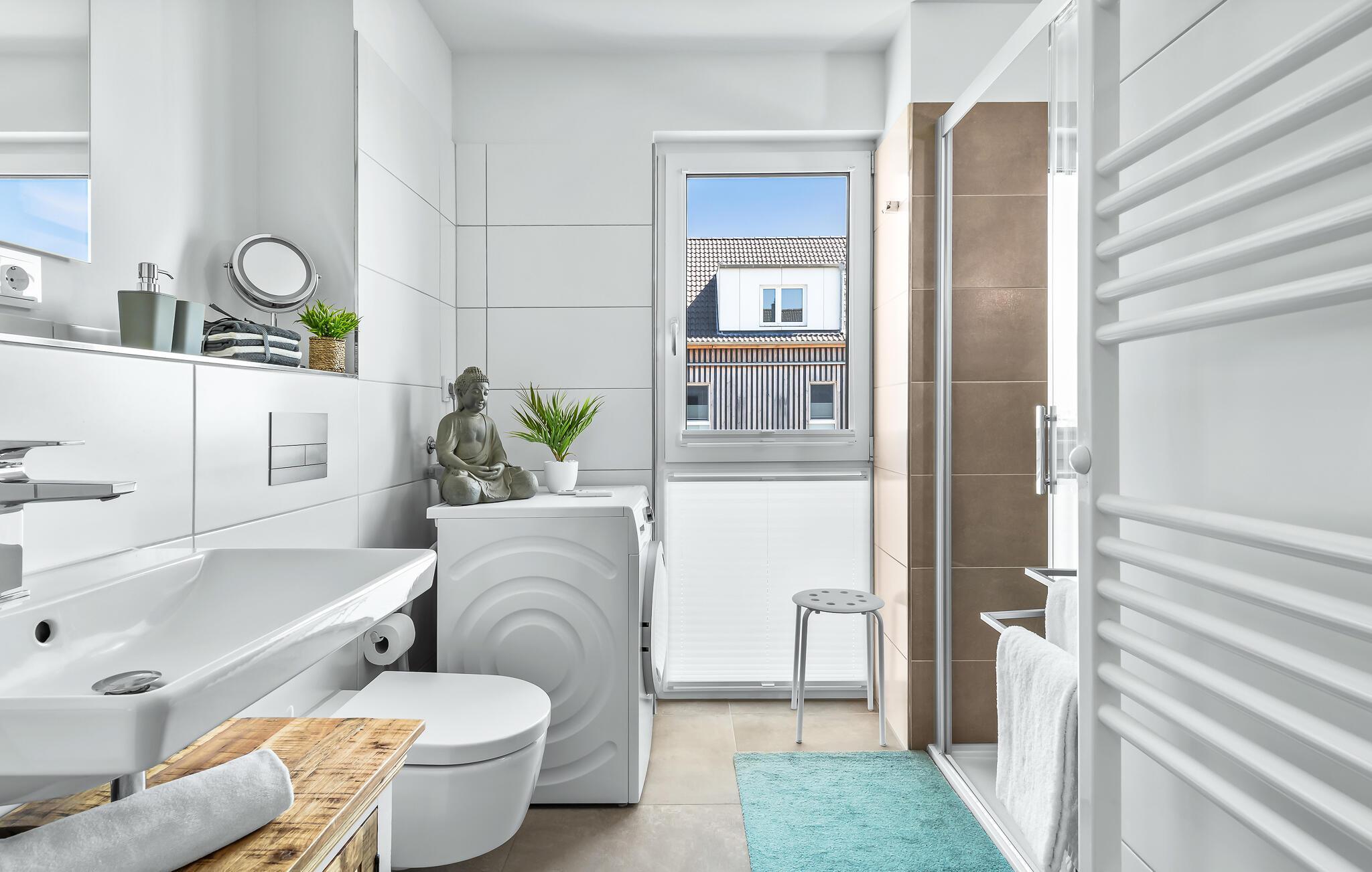 Das Duschbad verfügt über eine große bodengleiche Dusche. Die Ecklage der Wohnung bietet auch in diesem Zimmer den Komfort eines Außenfensters mit Blick über die Promenade.