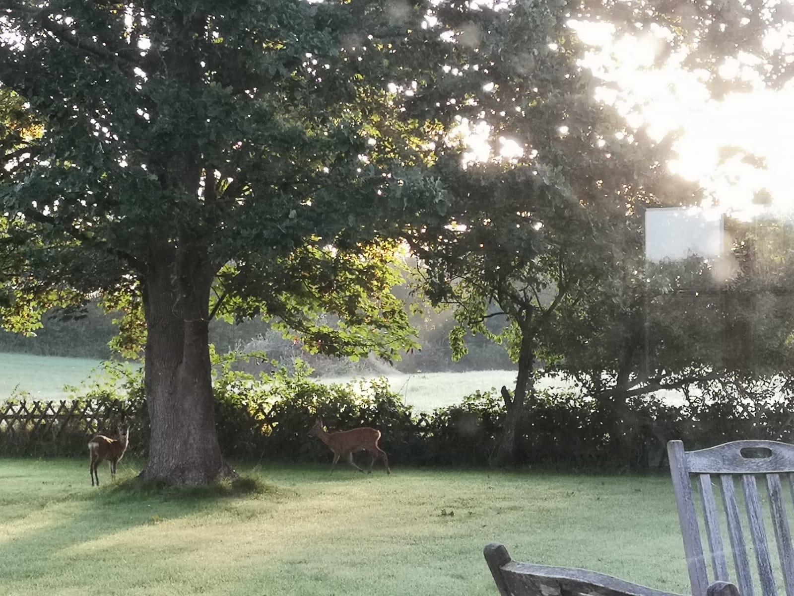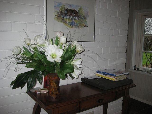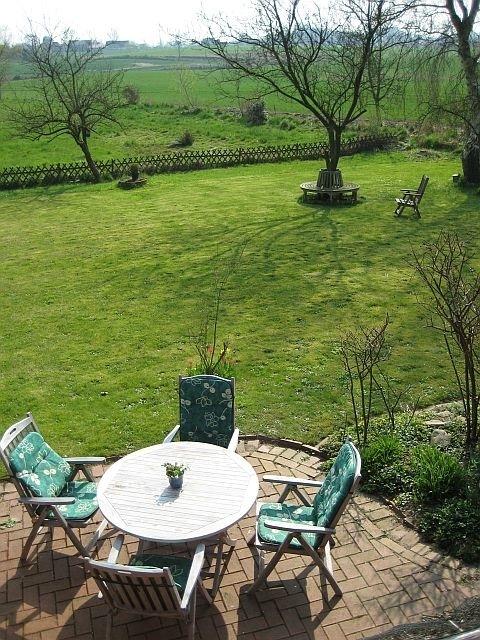 Sie betreten im EG den gemütlichen Wohn/Essbereich mit Fußbodenheizung und gut sortierter Küche von wo Sie direkten Zugang zur großen Terrasse haben. Der Blick schweift über alte Obstbäume, Wiesen und Eichen unter denen es sich wunderbar in bequemen Liegestühlen träumen und entspannen lässt . Stockrosen, Mohn, Lavendel und Akeleien wachsen in üppiger Fülle rings ums Haus. Oft kommen in der Dämmerung Rehe und Fasan bis auf das Grundstück.