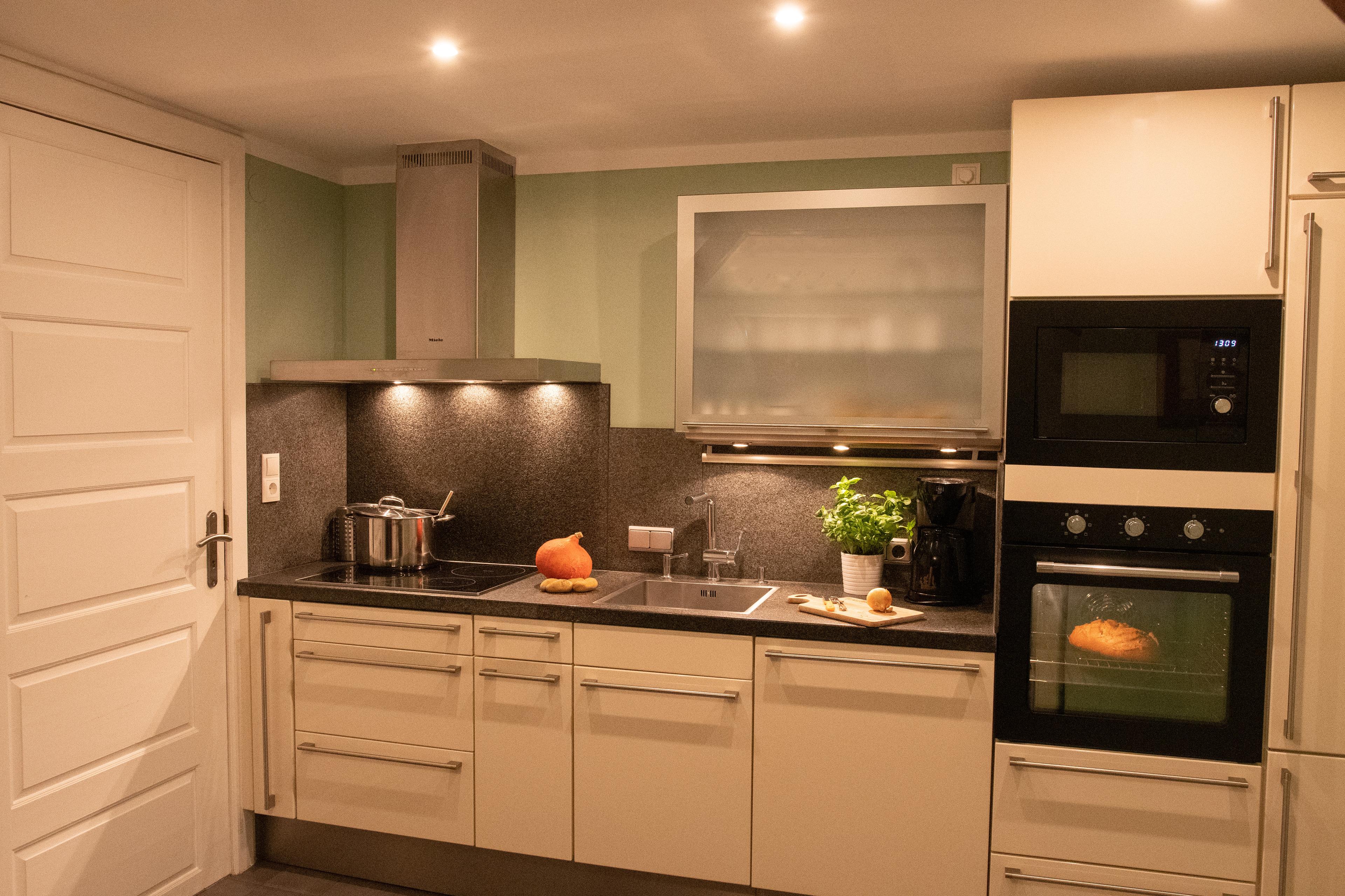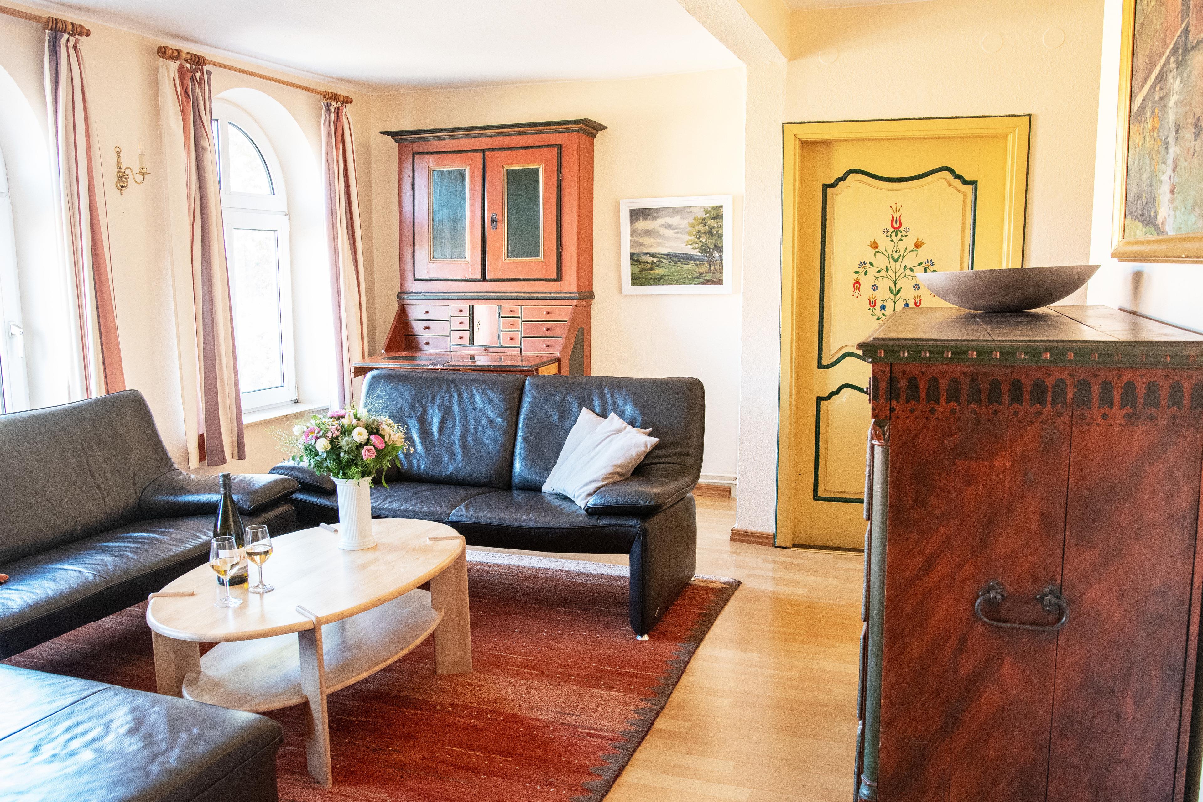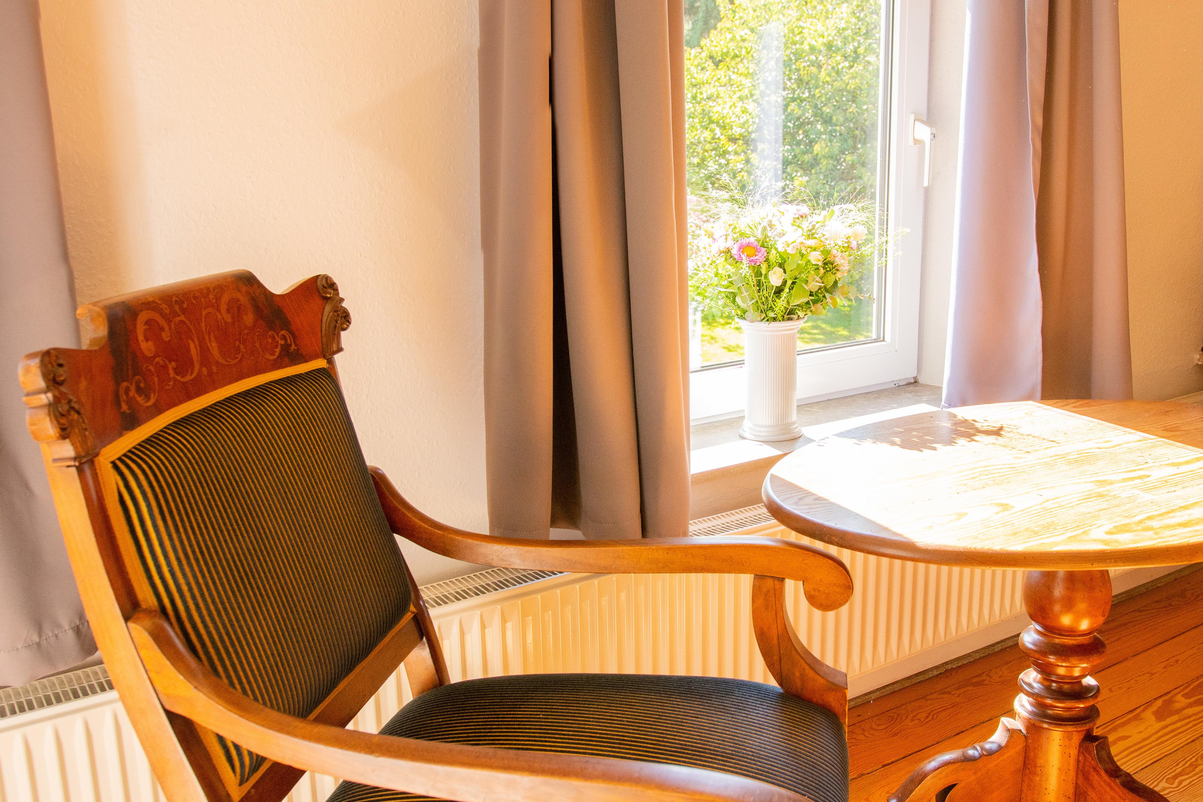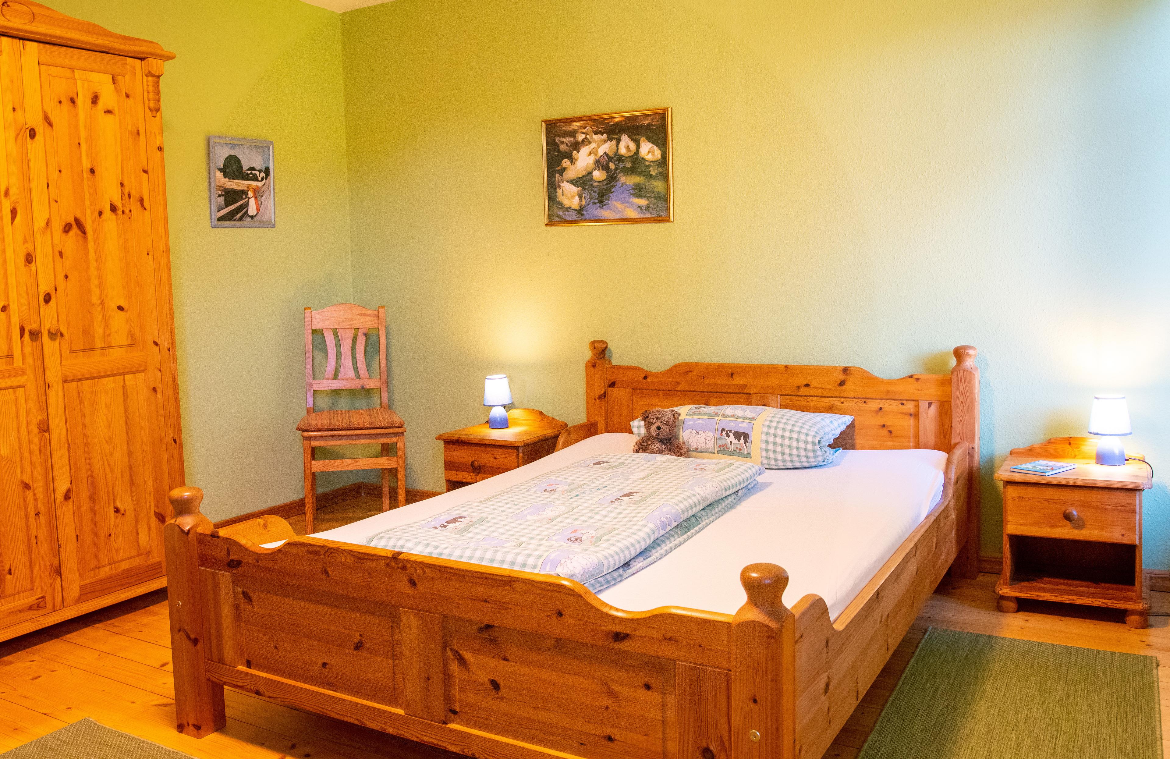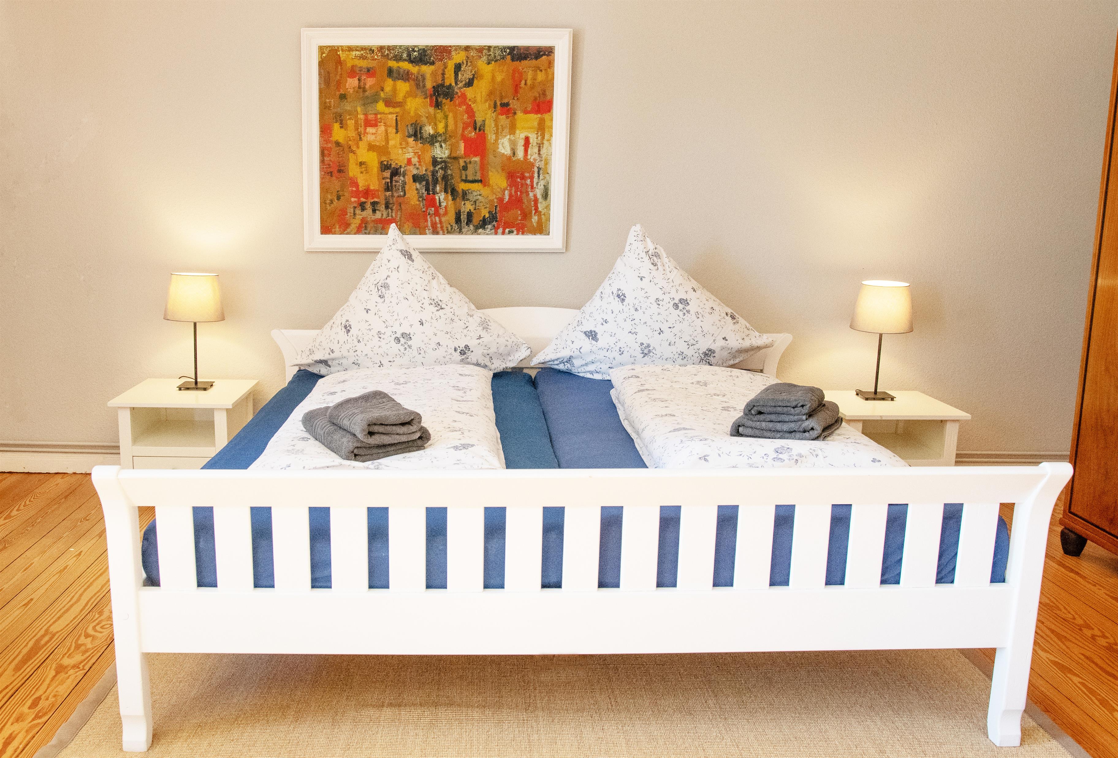 Unsere Hofwohnung bietet drei Schlafzimmer (2 Doppelbetten, 1 Einzelbett, 1 Franz. Bett 1,40 x 2,00 m, 1 Kinderbett), ein Tageslichtbadezimmer mit Dusche, ein Wohnzimmer und eine voll ausgestattete Küche. Die Wohnung ist im Haupthaus gelegen. Der alte Dielenboden und die großen, zum Hof und zum Garten ausgerichteten Fenster verleihen ihr einen besonderen Charme. Zur Wohnung gehört eine eigene, im Garten gelegene Terrasse.