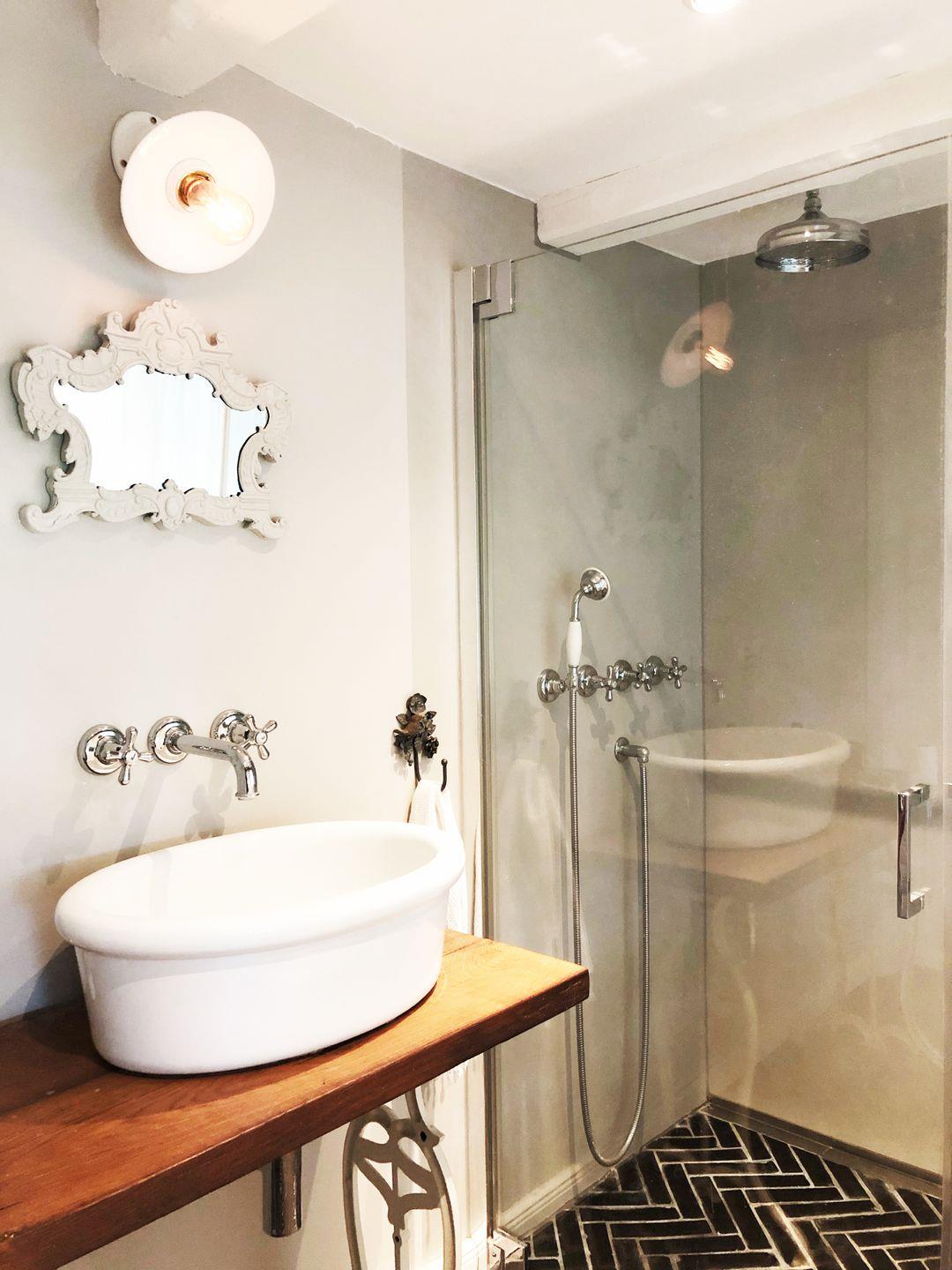 Ebenfalls im Untergeschoss befindet sich das aufwendig gestaltete nostalgische Duschbad mit einer Fußbodenheizung und allem Komfort vom Scheitel bis zur Sohle.