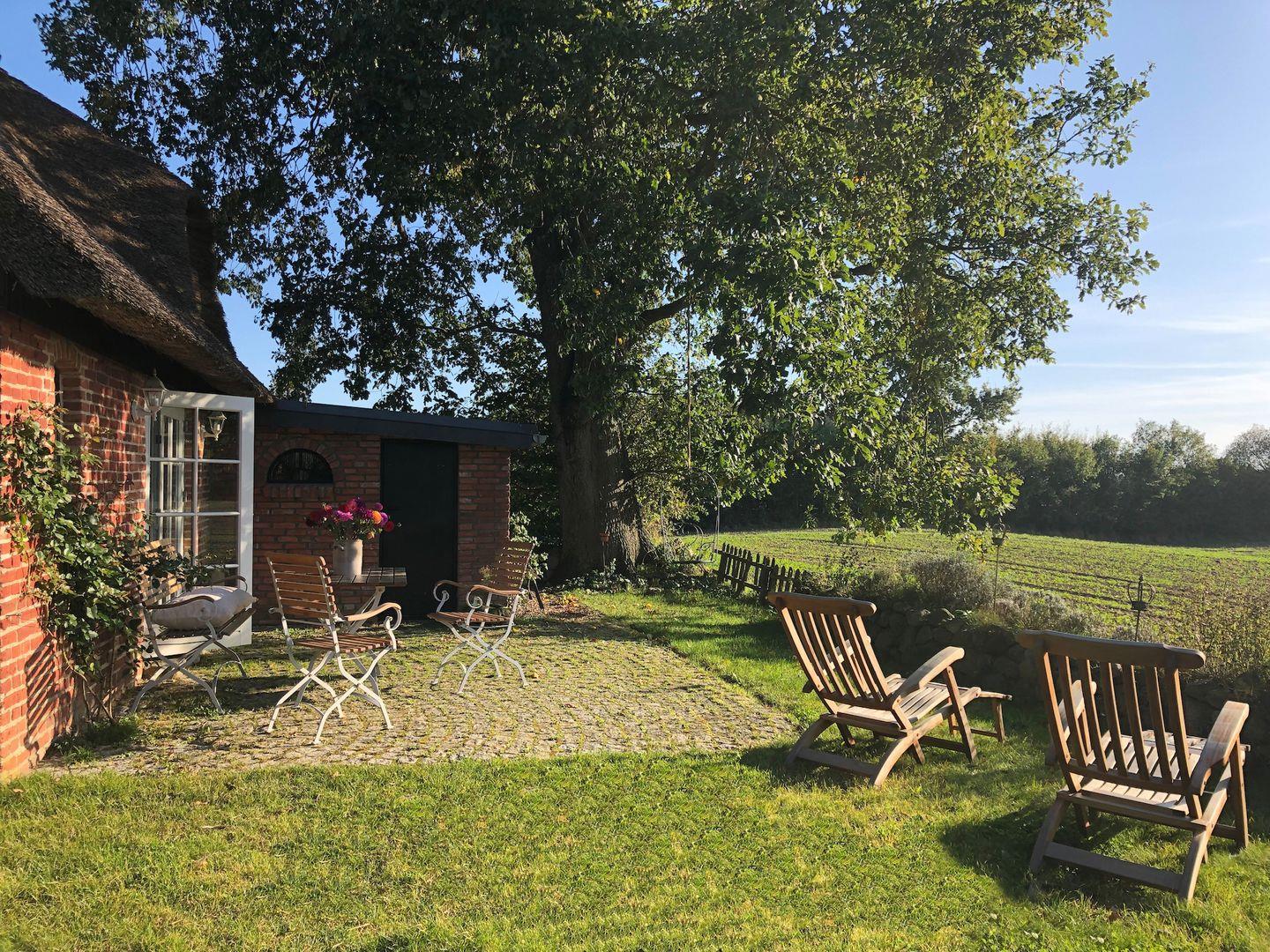 Romantisches Reetdachhaus Frau Schröders in idyllischer Schleilandschaft mit Kamin, Terrasse und großem Garten für entspannte Urlaubstage.