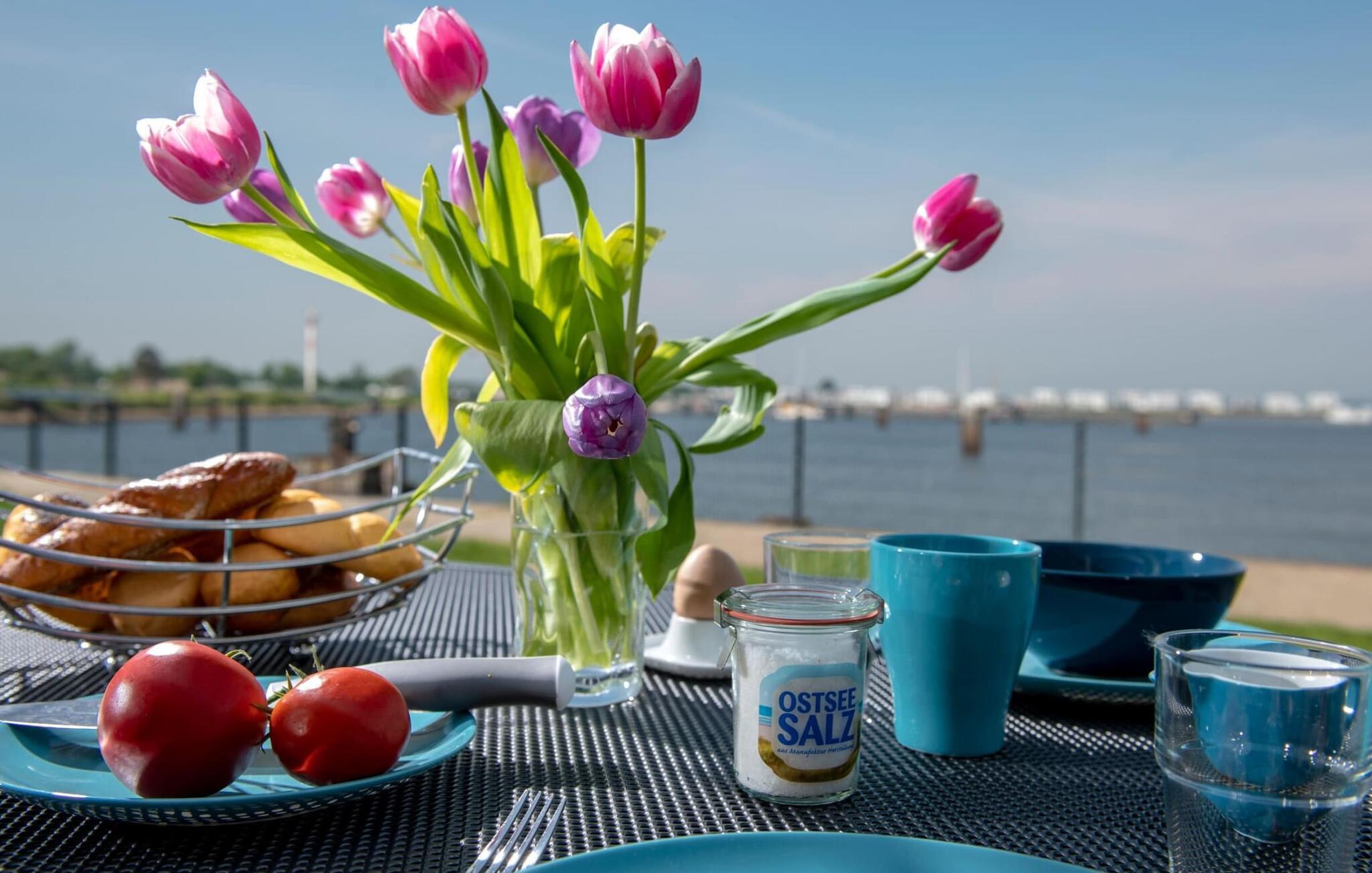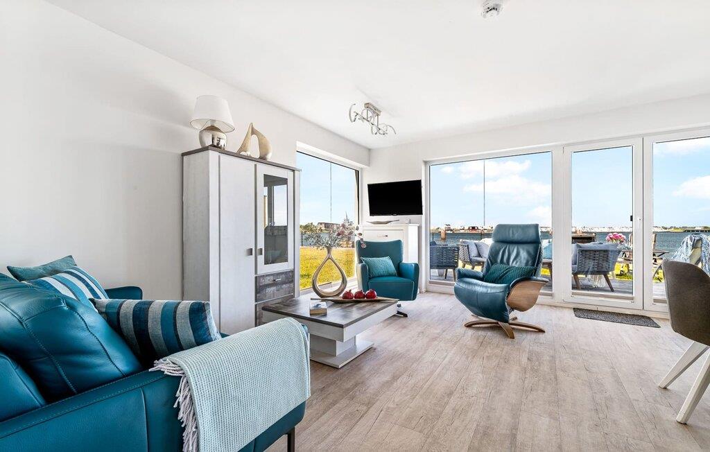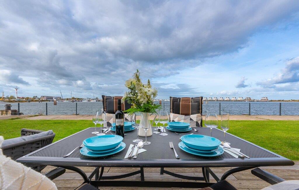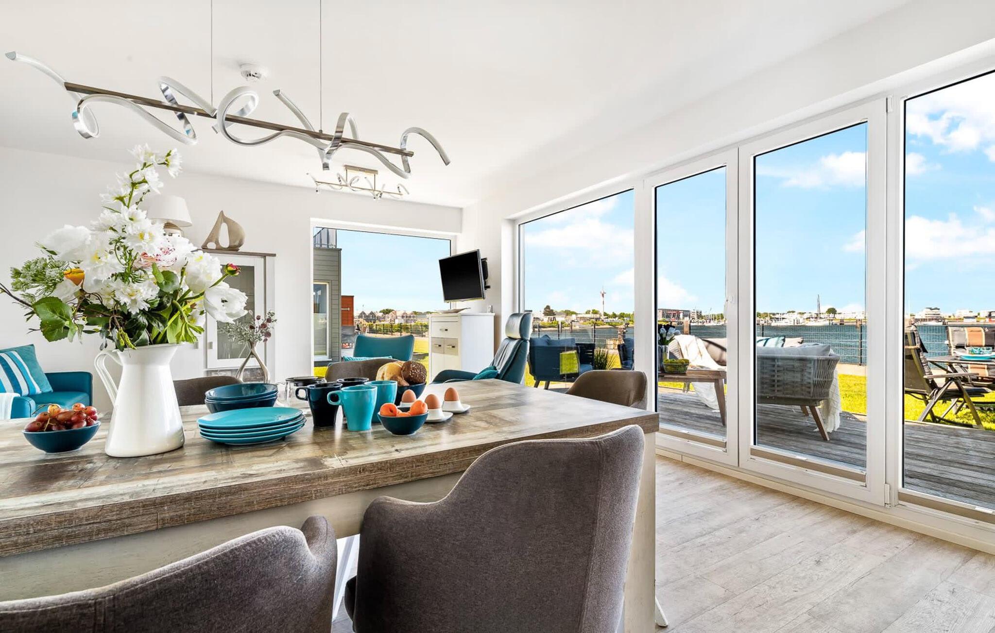 Traumhafte Aussichten eröffnen sich aus dem Wohnbereich und auf der angrenzenden Terrasse mit Blick über die Marina. Hafenkino sorgt hier für Unterhaltung während eines geselligen Grillabends oder romantischen Candle-Light-Dinners bei Sonnenuntergang. Für Indoor Unterhaltung sorgen außerdem WLAN und Smart TV mit Telekom Home Entertainment Programm.
