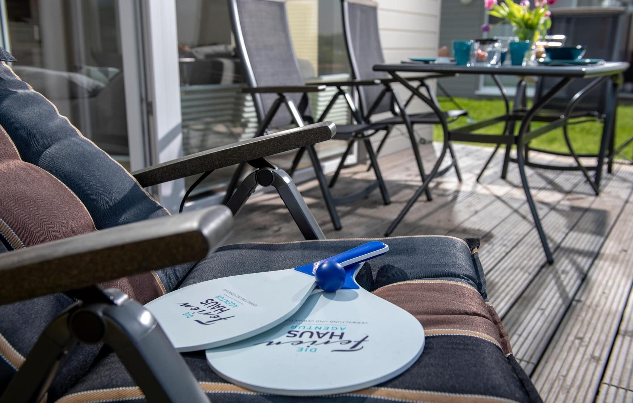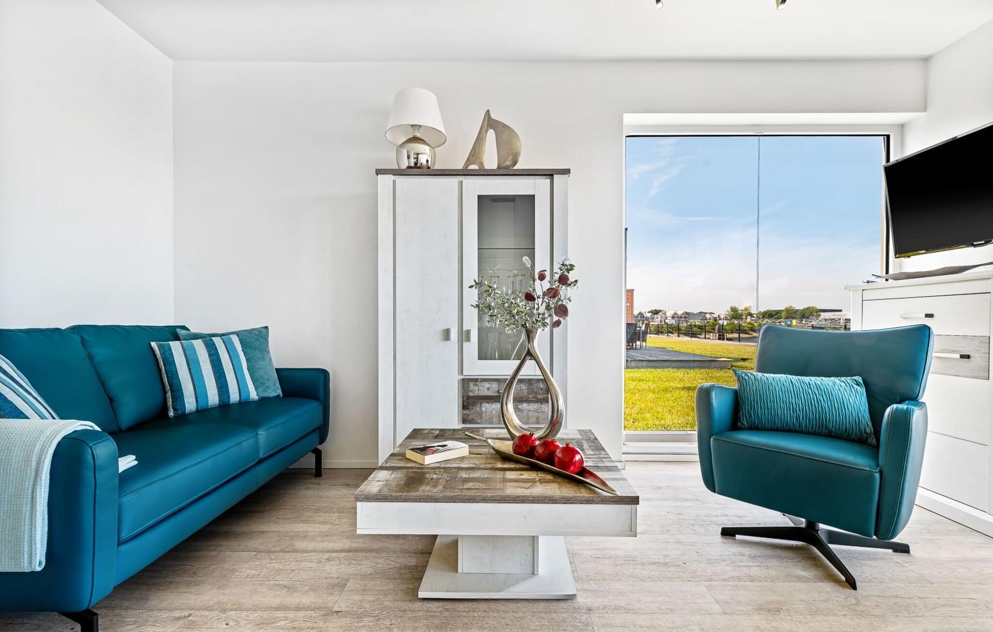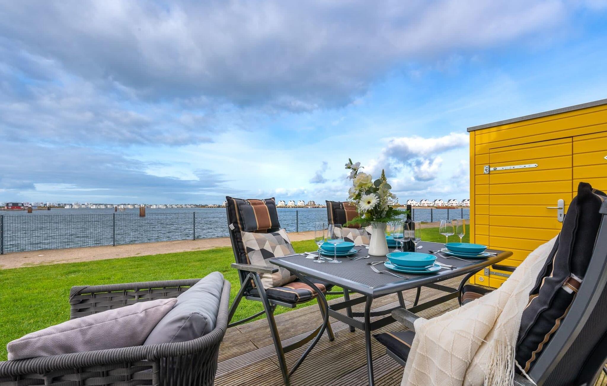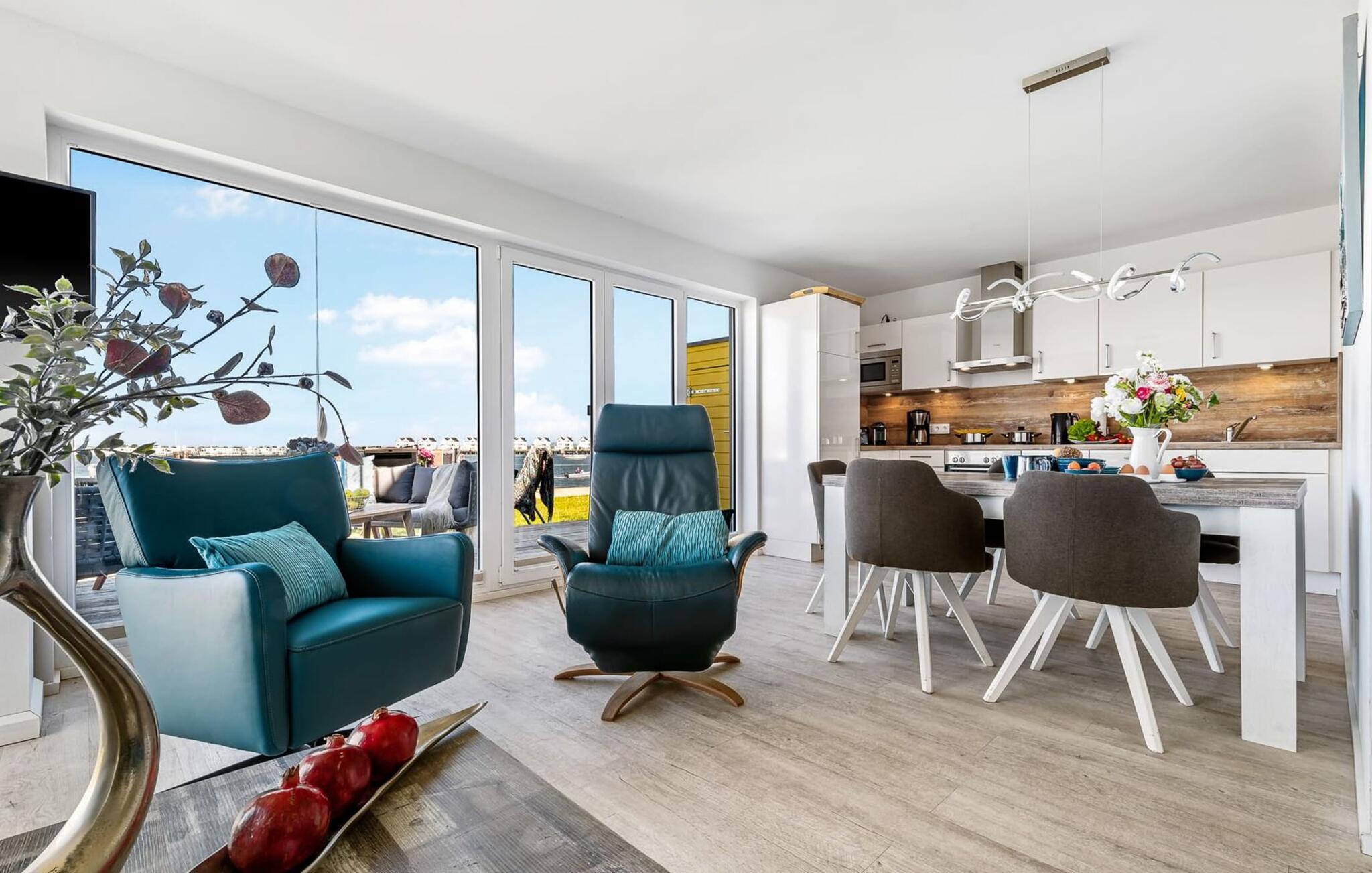 Traumhafte Aussichten eröffnen sich aus dem Wohnbereich und auf der angrenzenden Terrasse mit Blick über die Marina. Hafenkino sorgt hier für Unterhaltung während eines geselligen Grillabends oder romantischen Candle-Light-Dinners bei Sonnenuntergang. Für Indoor Unterhaltung sorgen außerdem WLAN und Smart TV mit Telekom Home Entertainment Programm.