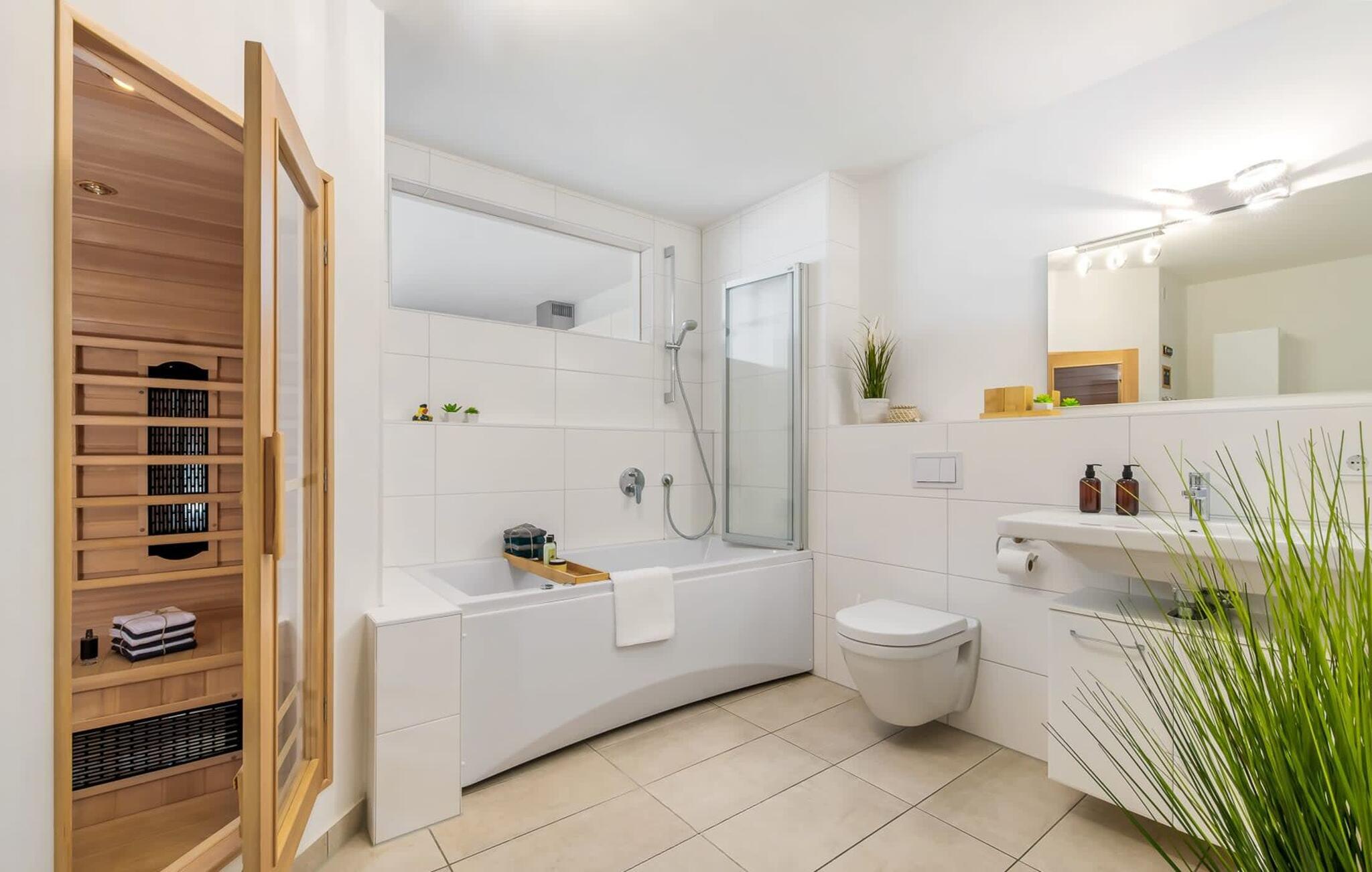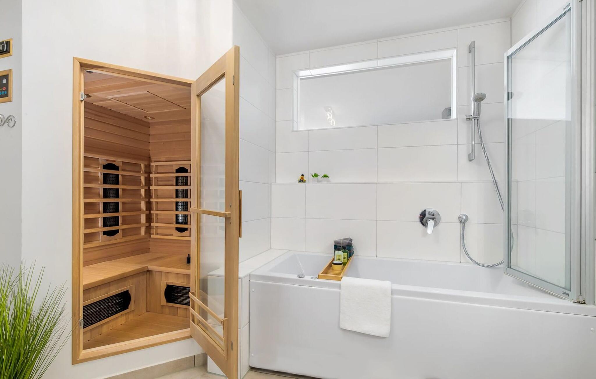Wellness Liebhaber kommen ganz auf ihre KostenInfrarot Wärmekabine mit Hifi-Sound-System und LED-Farblichttherapie sowie eine Relax-Whirlpool-Badewanne laden nach dem Strandspaziergang zum Entspannen ein.