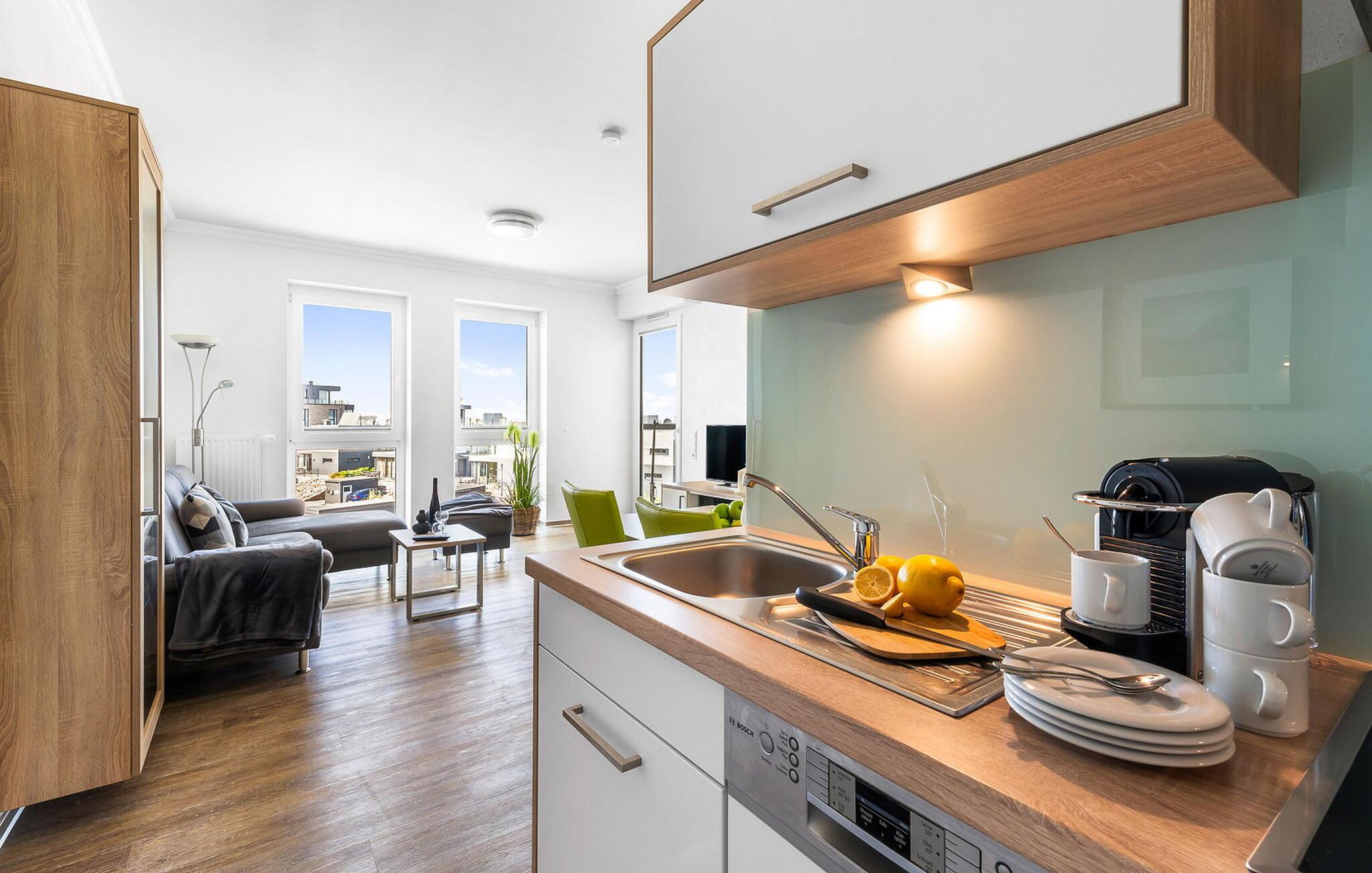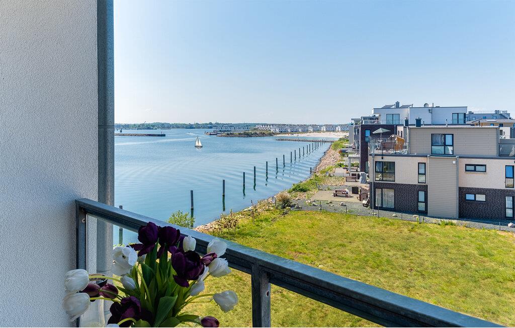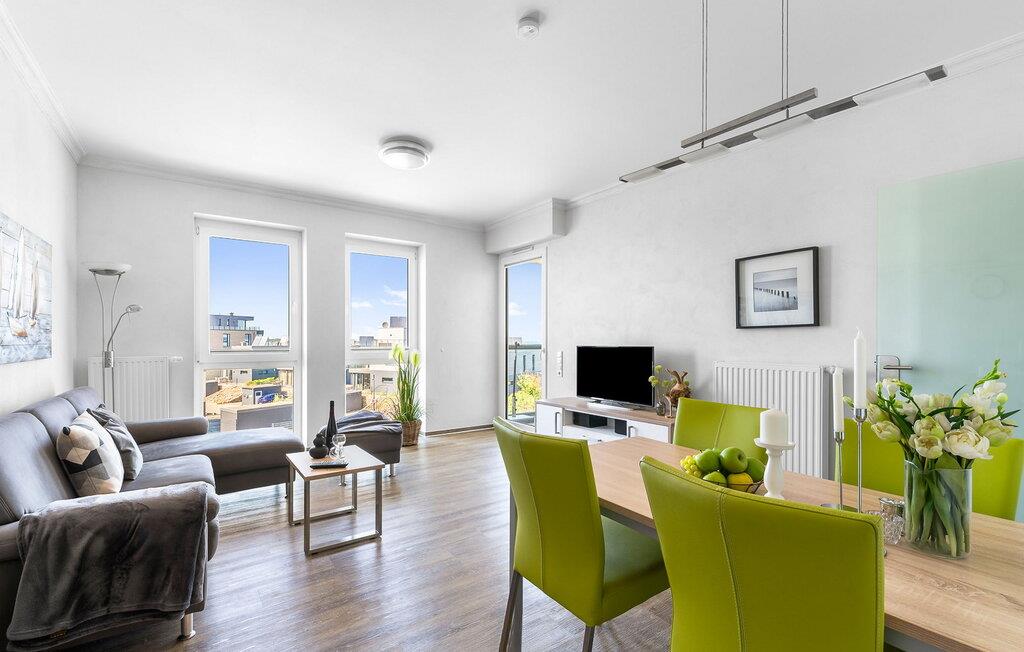 Die voll ausgestattete Küche bietet alles, was ihr für euren Aufenthalt benötigt, einschließlich Geschirrspüler und Mikrowelle. Der separate Essbereich hat Platz für bis zu 4 Personen. Von allen Fenstern aus genießt ihr den herrlichen Blick auf den Hafen und die Ostsee.