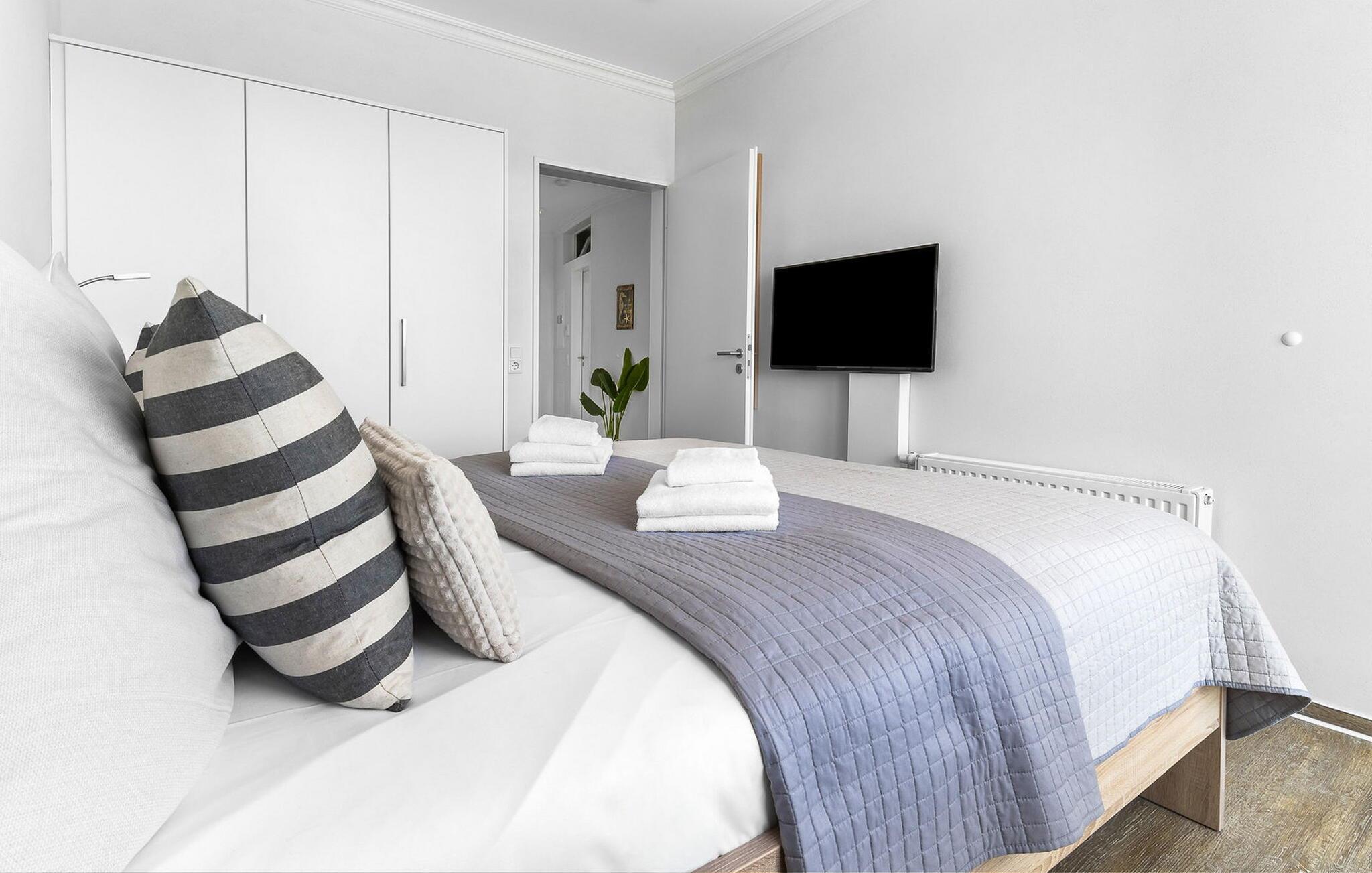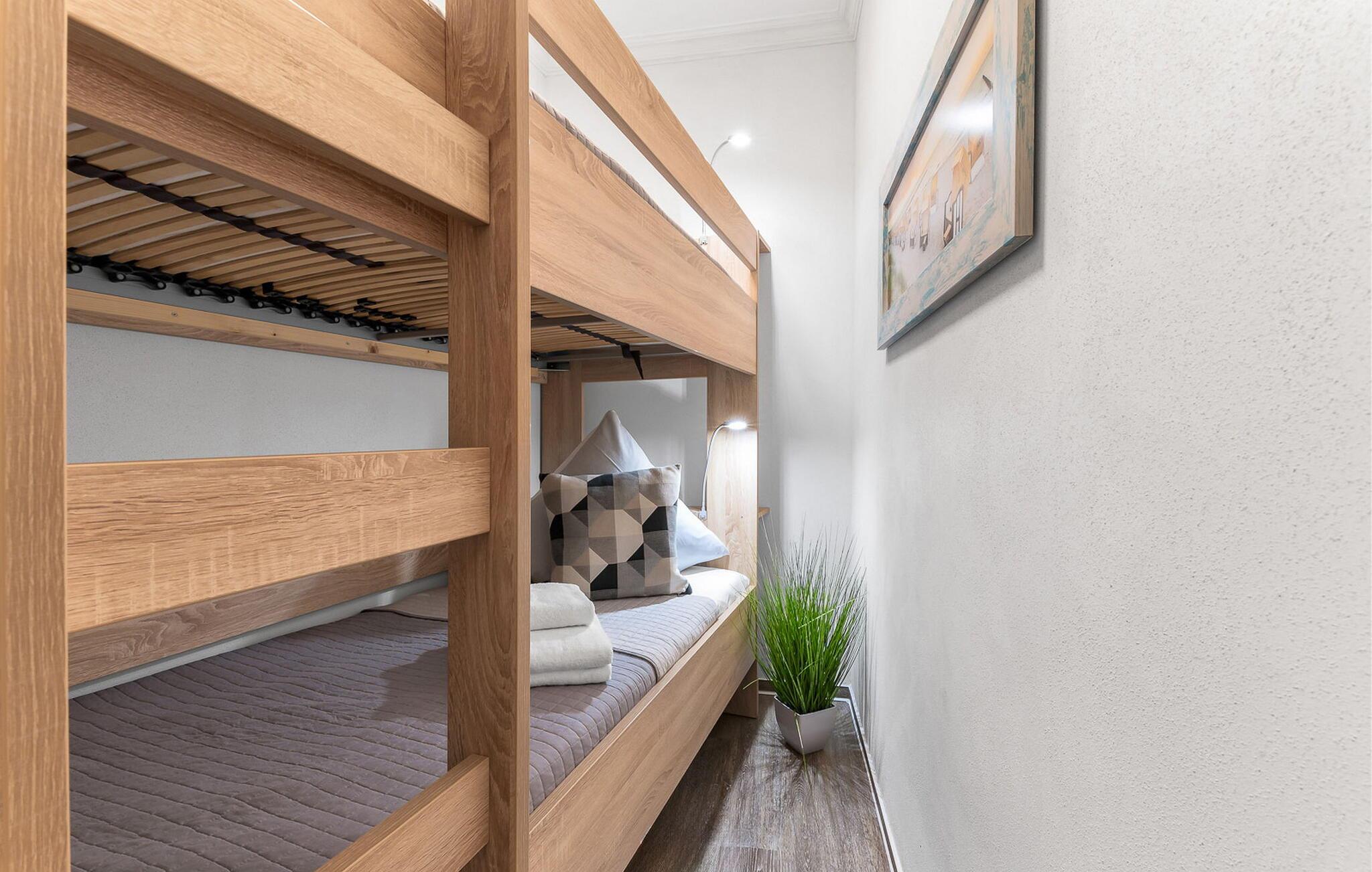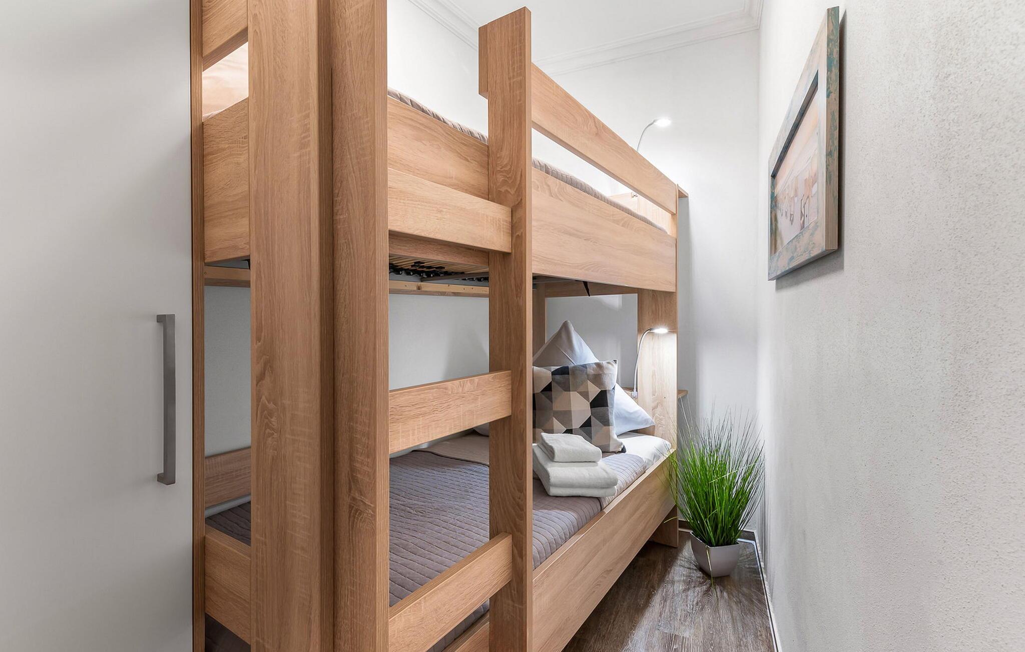 Das Schlafzimmer ist mit einem großen Doppelbett (180 cm x 200 cm) und einem weiteren 40-Zoll-Fernseher, sowie einem Safe für persönliche Gegenstände ausgestattet. Ein zusätzliches Zimmer verfügt über ein Etagenbett (90 cm x 200 cm), ideal für Kinder oder zusätzliche Gäste. Das Badezimmer ist modern gestaltet und verfügt über eine Dusche und ein WC.
