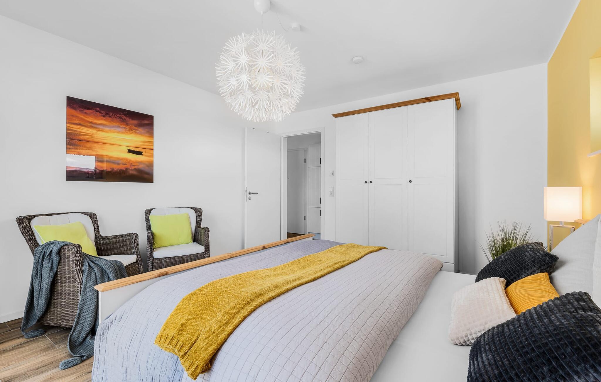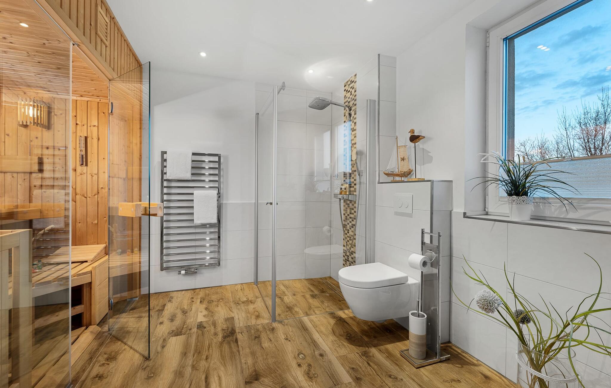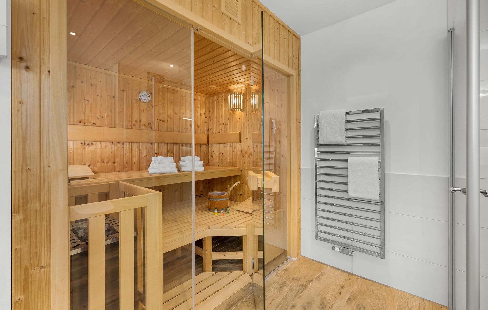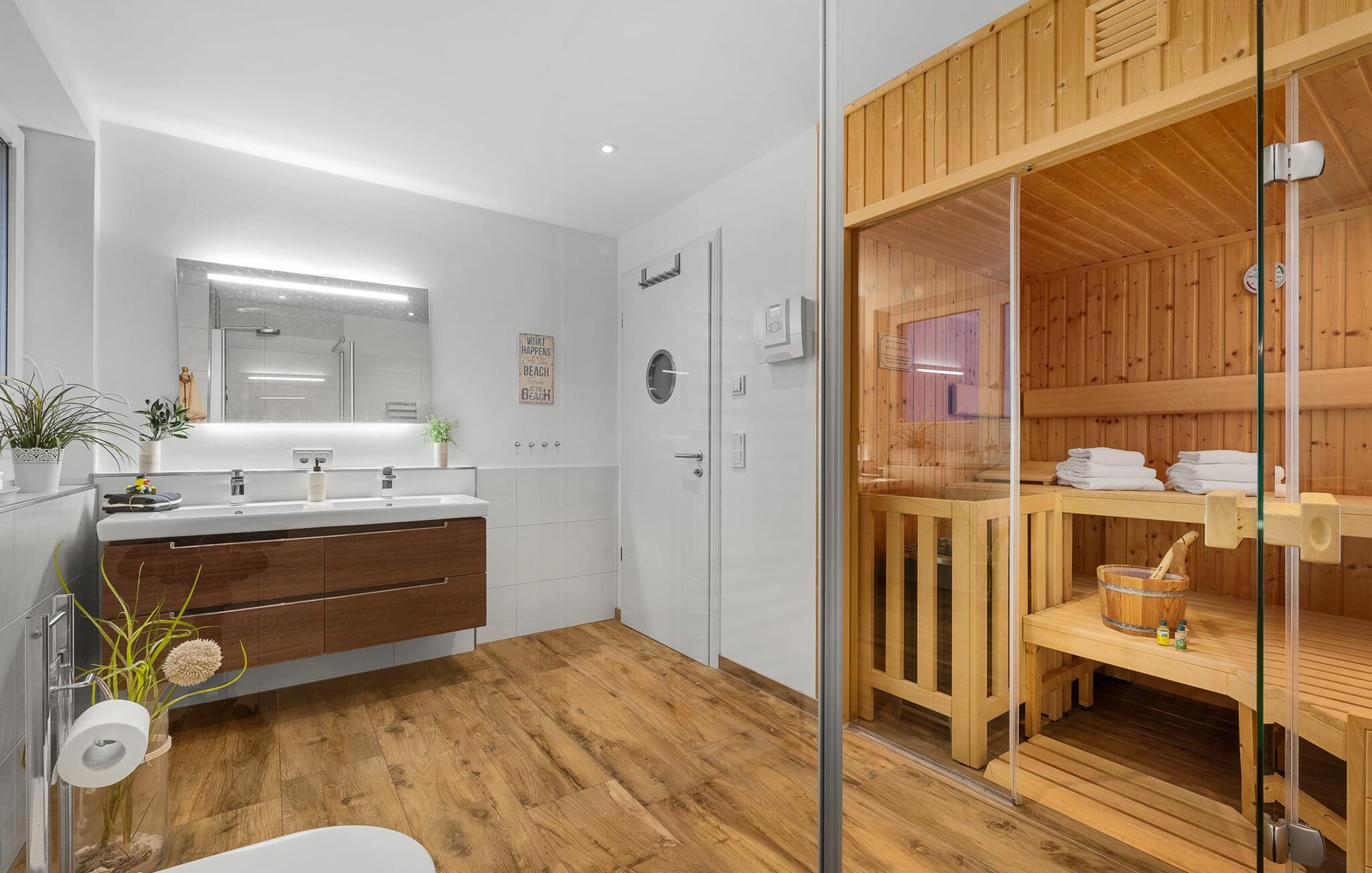 Ein besonderes Highlight ist das Badezimmer: Es verfügt nicht nur über eine bodentiefe und sehr große Regendusche, sondern auch über eine finnische Blocksauna, die bis zu vier Personen Platz bietet. Die beiden Schlafzimmer sind jeweils mit einem gemütlichen Doppelbett, einem Kleiderschrank und bodentiefen Fenstern ausgestattet.