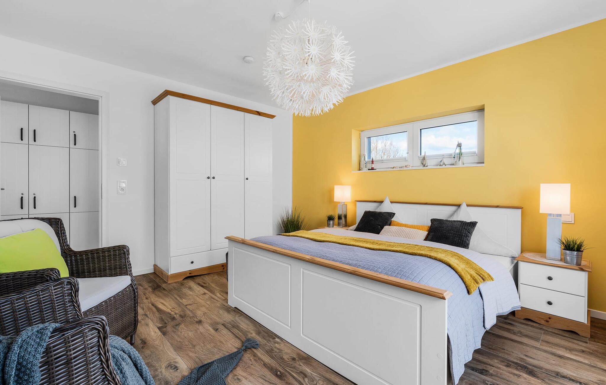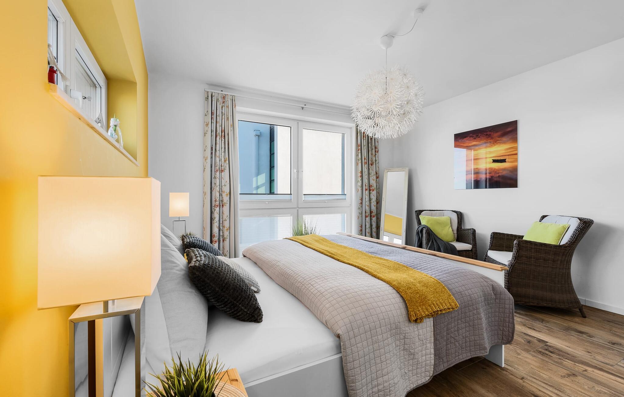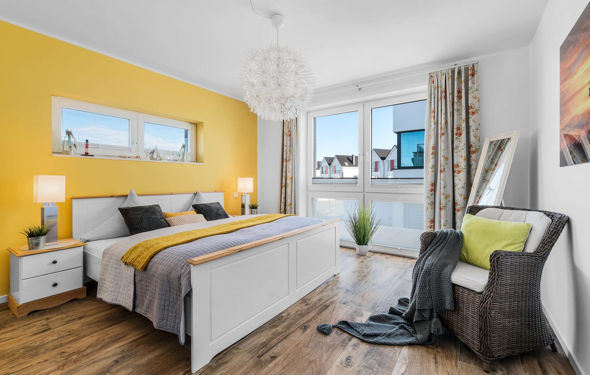 Ein besonderes Highlight ist das Badezimmer: Es verfügt nicht nur über eine bodentiefe und sehr große Regendusche, sondern auch über eine finnische Blocksauna, die bis zu vier Personen Platz bietet. Die beiden Schlafzimmer sind jeweils mit einem gemütlichen Doppelbett, einem Kleiderschrank und bodentiefen Fenstern ausgestattet.