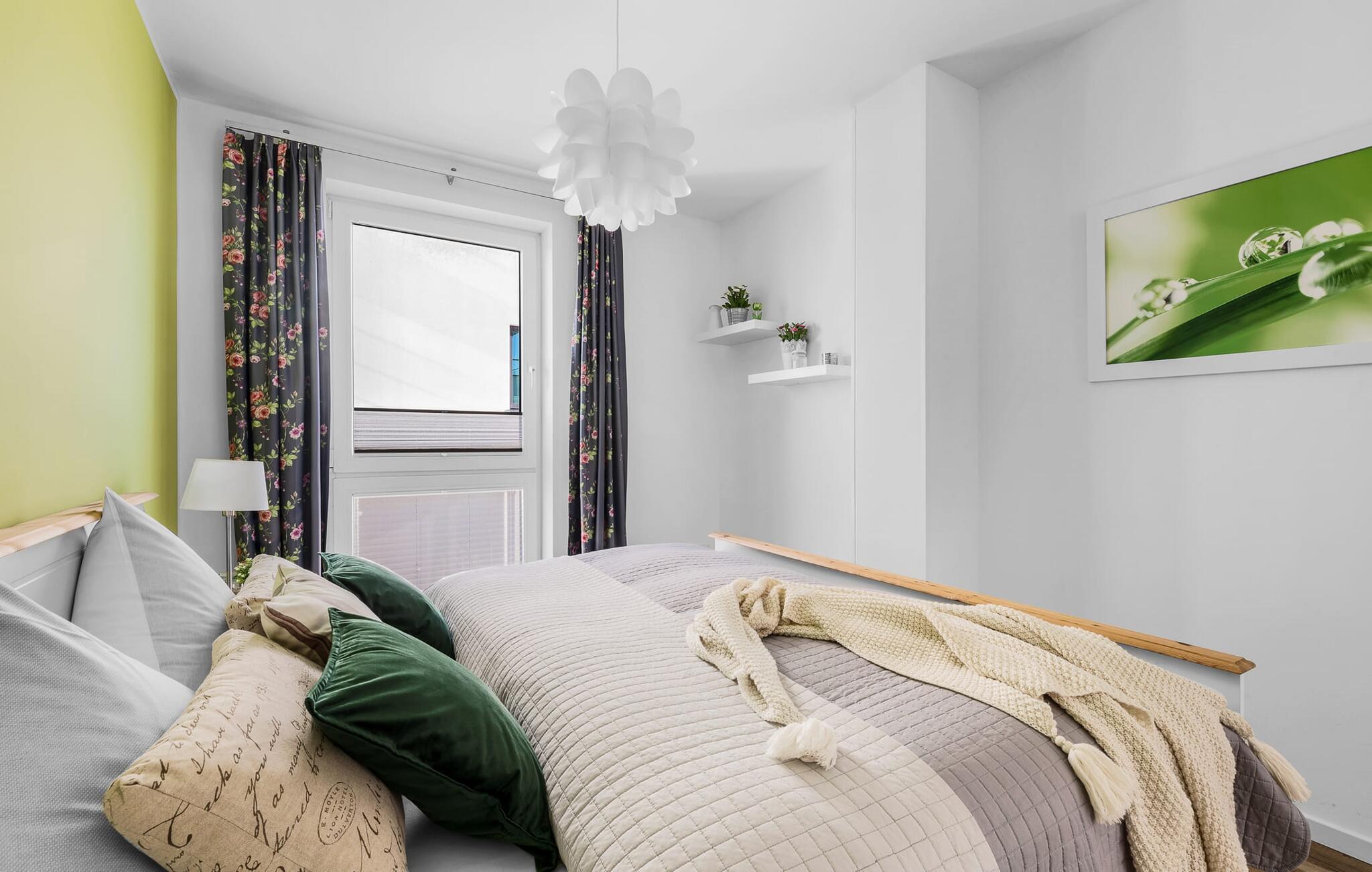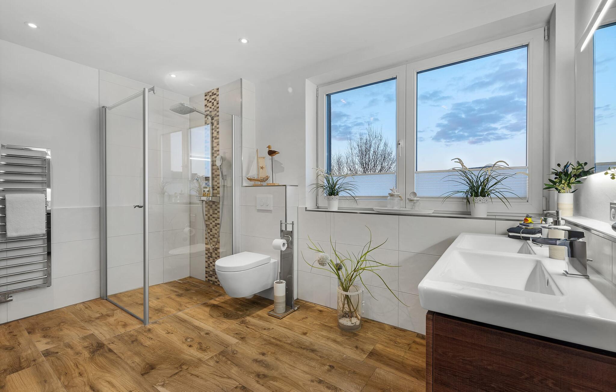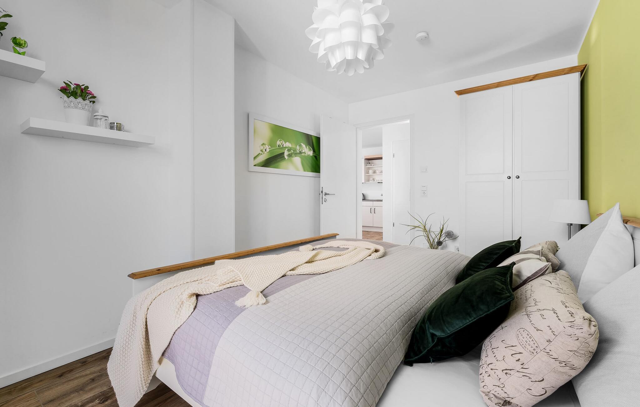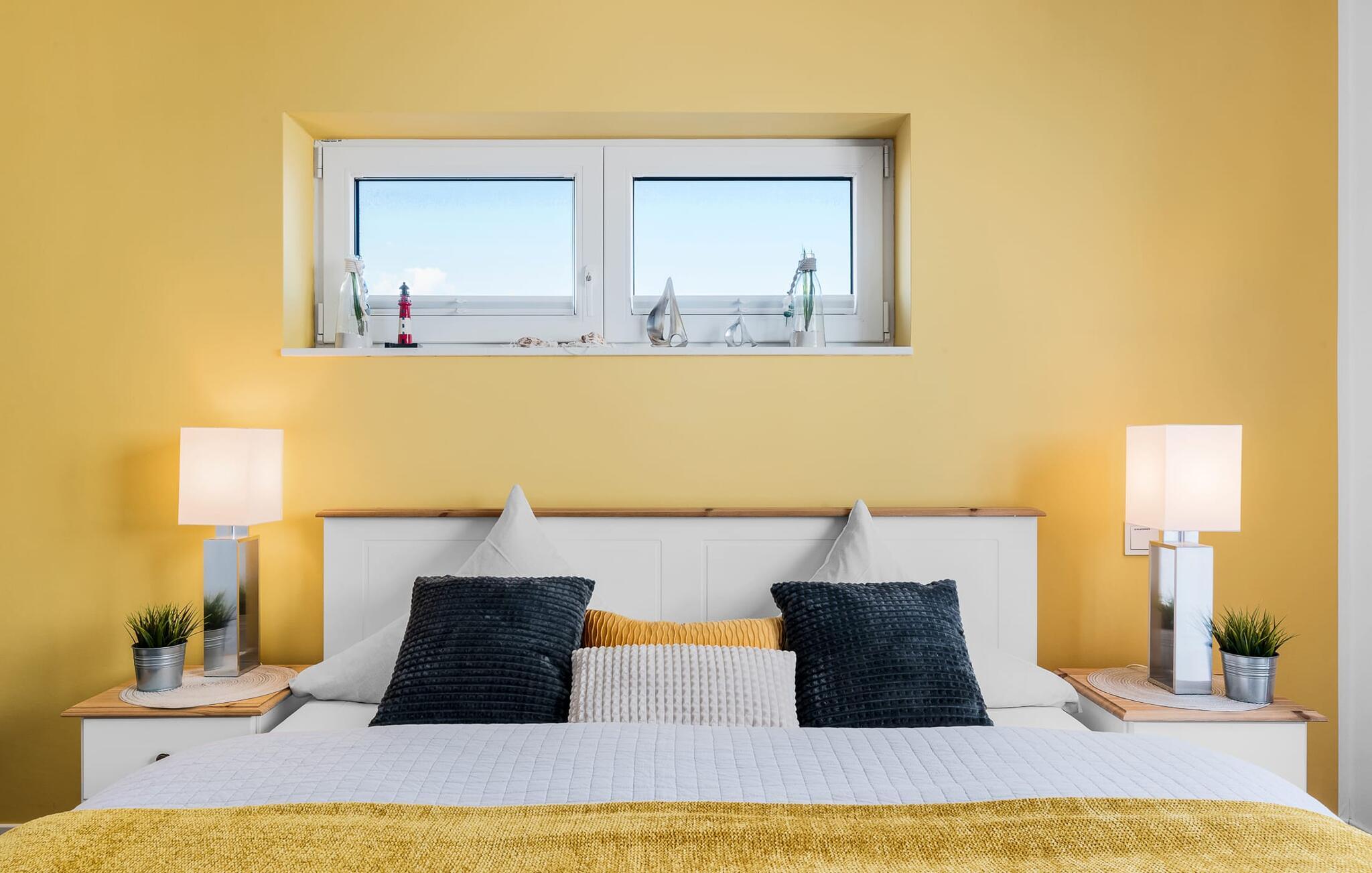 Ein besonderes Highlight ist das Badezimmer: Es verfügt nicht nur über eine bodentiefe und sehr große Regendusche, sondern auch über eine finnische Blocksauna, die bis zu vier Personen Platz bietet. Die beiden Schlafzimmer sind jeweils mit einem gemütlichen Doppelbett, einem Kleiderschrank und bodentiefen Fenstern ausgestattet.