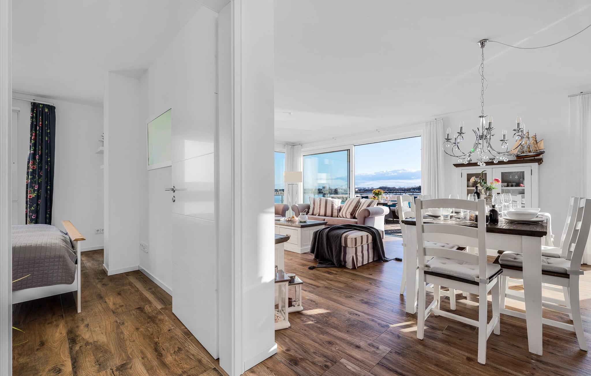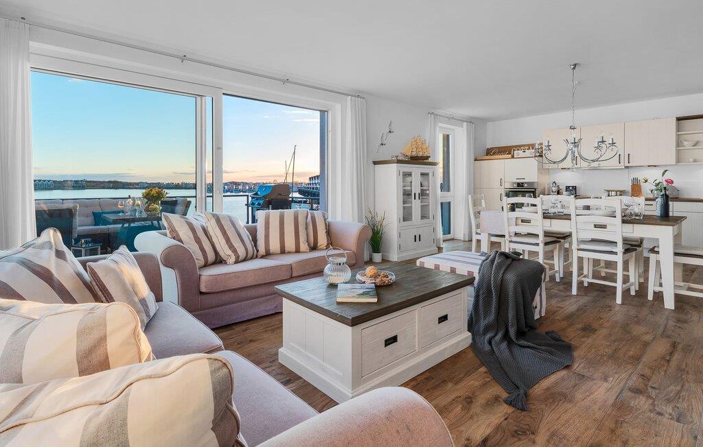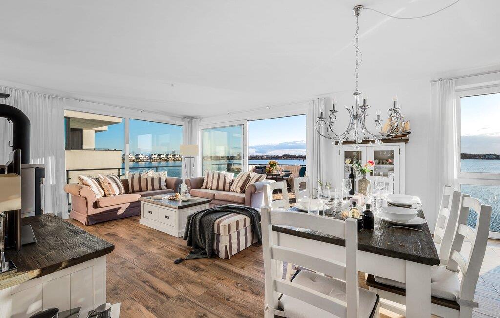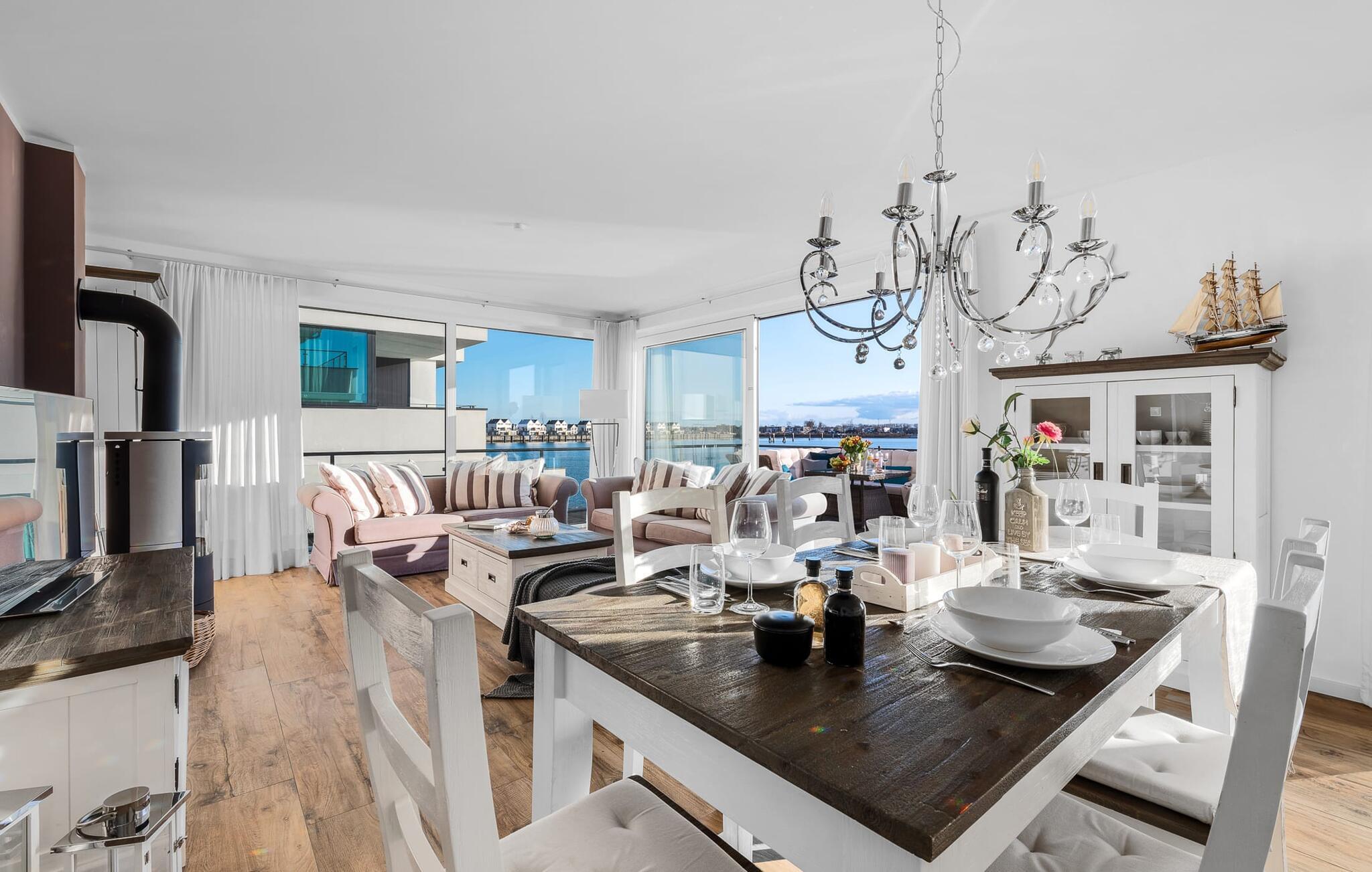 Die Ferienwohnung MULLEWAPP für 4 Personen besticht nicht nur durch ihre komfortable und behagliche Ausstattung im Landhaus-Stil, sondern vor allem durch ihre einzigartige Lage. Egal wohin man schaut, überall ist Wasser: Nach vorne fällt der Blick auf den großen Segel- und Sportboothafen, in dem bei schönem Wetter immer etwas los ist. Abends genießt man in den gemütlichen Dining-Loungemöbeln des 30 qm großen Balkons den Sonnenuntergang über der Schlei. Ob in geselliger Grillrunde oder beim romantischen Candle-Light-Dinnerein traumhafter Blick und Entspannung pur sind garantiert. Bei schönem Wetter gibt’s aufgrund der Süd-West-Lage Sonne satt. Bis zum feinsandigen Privatstrand sind es gerade mal 300 Meter.