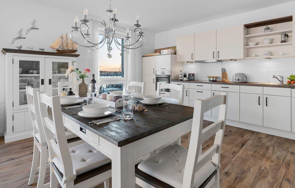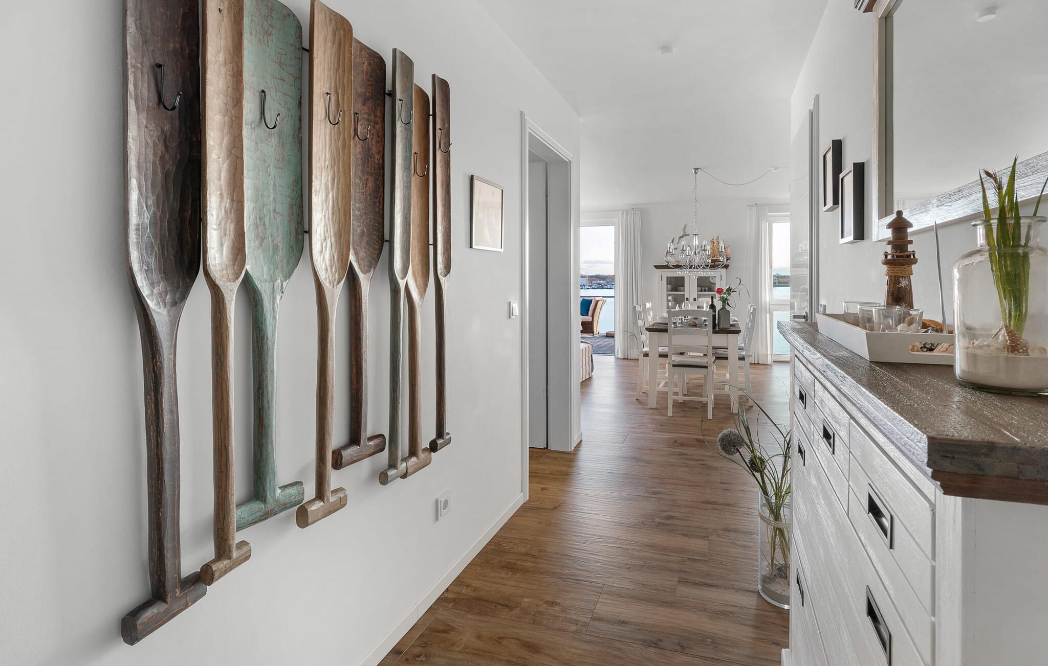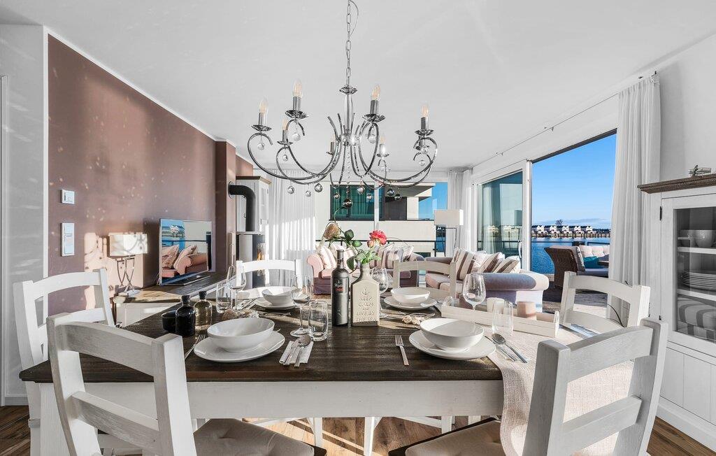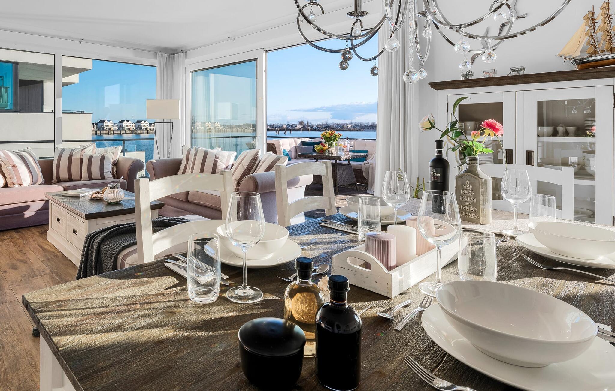 Die Ferienwohnung MULLEWAPP für 4 Personen besticht nicht nur durch ihre komfortable und behagliche Ausstattung im Landhaus-Stil, sondern vor allem durch ihre einzigartige Lage. Egal wohin man schaut, überall ist Wasser: Nach vorne fällt der Blick auf den großen Segel- und Sportboothafen, in dem bei schönem Wetter immer etwas los ist. Abends genießt man in den gemütlichen Dining-Loungemöbeln des 30 qm großen Balkons den Sonnenuntergang über der Schlei. Ob in geselliger Grillrunde oder beim romantischen Candle-Light-Dinnerein traumhafter Blick und Entspannung pur sind garantiert. Bei schönem Wetter gibt’s aufgrund der Süd-West-Lage Sonne satt. Bis zum feinsandigen Privatstrand sind es gerade mal 300 Meter.