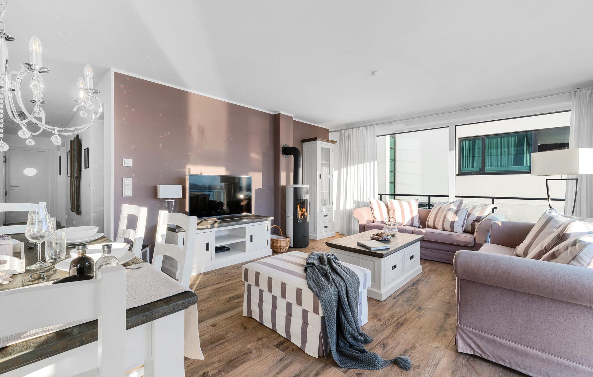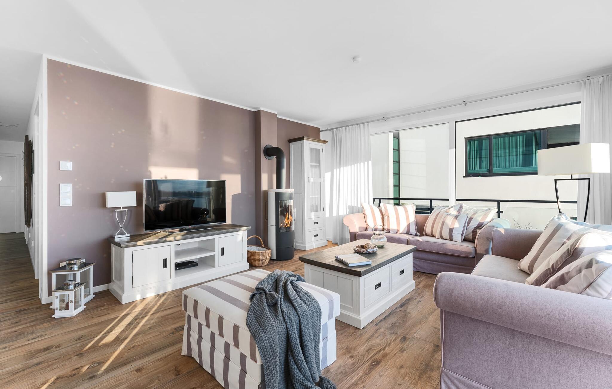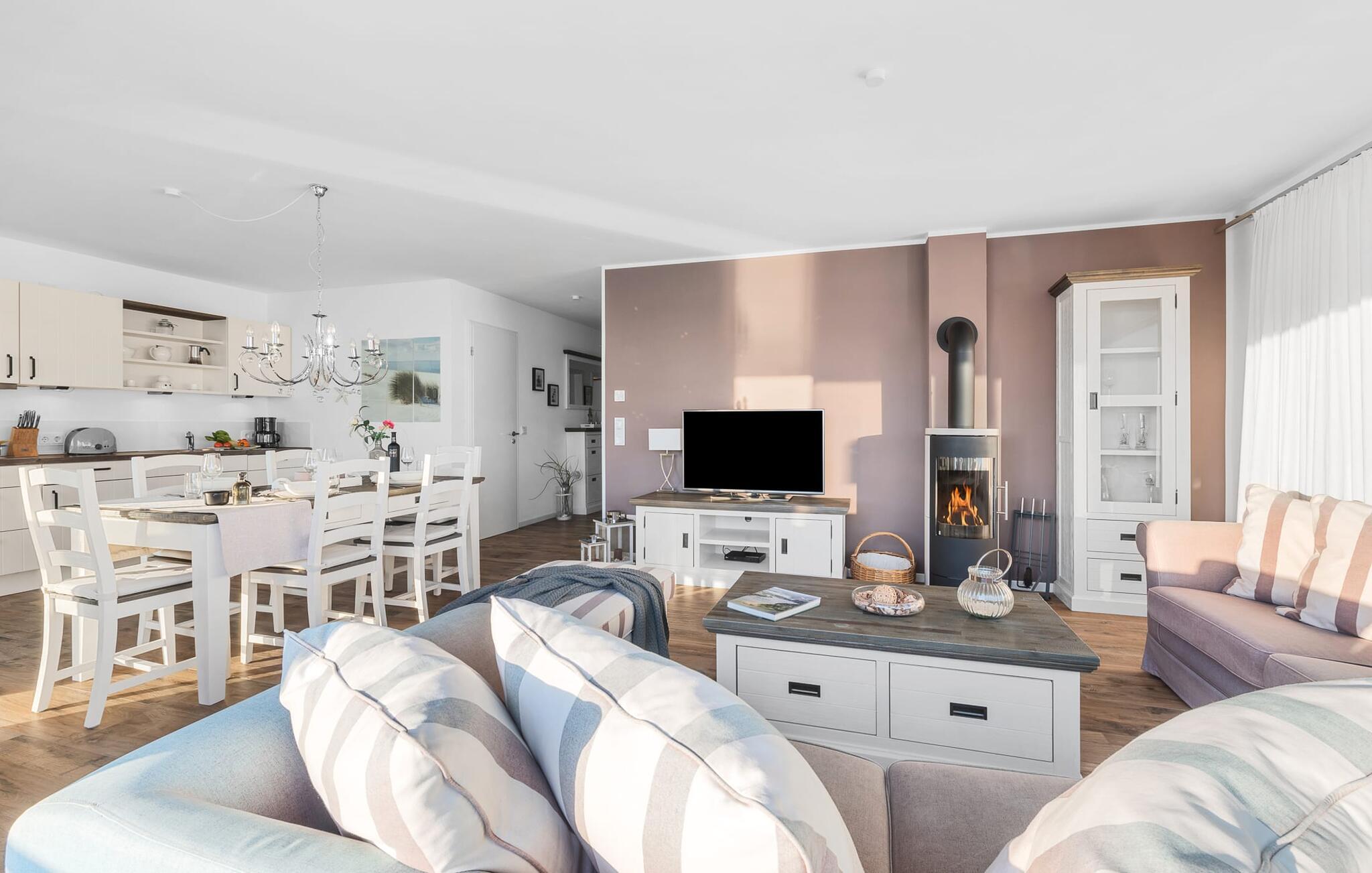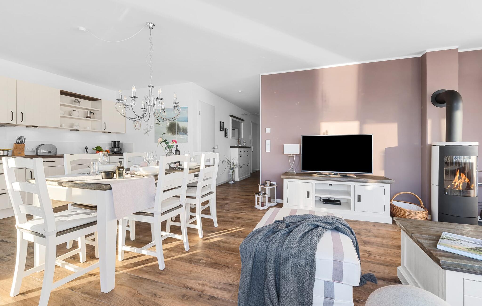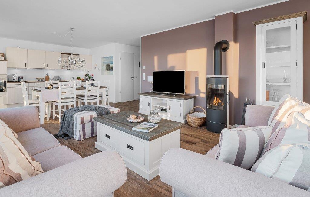 Die individuell eingerichtete und lichtdurchflutete Ferienwohnung befindet sich auf einer Ebene im ersten Stock einer Strandvilla und ist über einen Aufzug für alle leicht zugänglich. Der großzügige Wohn-/Essbereich lädt stets zu gemütlichen Stunden ein. Sollte sich das Wetter einmal nicht von seiner sonnigen Seite zeigen, sorgen die Fußbodenheizung in allen Räumen und der Kaminofen für eine behagliche Atmosphäre. Die bestens ausgestattete und in den Wohn-/Essbereich integrierte Küche lässt keine Wünsche offen. Das superschnelle WLAN ist in allen Räumen verfügbar.