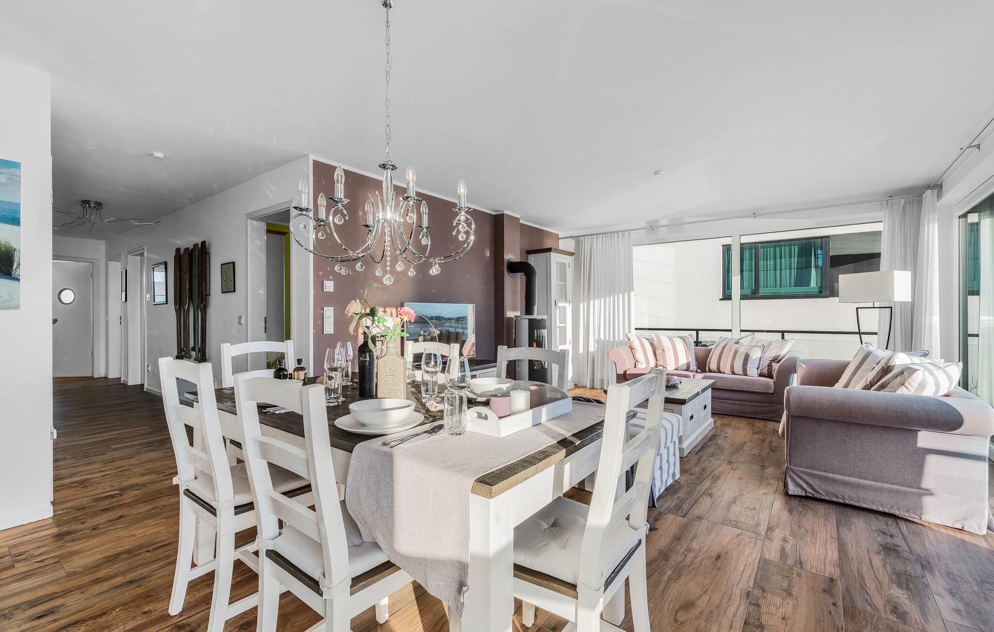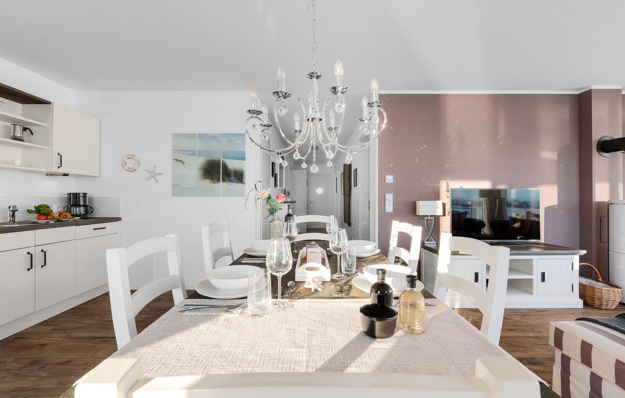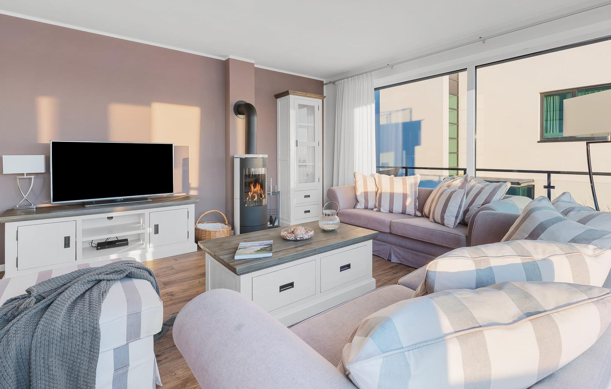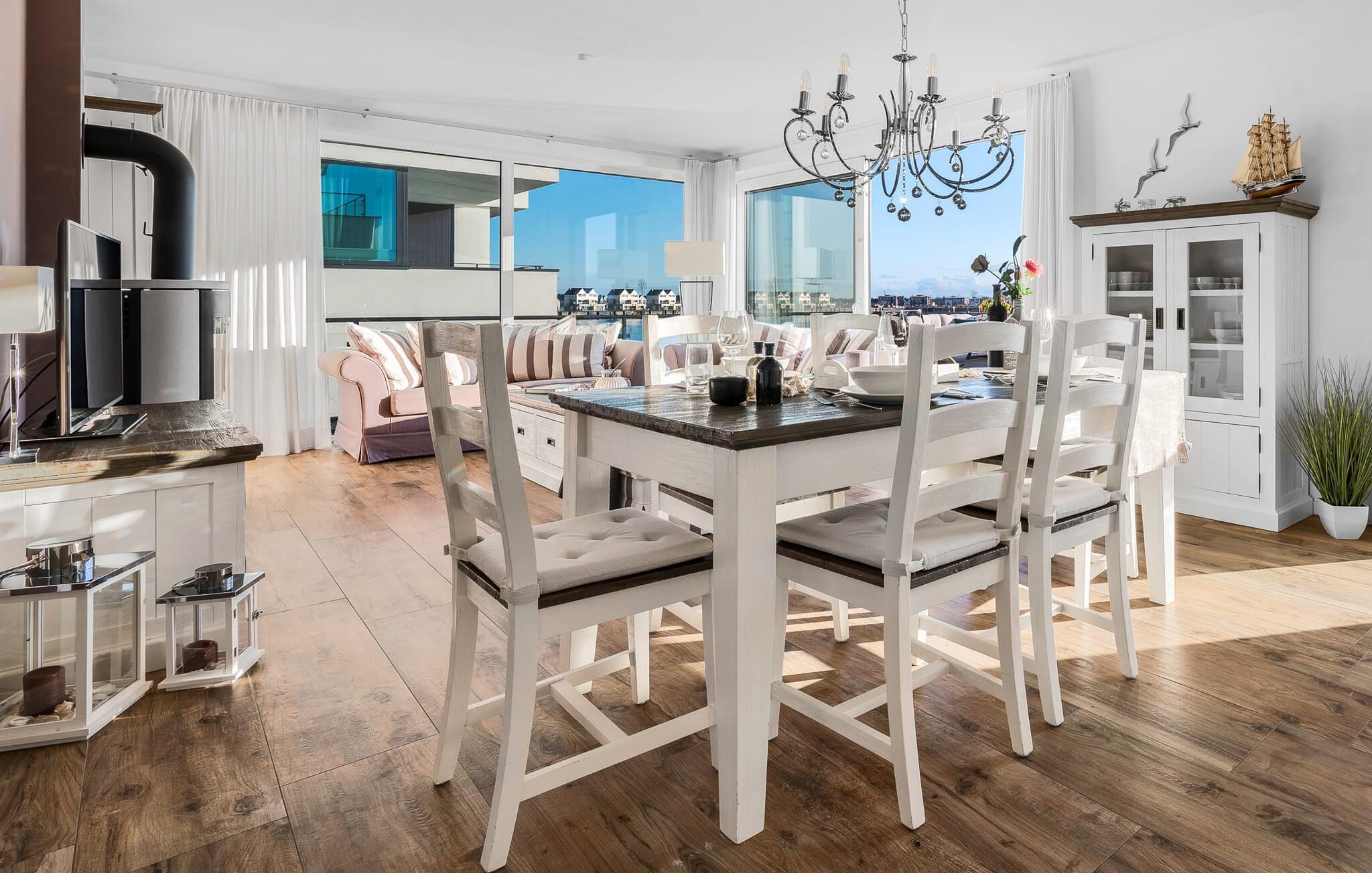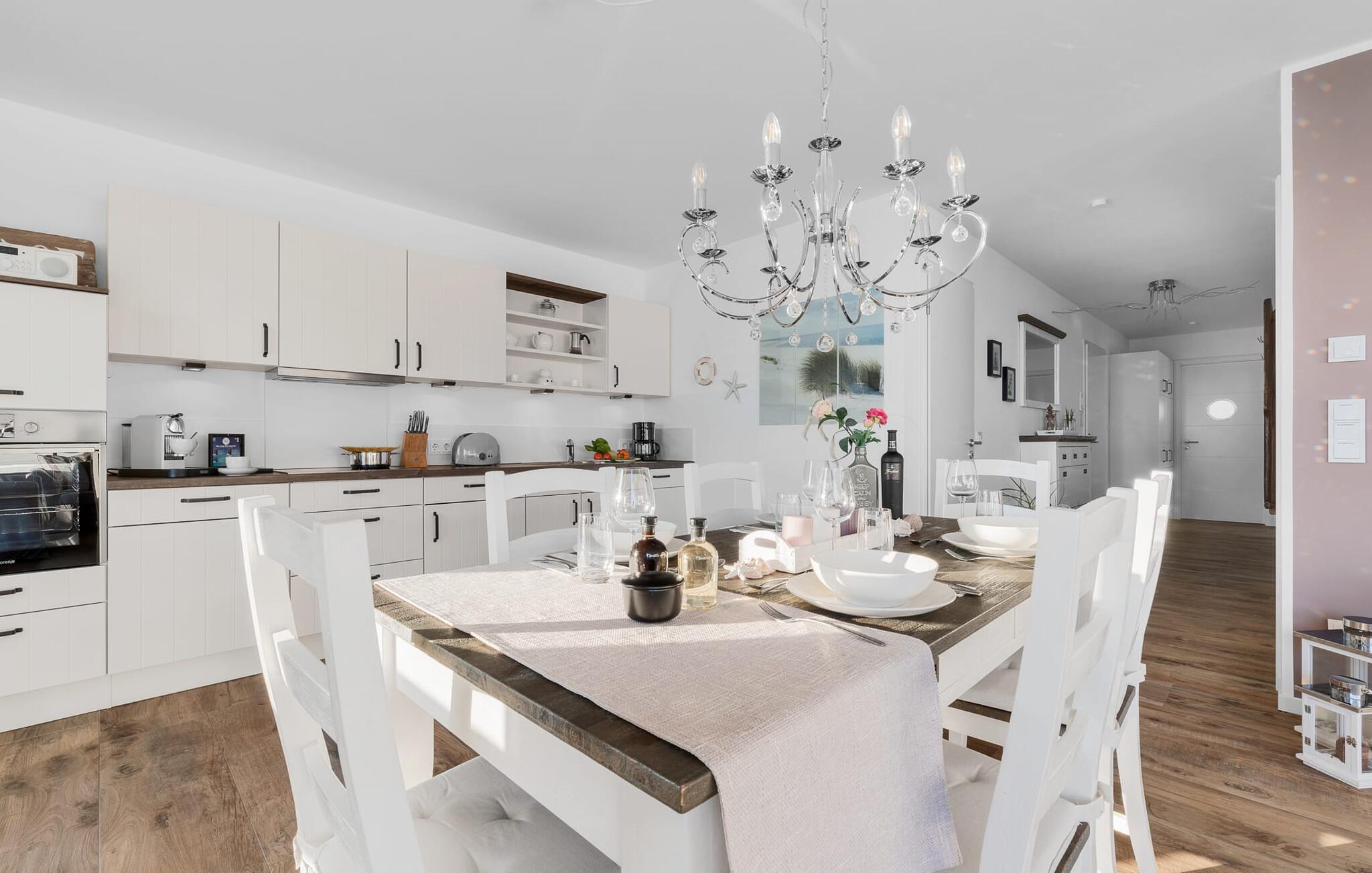 Die individuell eingerichtete und lichtdurchflutete Ferienwohnung befindet sich auf einer Ebene im ersten Stock einer Strandvilla und ist über einen Aufzug für alle leicht zugänglich. Der großzügige Wohn-/Essbereich lädt stets zu gemütlichen Stunden ein. Sollte sich das Wetter einmal nicht von seiner sonnigen Seite zeigen, sorgen die Fußbodenheizung in allen Räumen und der Kaminofen für eine behagliche Atmosphäre. Die bestens ausgestattete und in den Wohn-/Essbereich integrierte Küche lässt keine Wünsche offen. Das superschnelle WLAN ist in allen Räumen verfügbar.