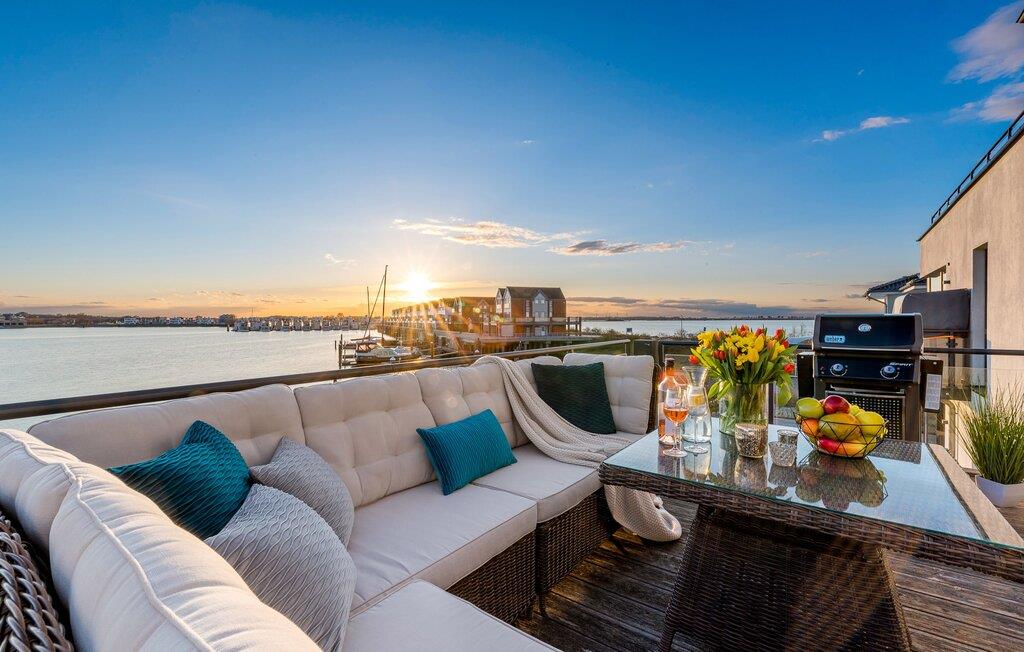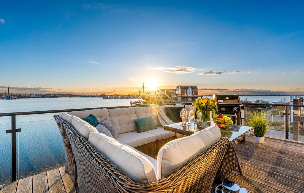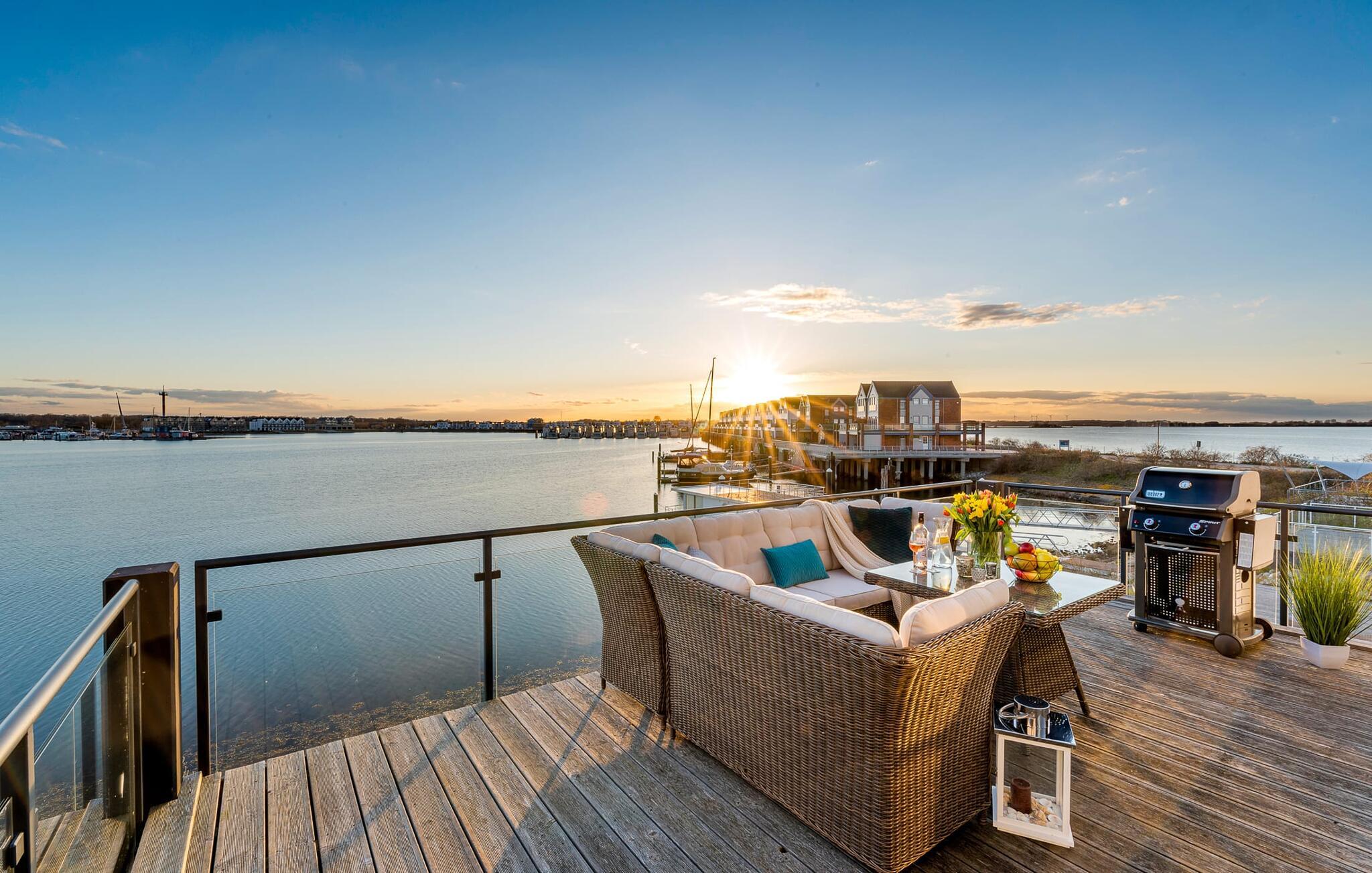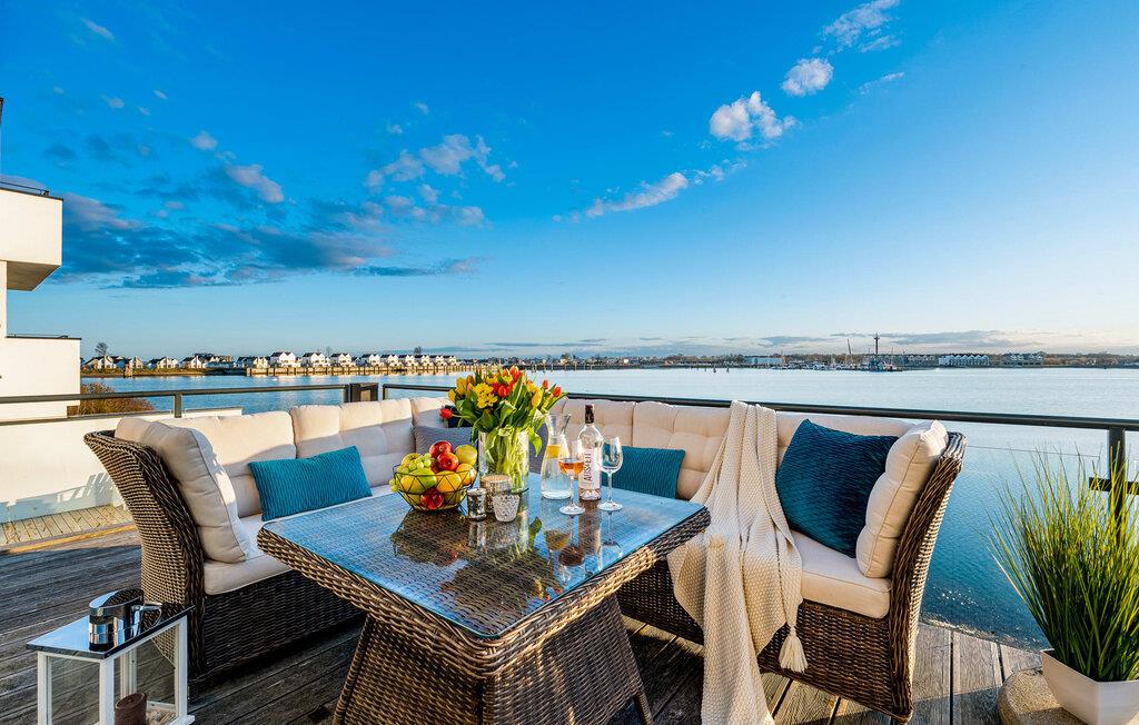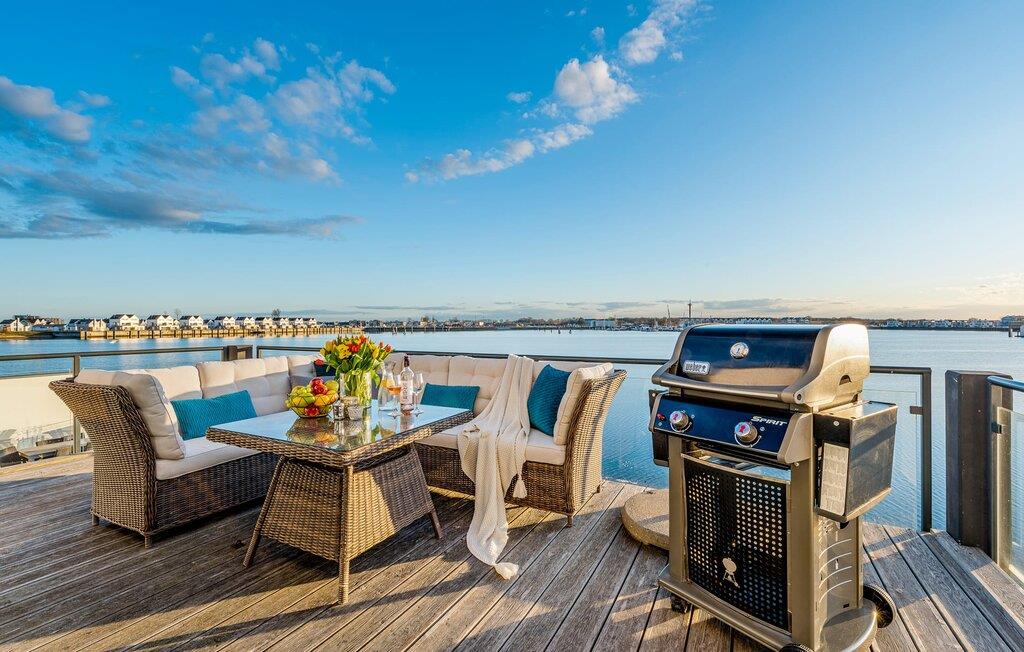 Unser Lieblingsplatz: auf dem großen Balkon bei einem Grillabend das muntere Treiben im Hafen oder den Sonnenuntergang über der Schlei genießen.