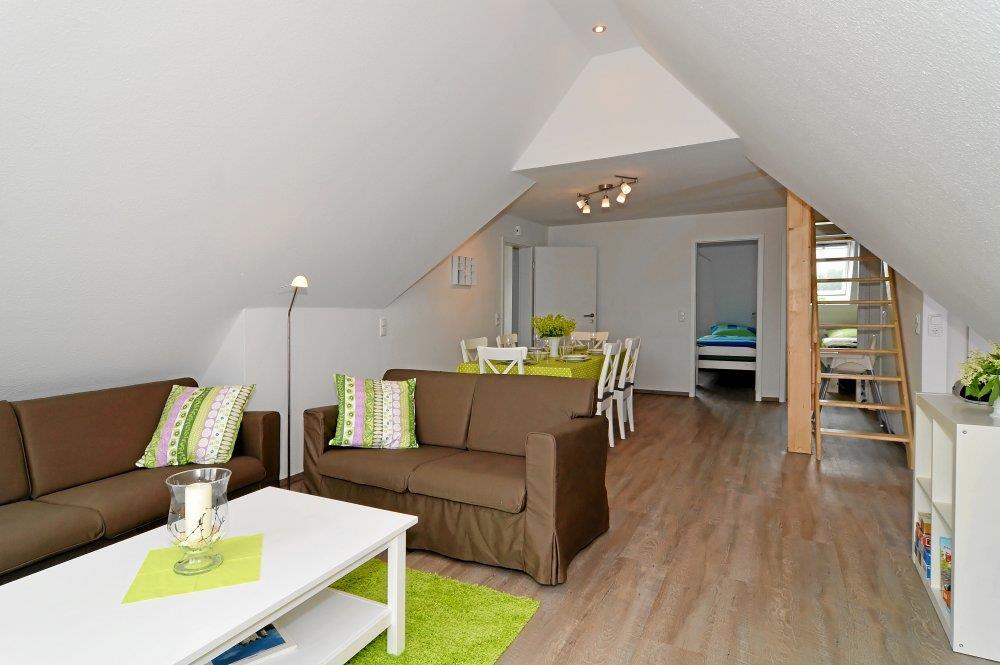 Es erwartet Sie eine helle, komfortabel und modern eingerichtete, ruhige Ferienwohnung mit schönen Blick auf die idyllische Landschaft Angelns. Die Ferienwohnung wurde 2013 komplett neu im Dachgeschoss unseres Bauernhauses errichtet. Vor dem Haus befindet sich ein großer Parkplatz, von dem man über eine Treppe ins Dachgeschoss zur Ferienwohnung "Eulennest" gelangt. Wir haben sie so genannt , weil in der Nähe ein Schleiereulenpärchen jedes Jahr seine Jungen aufzieht. Hinter der Eingangstür finden Sie eine großzügige und helle Ferienwohnung. Das Tolle: Vor dem Haus parken Sie und hinter dem Haus erwartet Sie eine 21m² große Dachterrasse von der eine Wendeltreppe direkt in den Garten führt. Dort gibt es viel Platz zum Spielen und Herumtollen, aber auch zum Ausspannen mit u.a. einer Liegewiese und Spielgeräten für die Kinder. Die Wohnung ist modern und mit vielen netten Details eingerichtet.