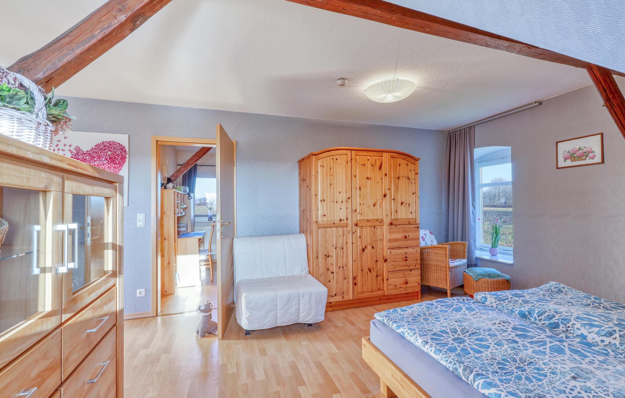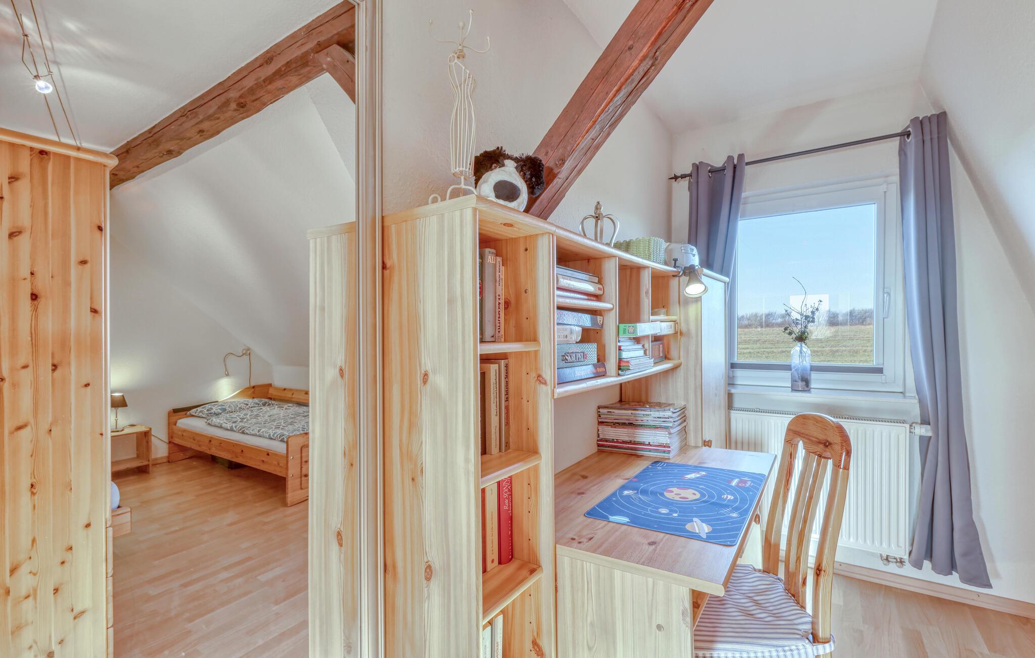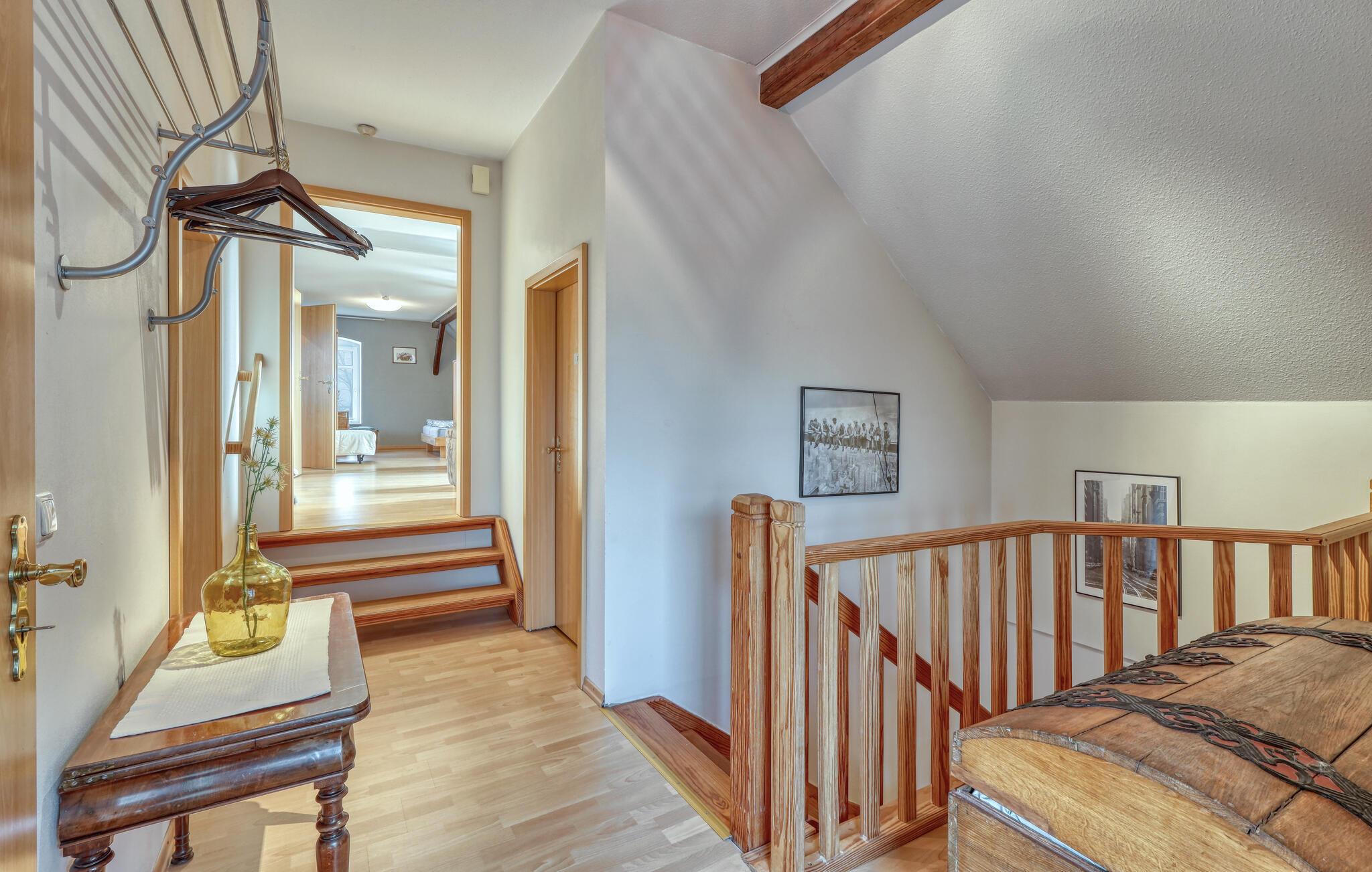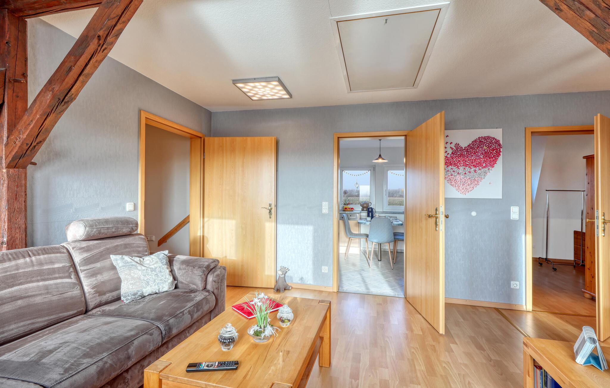 Diese lichtdurchflutete Ferienwohnung im ersten Stock bietet Ihnen eine einladende und offene Gestaltung mit anprechenden Holzmöbeln. Große Fenster lassen viel Tageslicht herein und sorgen für eine angenehme Wohnatmosphäre. Entspannen Sie sich nach Ihren Ausflügen auf dem Sofa und genießen das Ambiente mit sichtbarem Fachwerk. In der gut ausgestatteten Küche können Sie gemeinsam kochen und Ihre Mahlzeiten anschließend auf der Terrasse genießen. Der Garten mit Grill lädt Sie zu entspannten Stunden im Freien ein – perfekt für gemütliche Sommerabende in idyllischer Umgebung.