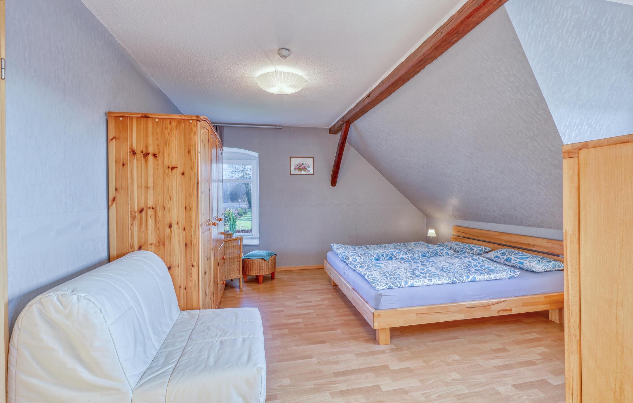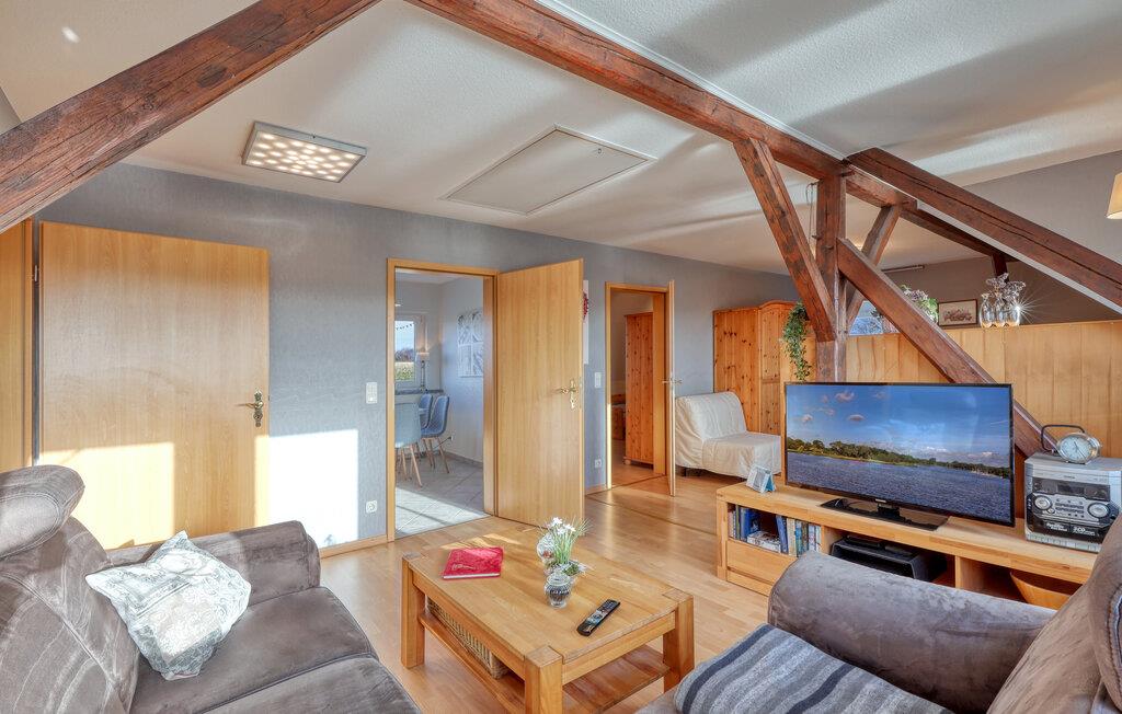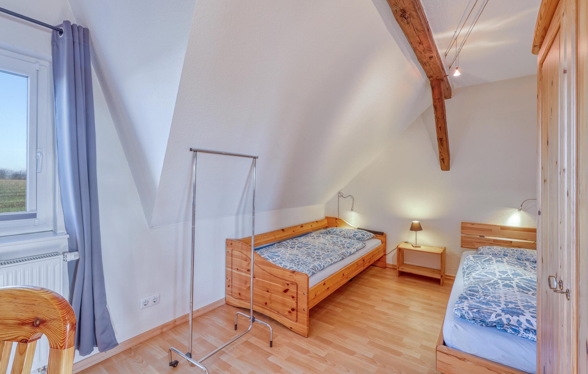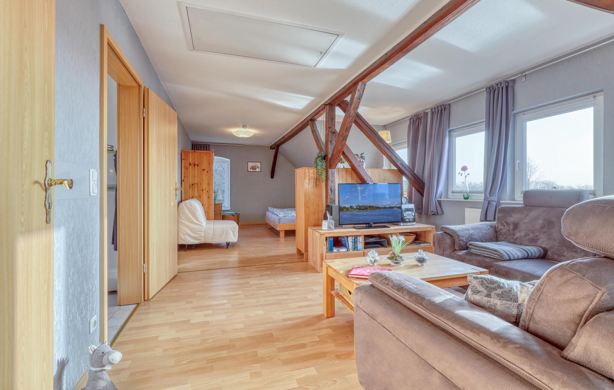 Diese lichtdurchflutete Ferienwohnung im ersten Stock bietet Ihnen eine einladende und offene Gestaltung mit anprechenden Holzmöbeln. Große Fenster lassen viel Tageslicht herein und sorgen für eine angenehme Wohnatmosphäre. Entspannen Sie sich nach Ihren Ausflügen auf dem Sofa und genießen das Ambiente mit sichtbarem Fachwerk. In der gut ausgestatteten Küche können Sie gemeinsam kochen und Ihre Mahlzeiten anschließend auf der Terrasse genießen. Der Garten mit Grill lädt Sie zu entspannten Stunden im Freien ein – perfekt für gemütliche Sommerabende in idyllischer Umgebung.