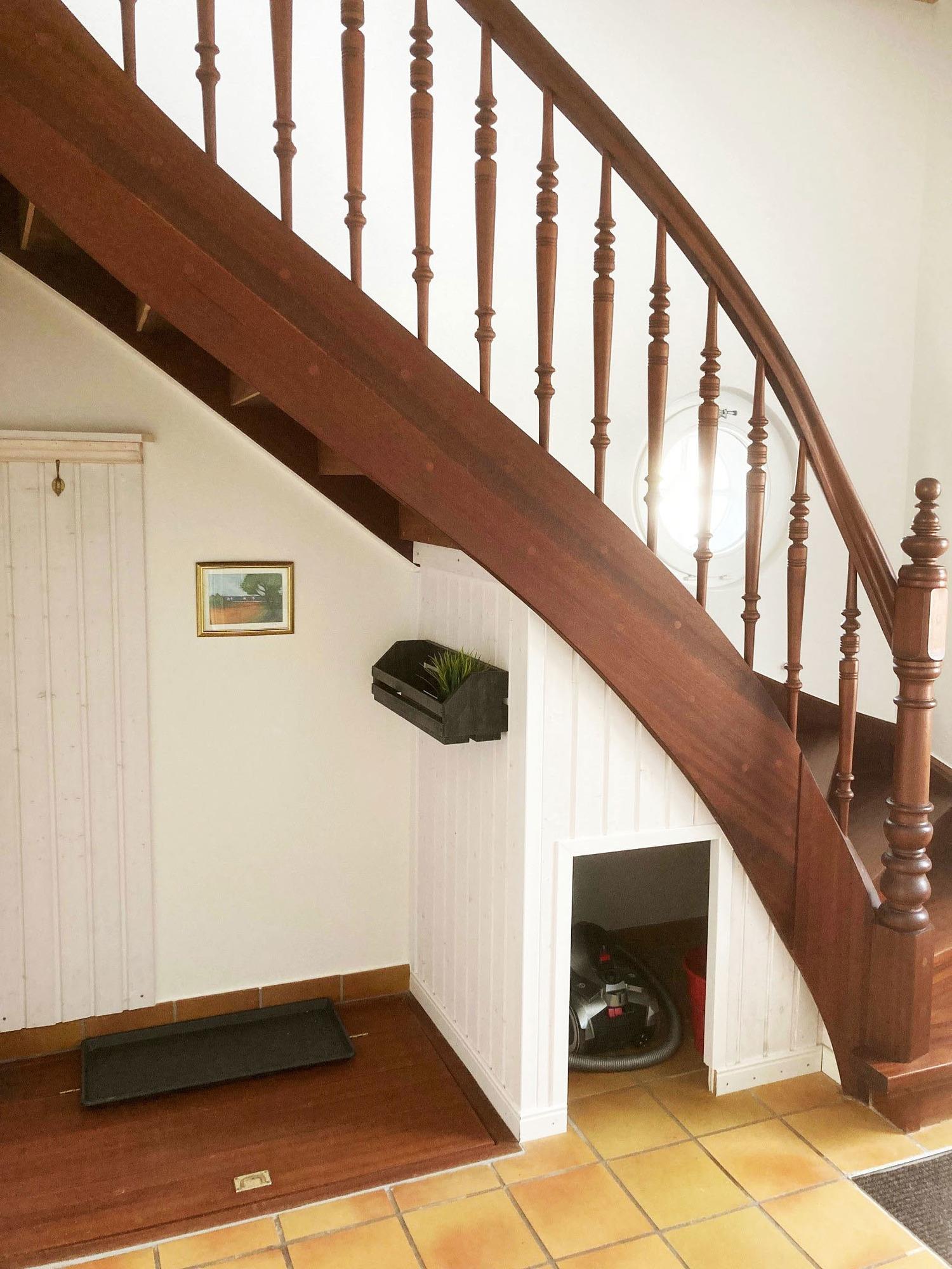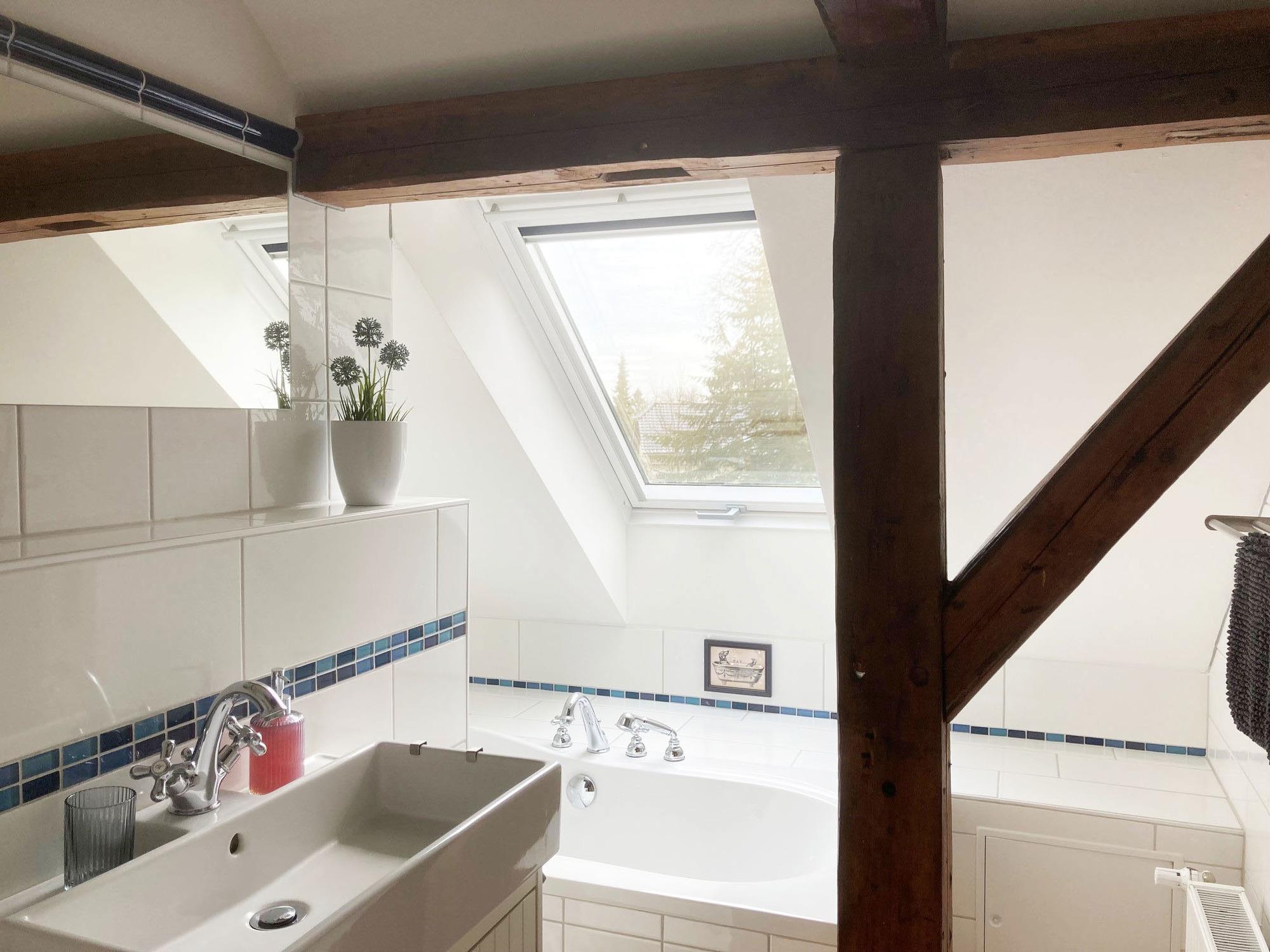 Die "Parkwohnung" ist eine eigenständige Ferienwohnung im Landhaus. Die Wohnung erstreckt sich über das Erd- und Dachgeschoss. Die Wohnung besteht im Erdgeschoss aus einem offenen Wohn- und Esszimmer mit antikem Kachelofen, einer voll ausgestatteten Küche, einem Duschbad und einer Diele. Die Küche verfügt über einen Backofen mit Kochfeld, einen Geschirrspüler und einen Kühl- und Gefrierschrank. Angrenzend an das Wohnzimmer ist eine großzügige Süd-Westterrasse mit Sitzecke und Grill. Im Dachgeschoss befinden sich zwei Schlafräume. Der eine mit Doppelbett der andere mit zwei freistehenden Einzelbetten. Beide Schlafzimmer sind mit einem TV Gerät ausgestattet. Das Schlafzimmer mit Doppelbett hat ein angeschlossenes Ensuite Bad mit Badewanne. Des Weiteren befindet sich im Dachgeschoss ein Durchgangsraum mit Schreibtisch und Spielecke. Aus der Ferienwohnung blickt man in den großen grünen parkähnlichen Garten. Die Fußböden sind aus geölten Holzdielen oder rustikalen Fliesen in warmen Farben. Große Fenster lassen viel Tageslicht in die helle Wohnung. Genießen Sie von der großzügigen Terrasse das Rauschen der Blätter, das vielstimmige Vogelkonzert, das Spiel von Licht und Schatten und den Blick in die Bäume und den schleswig-holsteinischen Himmel. Zu der Wohnung gehört eine sehr große voll möblierte Terrasse mit Sonnenliege, Tisch und Stühlen, sowie Grill und Sonnenschirm. Das gesamte Grundstück mit Grillplatz und Spielplatz steht zur Verfügung. Fahrräder und Angelausrüstung können unter Dach (verschließbar) abgestellt werden.