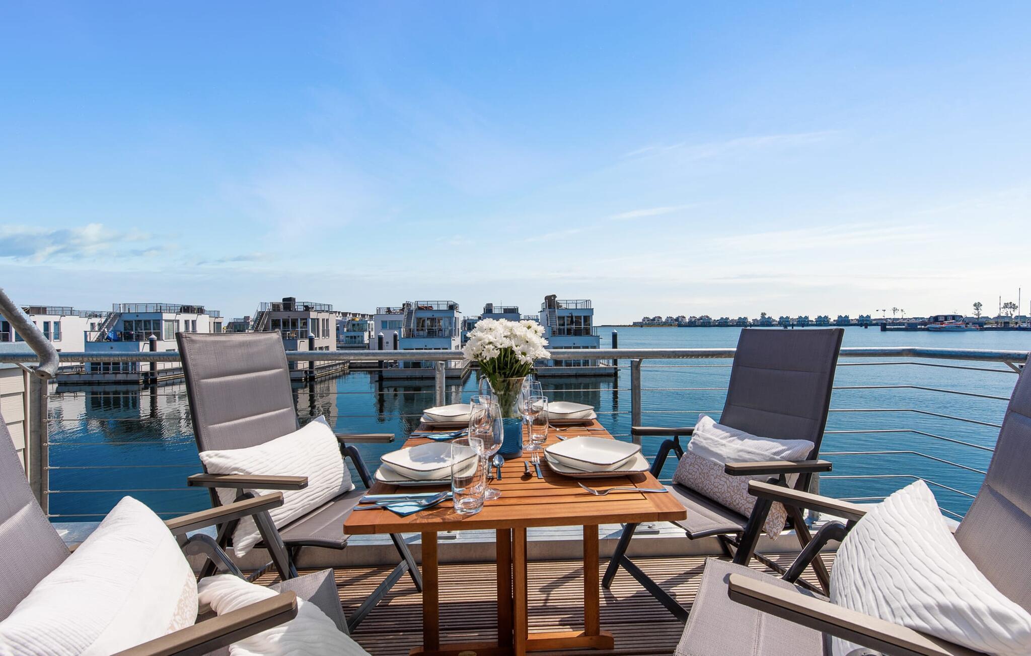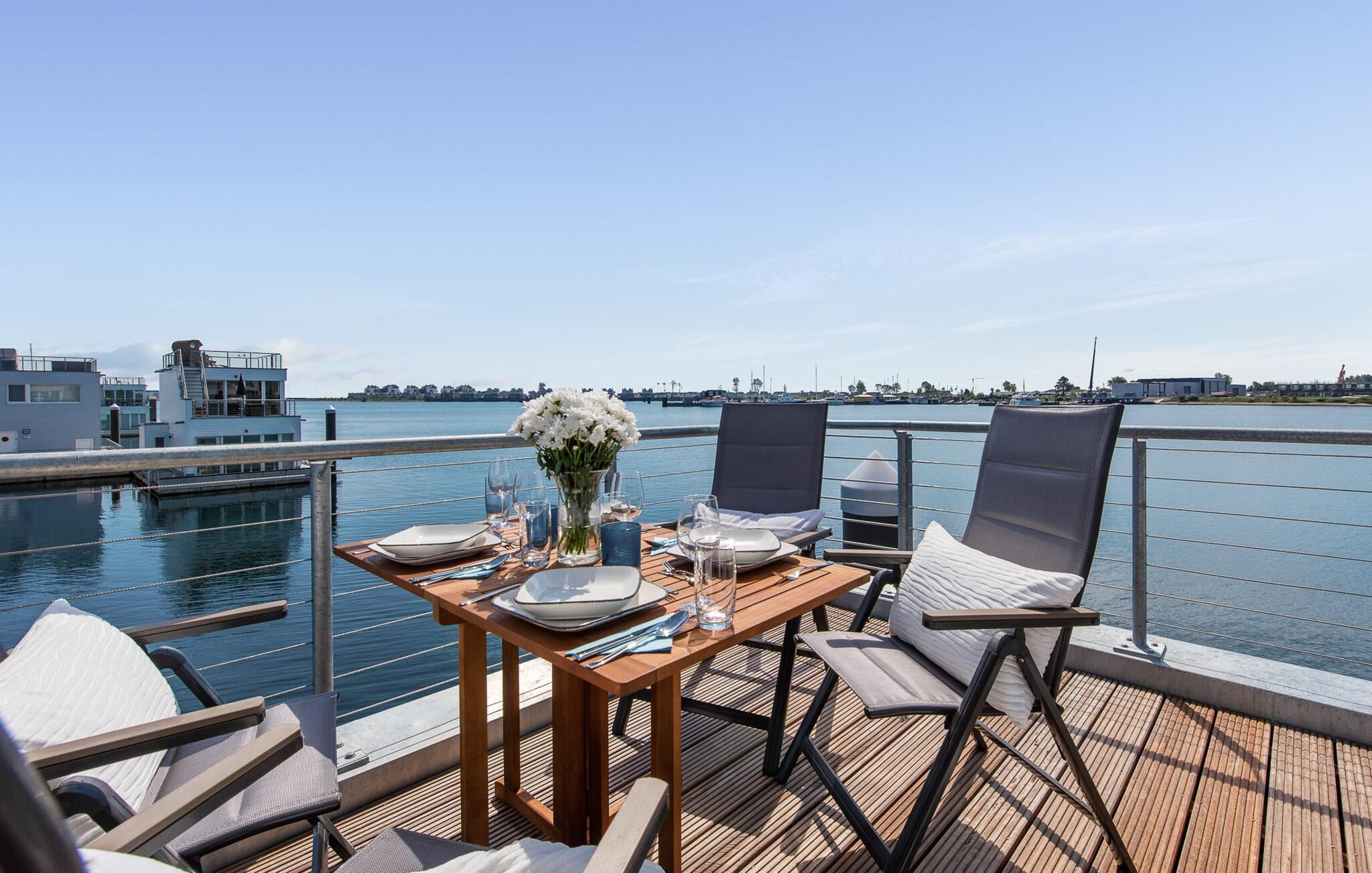 Öffnet dann die Tür zur angrenzenden Terrasse, schnuppert die Meeresluft und genießt den Blick auf den Hafen mit seinem bunten Treiben und die anderen schwimmenden Häuser. Die Terrasse bietet einen Elektrogrill und ist ein weiterer Platz für gesellige Stunden. Einem lauen Sommer Grillabend steht nichts mehr im Weg.