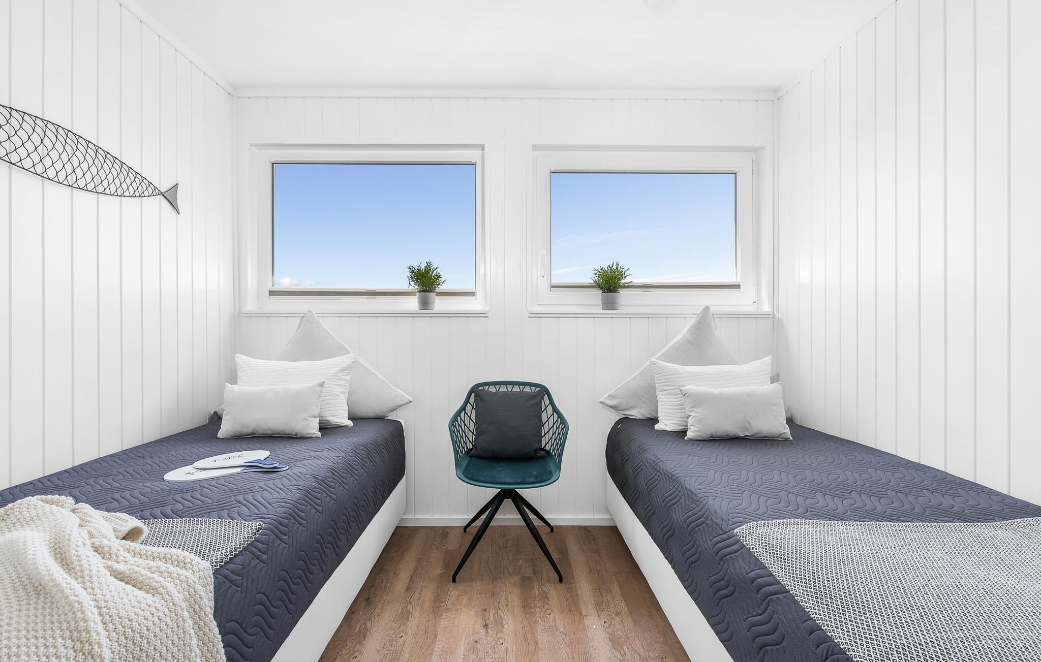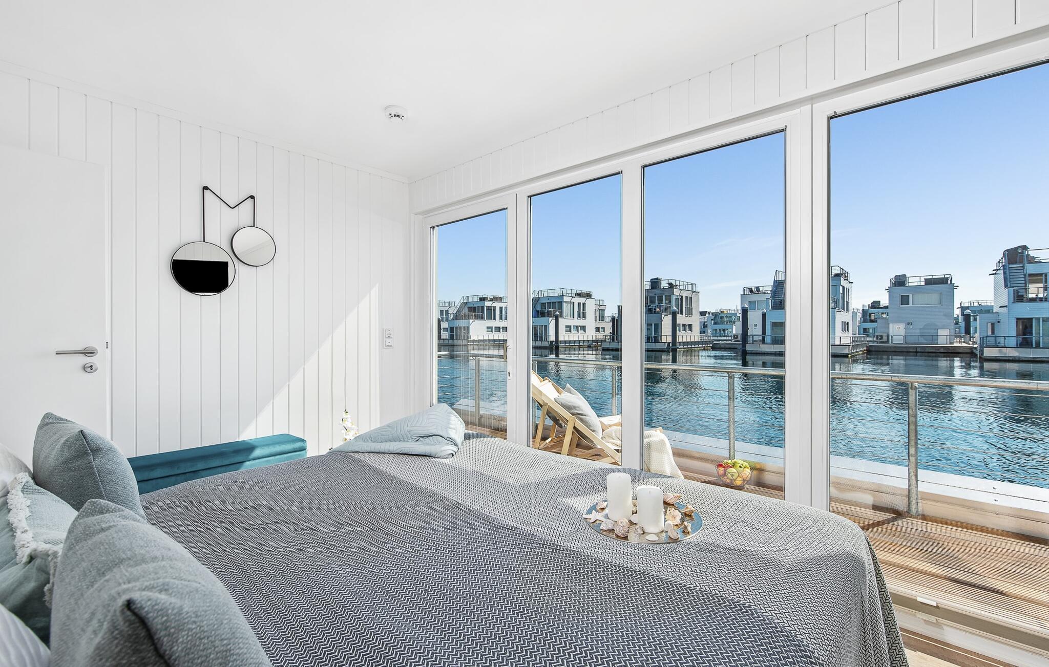 Im Erdgeschoss steht euch ein Schlafzimmer mit Doppelboxspringbett, bodentiefen Fenstern und dem Zutritt zu einer weiteren fast umlaufenden Terrasse zur Verfügung. Einschlafen und Aufwachen mit Hafenkino ist garantiert und der hier vorhandene Flatscreen-TV ist bei so viel Panoramaeindrücken wahrscheinlich überflüssig.