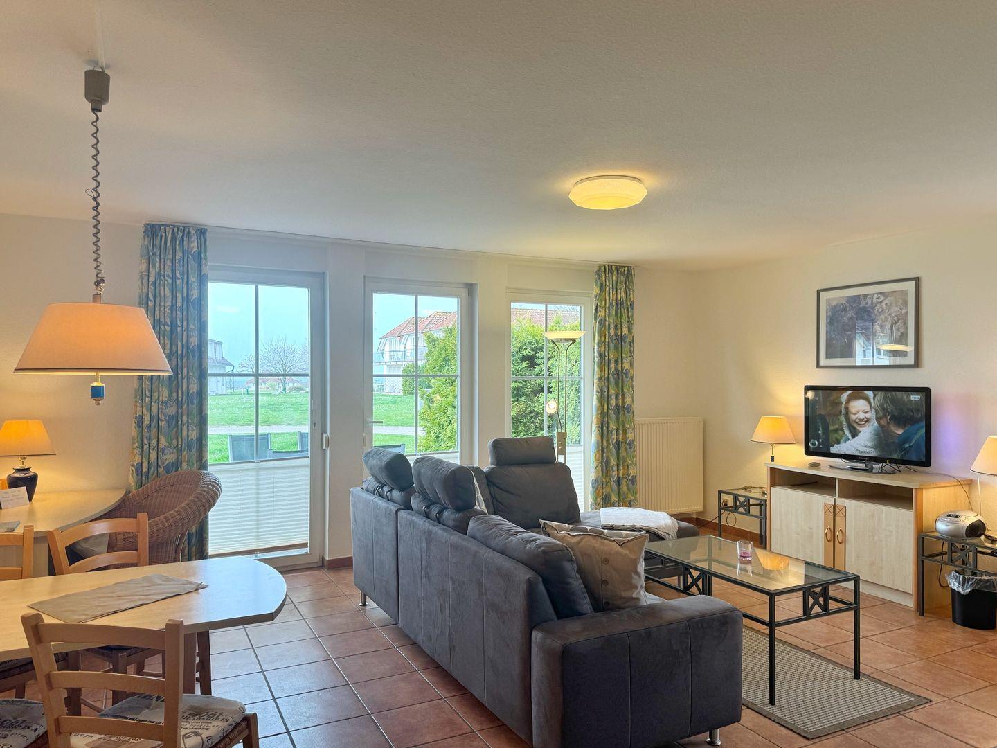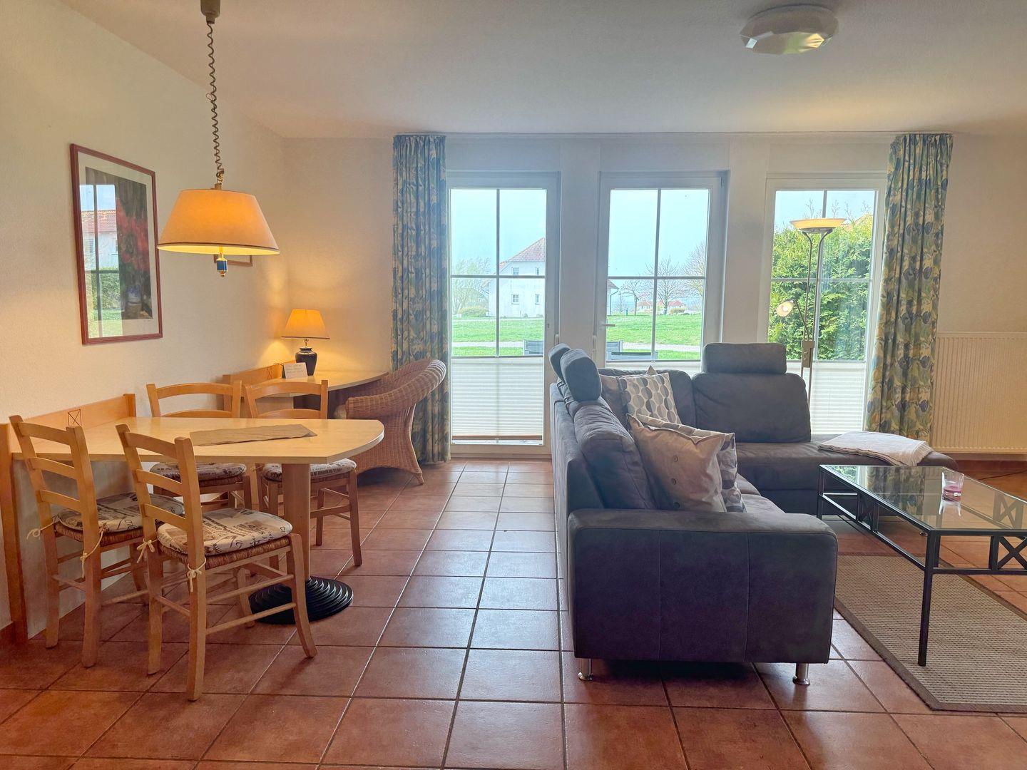 Moderne 2-Zimmer-Ferienwohnung mit Terrasse und Zugang zu Wellness und Pool in Neddesitz, ideal für erholsame Inselausflüge.
