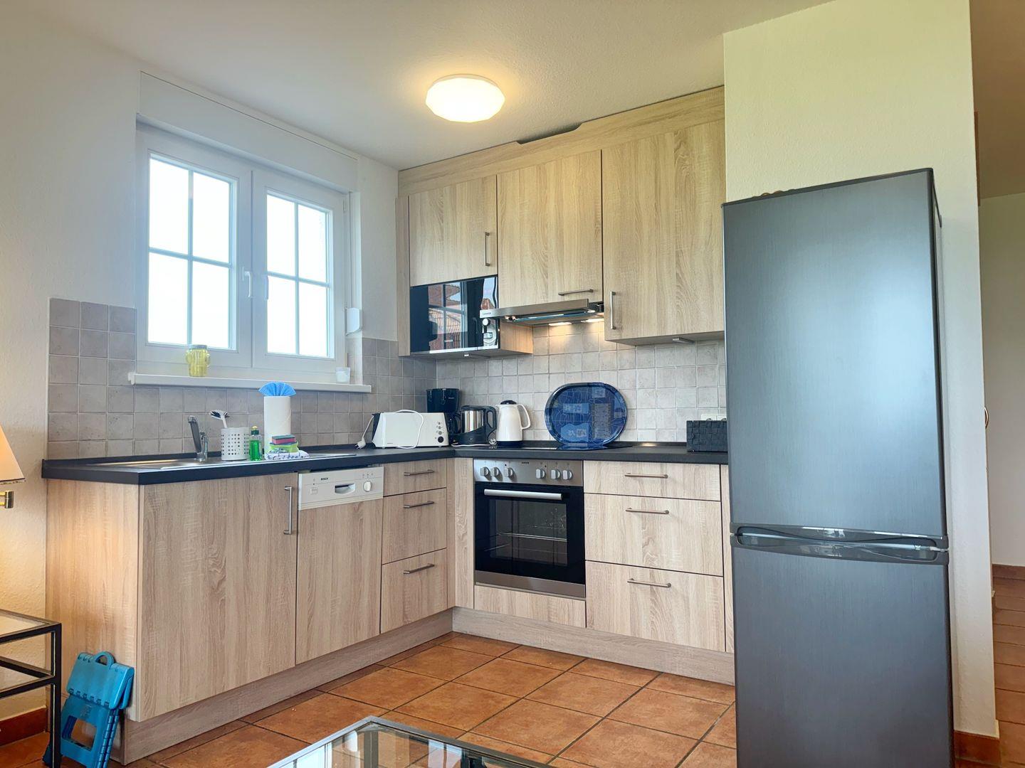 Im Schlafzimmer gibt es ein Doppelbett. Der großzügige und helle Wohnbereich bietet mit einem Schrank-Klapp-Bett Platz für zwei weitere Schlafgäste. Neben einer Couchecke gibt es einen Esstisch. Die offene Küche ist gut ausgestattet mit einem Herd, Backofen, einem Geschirrspüler, Kühlschrank mit Gefrierfach sowie eine Mikrowelle. Weitere Küchengeräte wie Kaffeemaschine, Toaster und Wasserkocher gehören natürlich zur Grundausstattung!