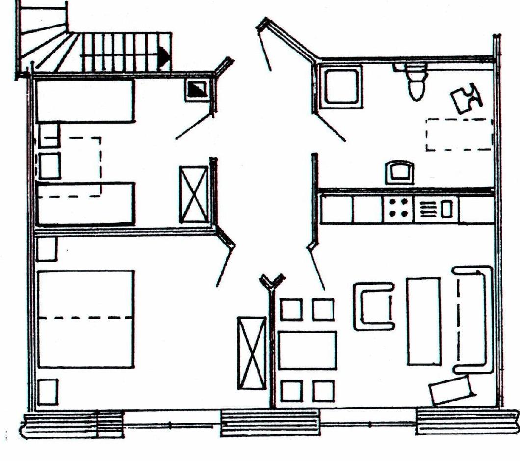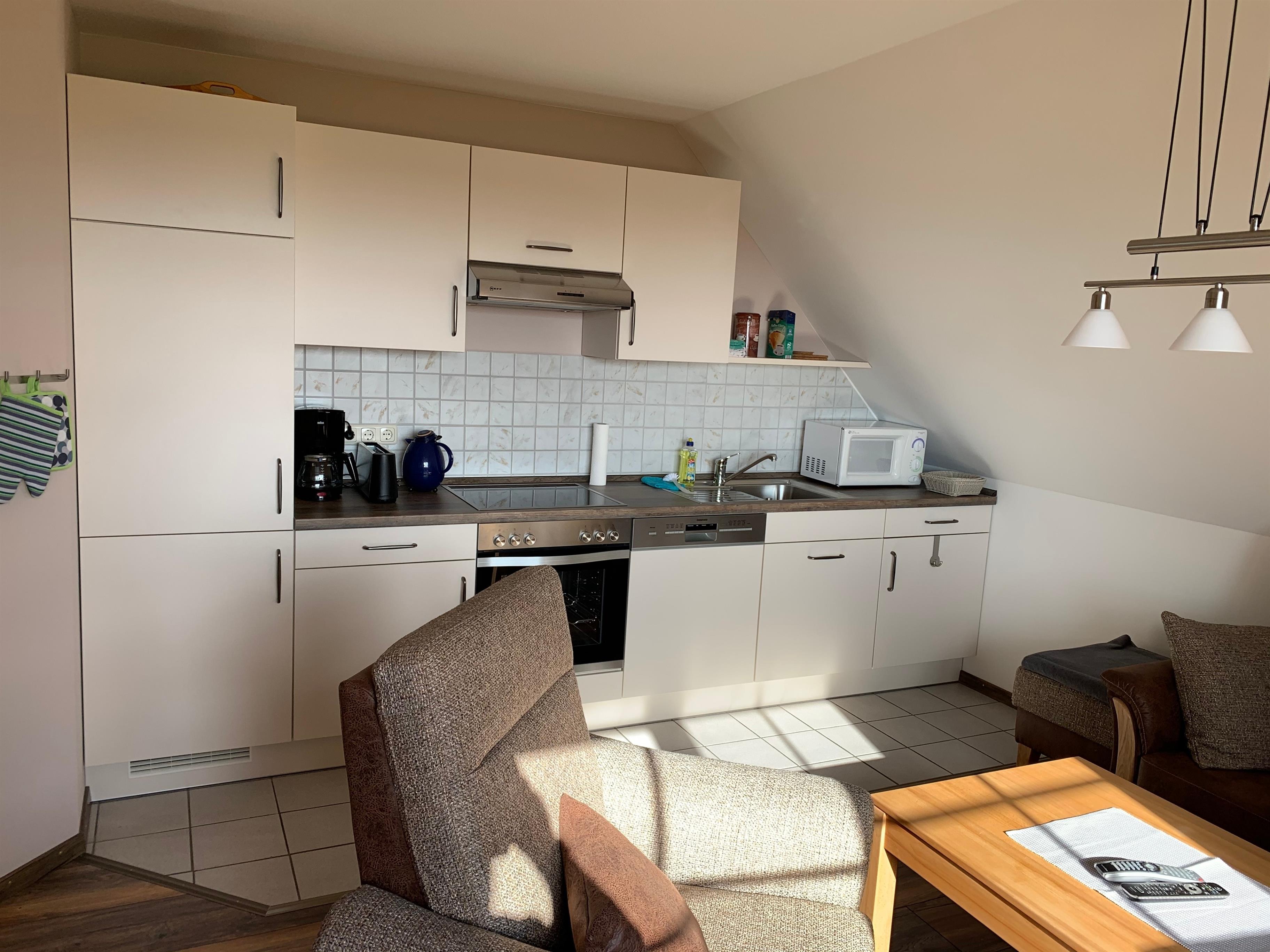 - einem Wohnraum mit SAT-Farb-TV und Radioanlage, einer Küchenzeile mit E-Herd mit Backofen, Spülmaschine sowie Kühlschrank mit Drei-Sterne-Gefrierfach