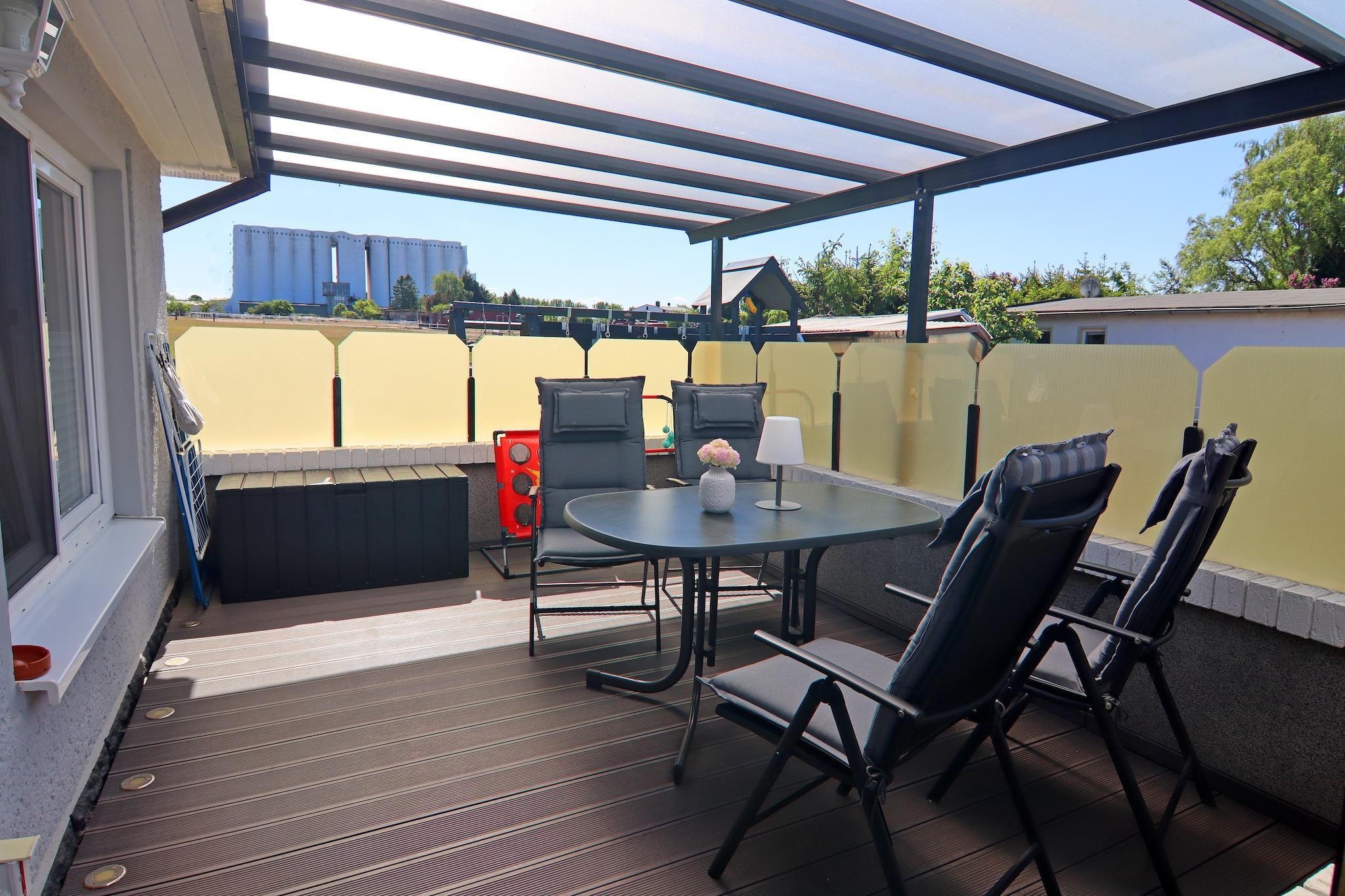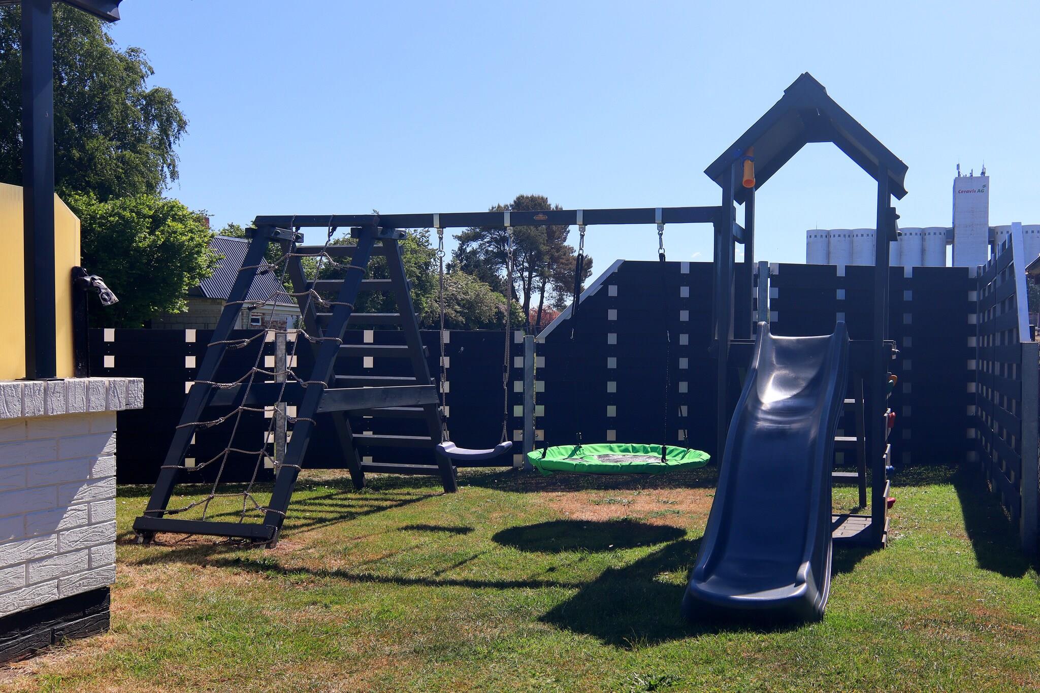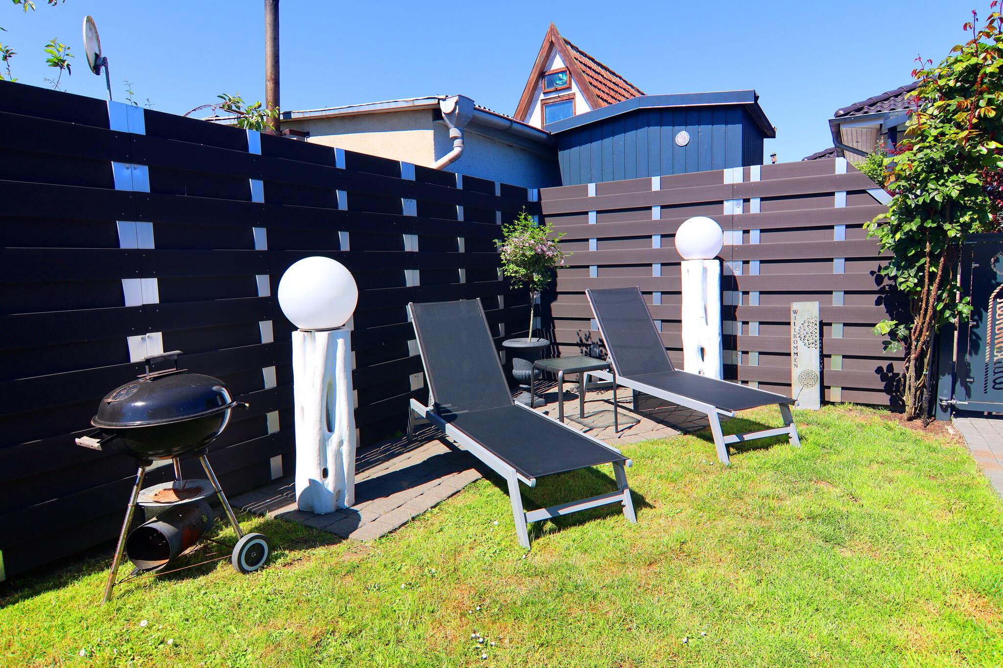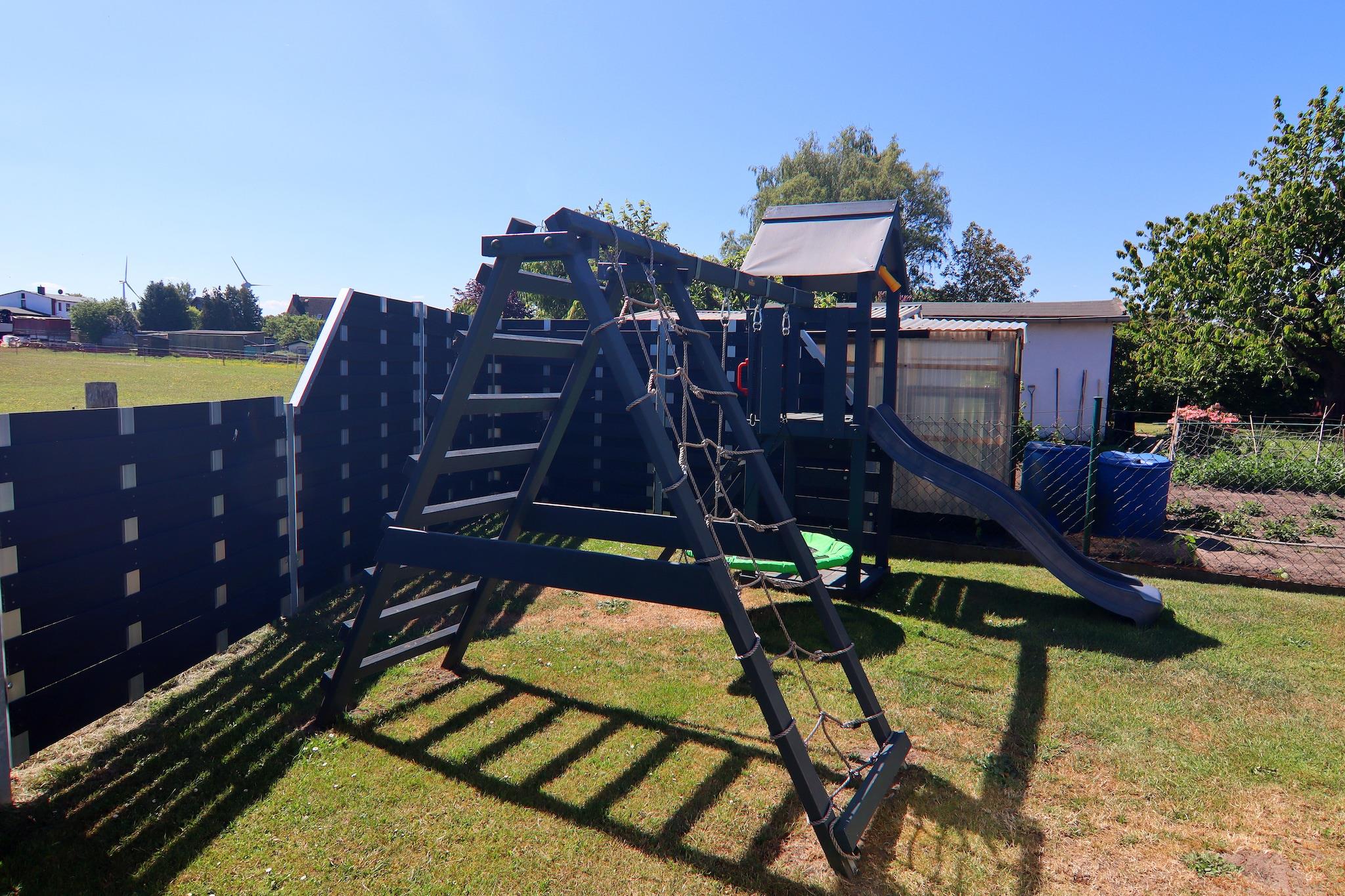 Gemütlicher Bungalow in Neubukow mit privater Terrasse, Garten und Spielgeräten für einen entspannten Ostseeurlaub.