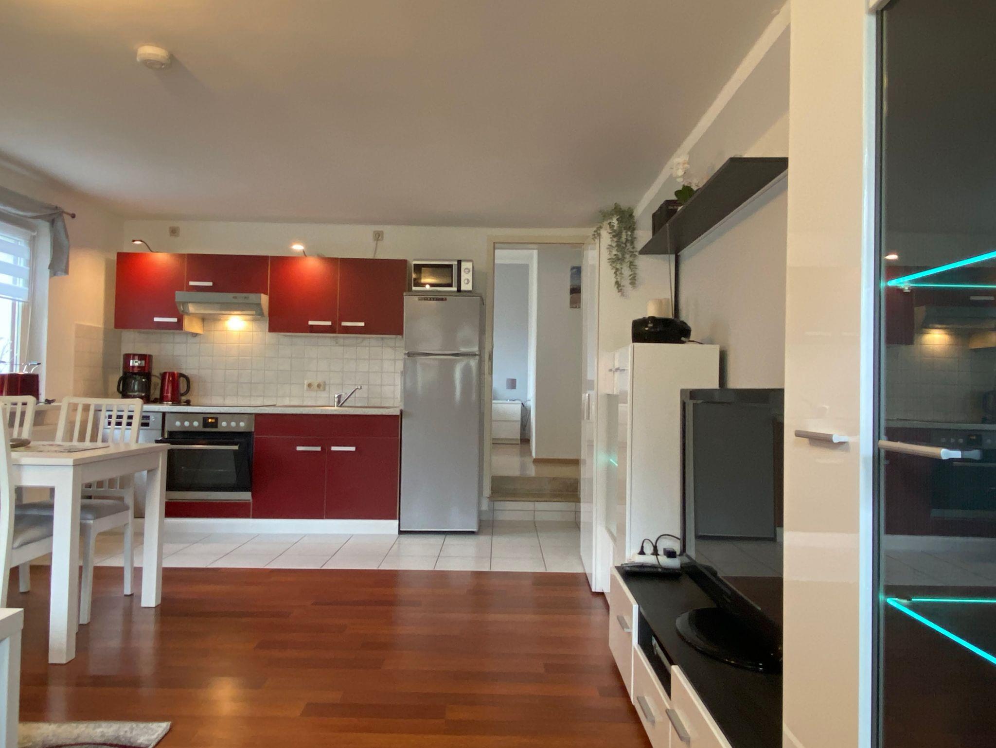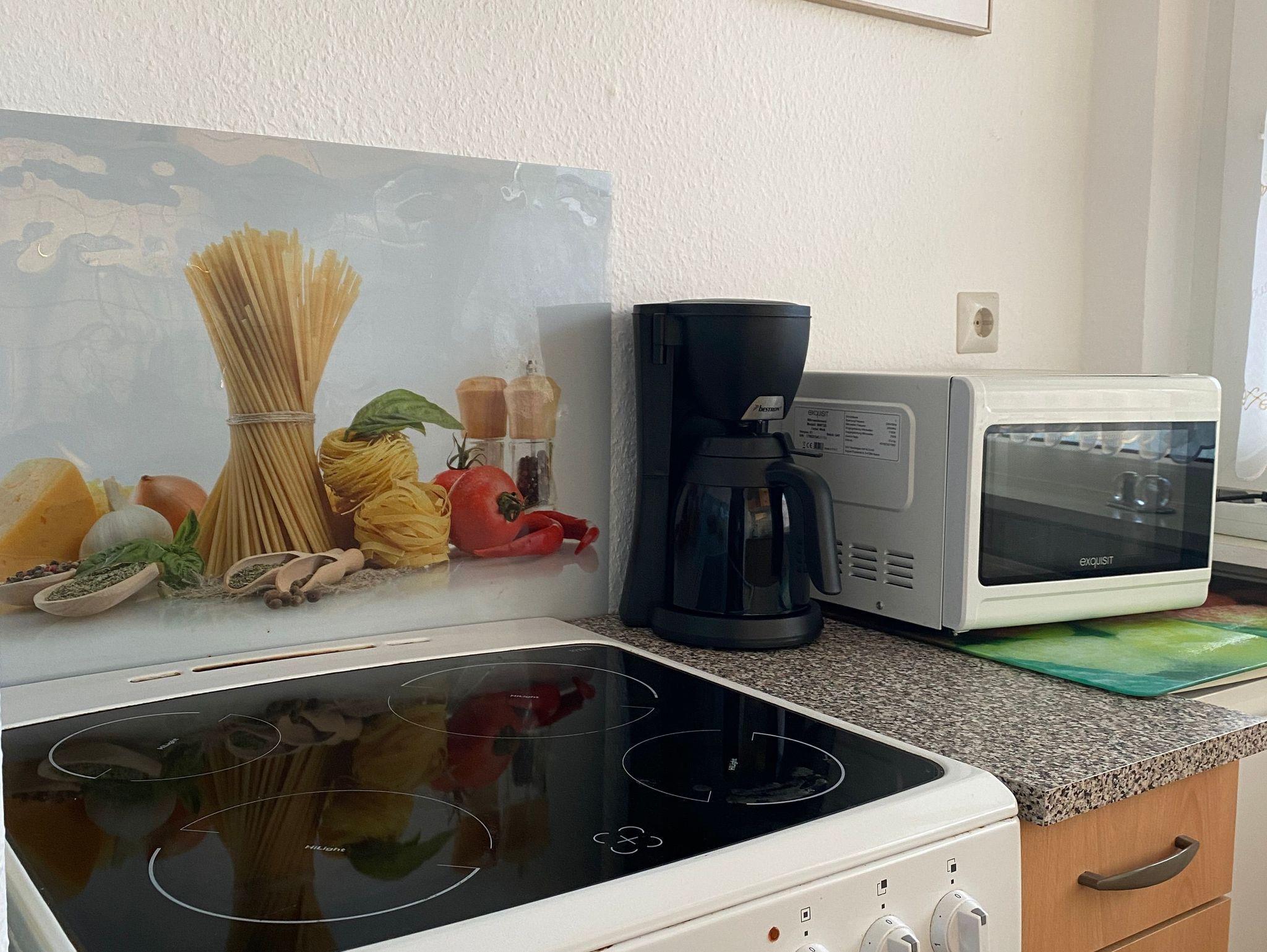 • Küchenzeile: 4er-Ceran-Herd, Backofen, Kühlschrank mit Gefrierfach, Spülmaschine, Wasserkocher, Kaffeemaschine, Toaster, Mikrowelle